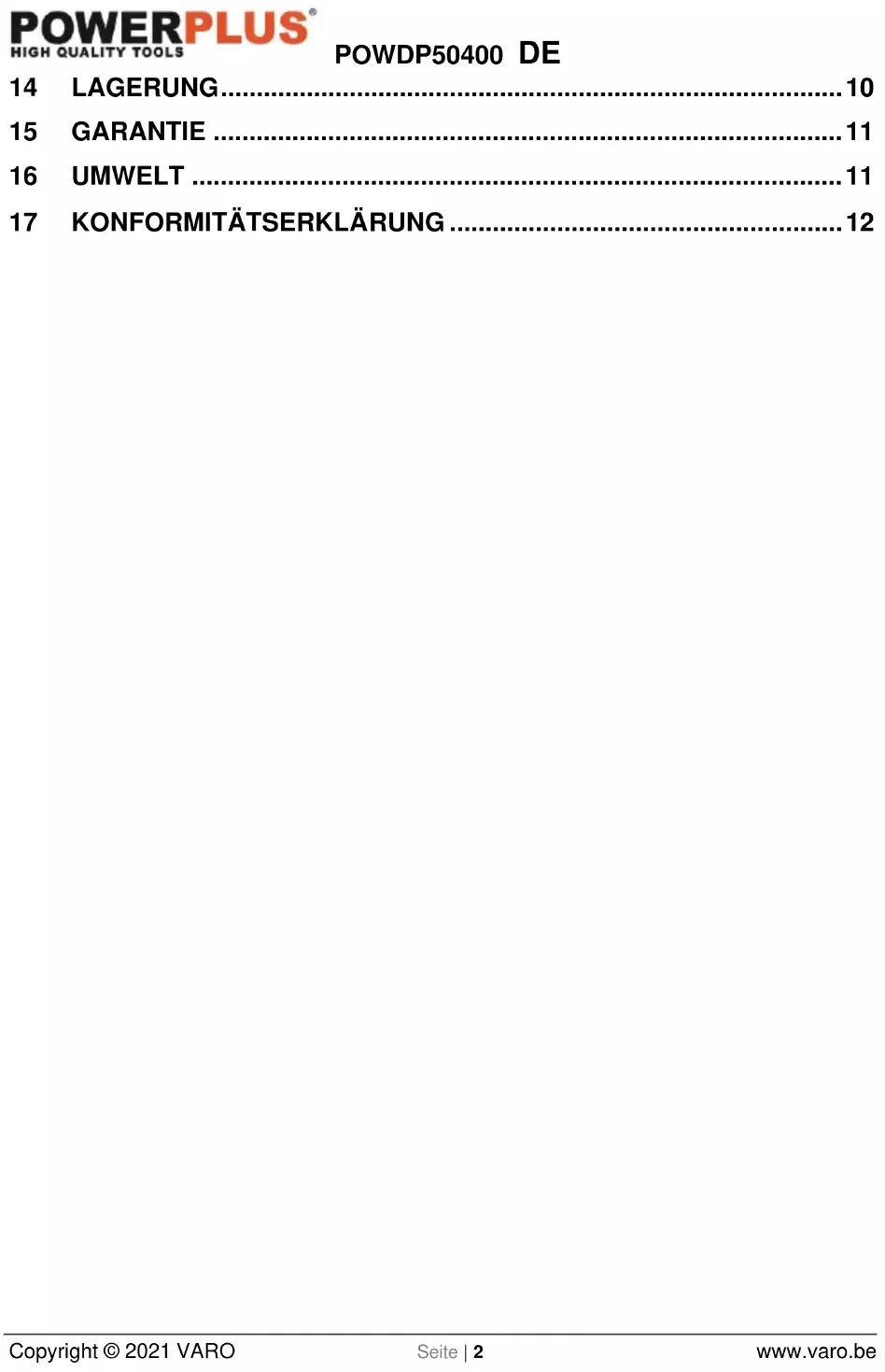 - Die Maschine nicht in Säcke bzw. Planen aus Nylon oder Kunststoff einschlagen, weil sich dort Feuchtigkeit ausbilden kann.POWDP50400 DE Copyright © 2021 VARO Seite | 11 www.varo.be 15 GARANTIE