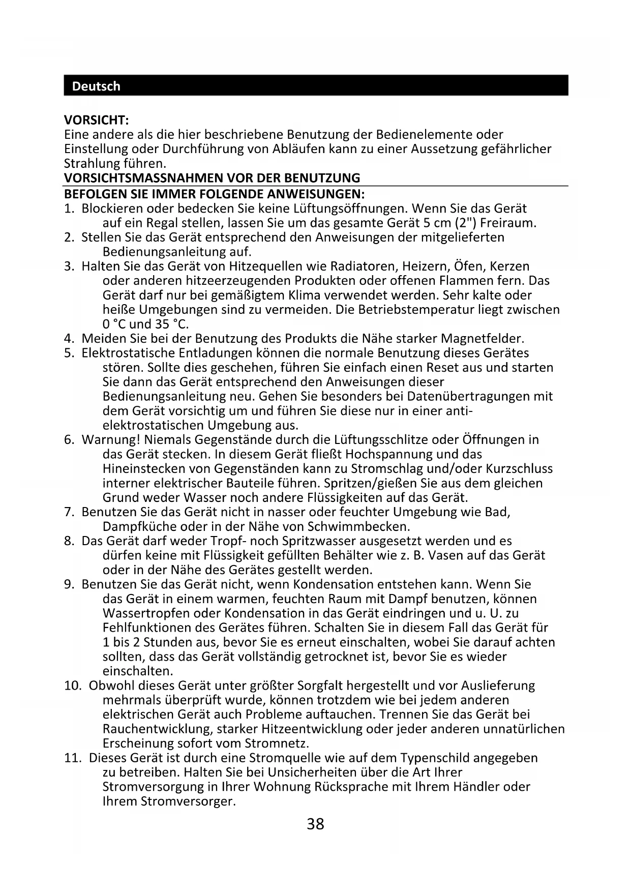 8. Das Gerät darf weder Tropf- noch Spritzwasser ausgesetzt werden und es