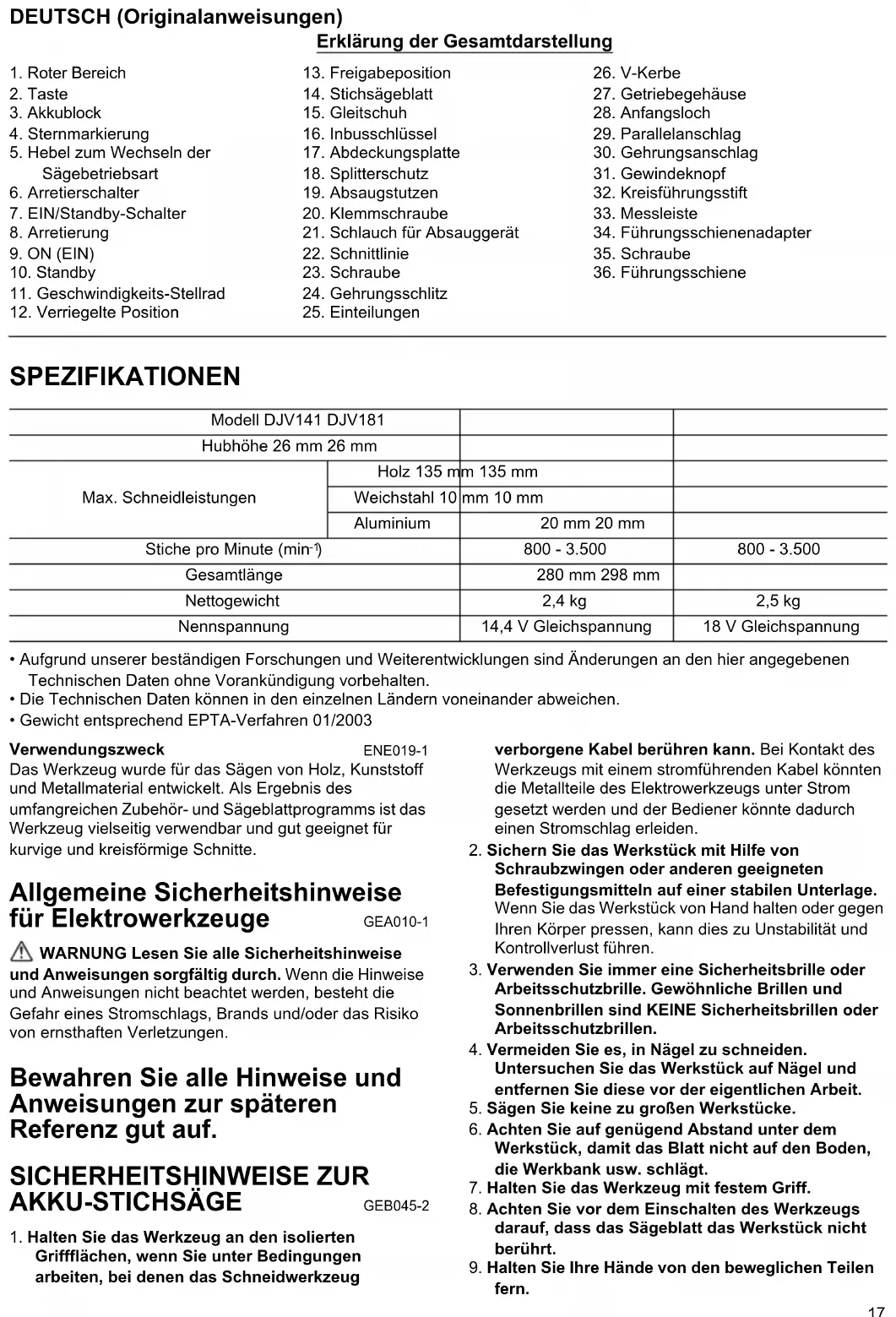 - Gewicht entsprechend EPTA-Verfahren 01/2003 Verwendungszweck ENE019-1 Das Werkzeug wurde für das Sägen von Holz, Kunststoff und Metallmaterial entwickelt. Als Ergebnis des umfangreichen Zubehör- und Sägeblattprogramms ist das Werkzeug vielseitig verwendbar und gut geeignet für kurvige und kreisförmige Schnitte. Allgemeine Sicherheitshinweise für Elektrowerkzeuge GEA010-1 WARNUNG Lesen Sie alle Sicherheitshinweise und Anweisungen sorgfältig durch. Wenn die Hinweise und Anweisungen nicht beachtet werden, besteht die Gefahr eines Stromschlags, Brands und/oder das Risiko von ernsthaften Verletzungen. Bewahren Sie alle Hinweise und Anweisungen zur späteren Referenz gut auf. SICHERHEITSHINWEISE ZUR AKKU-STICHSÄGE GEB045-2