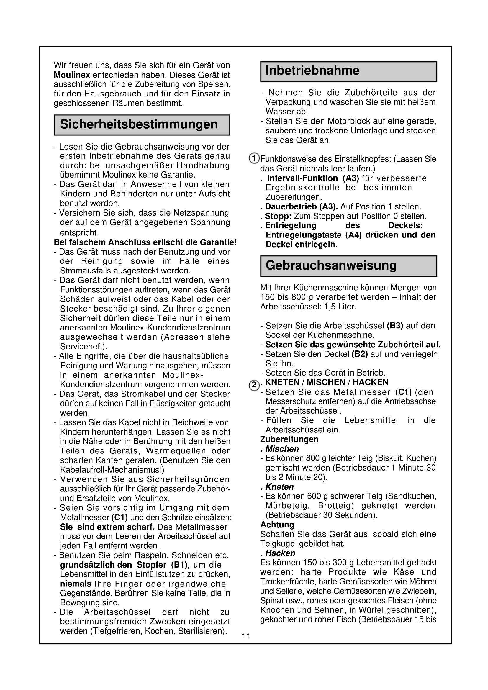Robot 1,5L Deauville.PM6.5 8/04/04, 16:04910 - Run the processor with the Spiral system for 10 seconds, then pour in the flour (200 g) and let the machine run until you obtain a smooth batter. Leave to stand for 1 hour. SAUCES Mayonnaise - Into the bowl, fitted with the emulsifier, put 1 egg yolk, 1 dessert spoon of mustard, 1 teaspoon of vinegar, salt and pepper. - Run the processor for 10 seconds. Pour 250 ml of oil in a thin stream through the feed tube with the processor running for 1 min 30. Tartare sauce - Into the bowl, fitted with the stainless steel blade, put the mayonnaise and chop in 100 g of gherkins, a small onion and 1 bunch of herbs (chervil, chives, parsley and tarragon) and 2 dessert spoons of capers, running the processor for 40 seconds. Cocktail Sauce - In the bowl, fitted with the emulsifier, mix into the mayonnaise 1 dessert spoon of tube tomato purée, a few drops of hot red pimento sauce, a dash of Worcester sauce and run the processor for 20 seconds. SOUP Cream of leek soup (serves 4) - Peel 150 g of leeks and cut then into chunks. Place the cut leeks in the bowl fitted with the stainless steel blade and chop for 20 seconds. Melt 20 g of butter in a saucepan and add the chopped leeks. Stir, cover and braise for 15 minutes. - Peel 150 g of potatoes. Cut into large chunks and add to the leeks. Add salt, pepper and nutmeg, then add 1/2 litre of water and 100 ml of milk. - Leave to cook for 1/2 h. After cooking, pour into the bowl, fitted with the stainless steel blade, then liquidise for 40 seconds with the Spiral system. VEGETABLES Gratin dauphinois (serves 4) - In the processor, fitted with the vegetable slicer and the blade (C), grate 70 g of Gruyère cheese. Put to one side. Peel 700 g of potatoes and slice them into the processor bowl, fitted with the vegetable cutter and the blade (H). - Arrange the slices of potato in a gratin dish, which has been buttered and rubbed with a clove of garlic. - Into the bowl, fitted with the knife, put 2 egg yolks, 200 ml of milk, 150 ml of single cream, salt, pepper and grated nutmeg. Liquidise for 1 minute. - Pour this mixture over the potatoes. Sprinkle with the grated cheese and a few knobs of but- ter. - Put into the oven at 220°C (425°F/ gas mark 7) for 1 h. COCKTAIL Raspberry milk shake (serves 2) - 1/2 litre of full cream milk, 150 g of raspberries, 1/2 yoghurt, 30 g of granulated sugar. - Place all the ingredients in the bowl fitted with the blender knife, put the Spiral System in place and lock the cover. - Mix for 20 seconds. DESSERTS Yoghurt gâteau (serves 6 to 8) - 1 pot of natural yoghurt (use as measure), 2 pots of granulated sugar, 3 pots of flour, 1/2 pot of oil, 3 eggs, 1 sachet of yeast. - Put all the ingredients into the bowl fitted with the knife. - Run the processor for 2 minutes. The mixture should be nice and smooth. - Pour the mixture into a sandwich tin and put in the oven at 200°C (400°F/gas mark 6) for 50 minutes. Pound cake (serves 4 to 6) - Into the bowl, fitted with the stainless steel blade, put 150 g of flour, 1/2 sachet of yeast, 150 g of sugar, 150 g of butter and 3 eggs. - Run the processor for 2 minutes. Pour into a buttered and floured cake tin. - Cook in the oven at 200°C (400°F/gas mark 6) for 55 minutes. Crème chantilly (serves 6 to 8) - 250 ml of well chilled whipping cream, 50 g of icing sugar. - Fit the bowl with the emulsifier, put in the cream and the icing sugar. Run the processor for 1 minute. Whipped egg whites - Into the bowl, fitted with the emulsifier, put 2 to 4 egg whites and a pinch of salt. Lock the cover. - Run the processor until the whites stand in peaks. Remember to leave the pusher out of the feed tube so that the egg whites can be aerated. Robot 1,5L Deauville.PM6.5 8/04/04, 16:041011 Wir freuen uns, dass Sie sich für ein Gerät von Moulinex entschieden haben. Dieses Gerät ist ausschließlich für die Zubereitung von Speisen, für den Hausgebrauch und für den Einsatz in geschlossenen Räumen bestimmt. Sicherheitsbestimmungen - Lesen Sie die Gebrauchsanweisung vor der ersten Inbetriebnahme des Geräts genau durch: bei unsachgemäßer Handhabung übernimmt Moulinex keine Garantie. - Das Gerät darf in Anwesenheit von kleinen Kindern und Behinderten nur unter Aufsicht benutzt werden. - Versichern Sie sich, dass die Netzspannung der auf dem Gerät angegebenen Spannung entspricht. Bei falschem Anschluss erlischt die Garantie! - Das Gerät muss nach der Benutzung und vor der Reinigung sowie im Falle eines Stromausfalls ausgesteckt werden. - Das Gerät darf nicht benutzt werden, wenn Funktionsstörungen auftreten, wenn das Gerät Schäden aufweist oder das Kabel oder der Stecker beschädigt sind. Zu Ihrer eigenen Sicherheit dürfen diese Teile nur in einem anerkannten Moulinex-Kundendienstzentrum ausgewechselt werden (Adressen siehe Serviceheft). - Alle Eingriffe, die über die haushaltsübliche Reinigung und Wartung hinausgehen, müssen in einem anerkannten Moulinex- Kundendienstzentrum vorgenommen werden. - Das Gerät, das Stromkabel und der Stecker dürfen auf keinen Fall in Flüssigkeiten getaucht werden. - Lassen Sie das Kabel nicht in Reichweite von Kindern herunterhängen. Lassen Sie es nicht in die Nähe oder in Berührung mit den heißen Teilen des Geräts, Wärmequellen oder scharfen Kanten geraten. (Benutzen Sie den Kabelaufroll-Mechanismus!) - Verwenden Sie aus Sicherheitsgründen ausschließlich für Ihr Gerät passende Zubehör- und Ersatzteile von Moulinex. - Seien Sie vorsichtig im Umgang mit dem Metallmesser (C1) und den Schnitzeleinsätzen: Sie sind extrem scharf. Das Metallmesser muss vor dem Leeren der Arbeitsschüssel auf jeden Fall entfernt werden. - Benutzen Sie beim Raspeln, Schneiden etc. grundsätzlich den Stopfer (B1), um die Lebensmittel in den Einfüllstutzen zu drücken, niemals Ihre Finger oder irgendwelche Gegenstände. Berühren Sie keine Teile, die in Bewegung sind. - Die Arbeitsschüssel darf nicht zu bestimmungsfremden Zwecken 