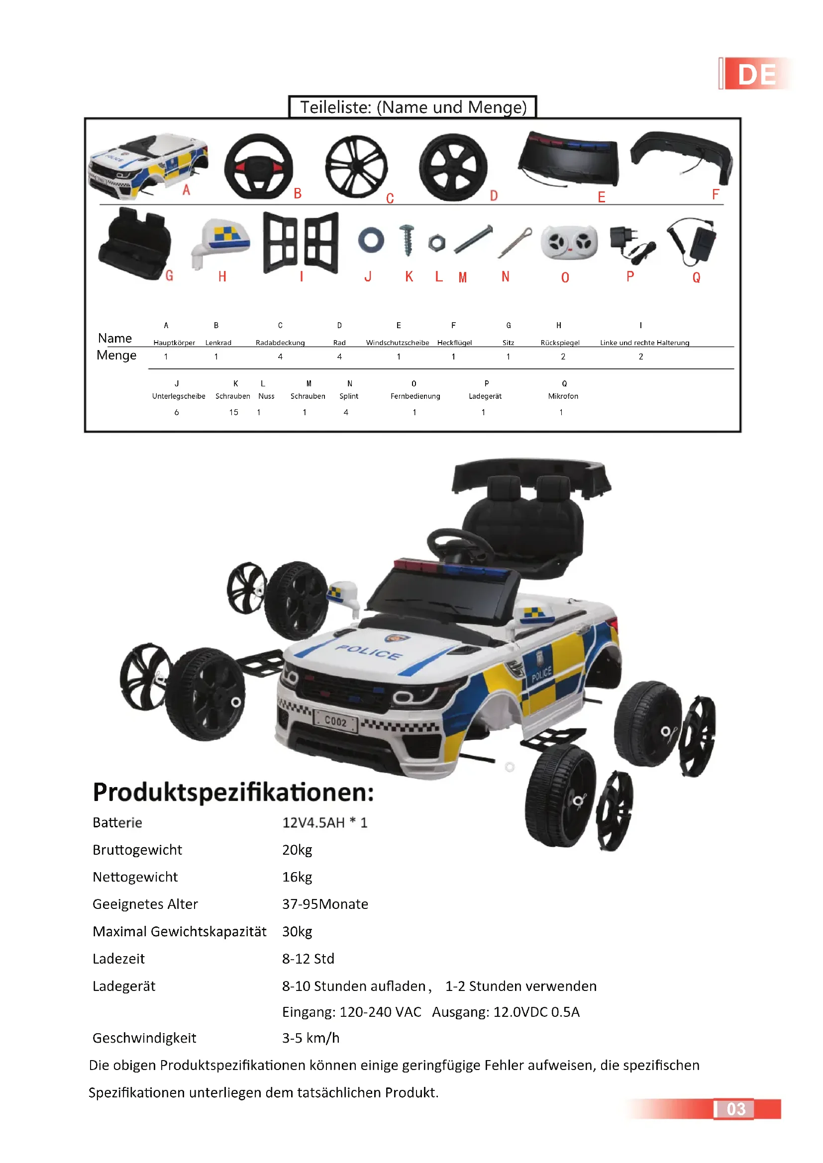 VORSICHTSMAßNAHMEN................................................................................................................ 09 LADEANLEITUNG............................................................................................................................. 10 WARTUNG UND SERVICE................................................................................................................. 11 0112V4.5AH * 1 20kg 16kg 37-95Monate 30kg 8-12 Std8-10 Stunden aufladen, 1-2 Stunden verwendenEingang: 120-240 VAC Ausgang: 12.0VDC 0.5A3-5 km/hDie obigen Produktspezifikaonen können einige geringfügige Fehler aufweisen, die spezifischen Spezifikaonen unterliegen dem tatsächlichen Produkt. Produktspezifikaonen: Baerie Bruogewicht Neogewicht Geeignetes Alter Maximal Gewichtskapazität Ladezeit LadegerätGeschwindigkeit