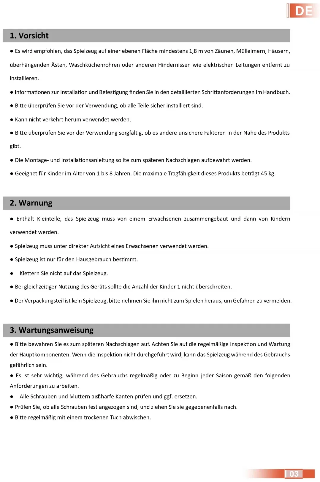 24● Es wird empfohlen, das Spielzeug auf einer ebenen Fläche mindestens 1,8 m von Zäunen, Mülleimern, Häusern, überhängenden Ästen, Waschküchenrohren oder anderen Hindernissen wie elektrischen Leitungen enernt zu installieren. ● Informaonen zur Installaon und Befesgung finden Sie in den detaillierten Schrianforderungen im Handbuch. ● Bie überprüfen Sie vor der Verwendung, ob alle Teile sicher installiert sind. ● Kann nicht verkehrt herum verwendet werden. ● Bie überprüfen Sie vor der Verwendung sorgfälg, ob es andere unsichere Faktoren in der Nähe des Pr odukts gibt. ● Die Montage- und Installaonsanleitung sollte zum späteren Nachschlagen auewahrt werden. ● Geeignet für Kinder im Alter von 1 bis 8 Jahren. Die maximale Tragfähigkeit dieses Produkts beträgt 45 kg. ● Enthält Kleinteile, das Spielzeug muss von einem Erwachsenen zusammengebaut und dann von Kindern verwendet werden. ● Spielzeug muss unter direkter Aufsicht eines Erwachsenen verwendet werden. ● Spielzeug ist nur für den Hausgebrauch besmmt. ● Kleern Sie nicht auf das Spielzeug. ● Bei gleichzeiger Nutzung des Geräts sollte die An zahl der Kinder 1 nicht überschreiten. ● Der Verpackungsteil ist kein Spielzeug, bie nehmen Sie ihn nicht zum Spielen heraus, um Gefahren zu vermeiden. ● Bie bewahren Sie es zum späteren Nachschlagen auf. Achten Sie auf die regelmäßige Inspekon und Wartung der Hauptkomponenten. Wenn die Inspekon nicht durchgeführt wird, kann das Spielzeug während des Gebrauchs gefährlich sein. ● Es ist sehr wichg, während des Gebrauchs regelmäßig oder zu Beginn jeder Saison gemäß den folgenden Anforderungen zu arbeiten. ● Alle Schrauben und Muern auf scharfe Kanten prüfen und ggf. ersetzen. ● Prüfen Sie, ob alle Schrauben fest angezogen sind, und ziehen Sie sie gegebenenfalls nach. ● Bie regelmäßig mit einem trockenen Tuch abwischen.