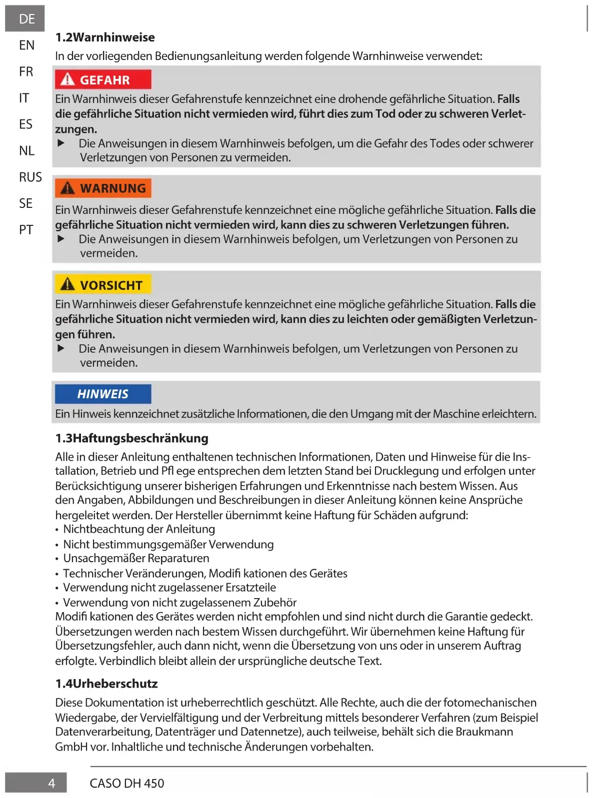 RUS CASO DH 450 2 Sicherheit In diesem Kapitel erhalten Sie wichtige Sicherheitshinweise im Umgang mit dem Gerät. Dieses Gerät entspricht den vorgeschriebenen Sicherheitsbestimmungen. Ein unsachgemäßer Gebrauch kann jedoch zu Personen- und Sachschäden führen.