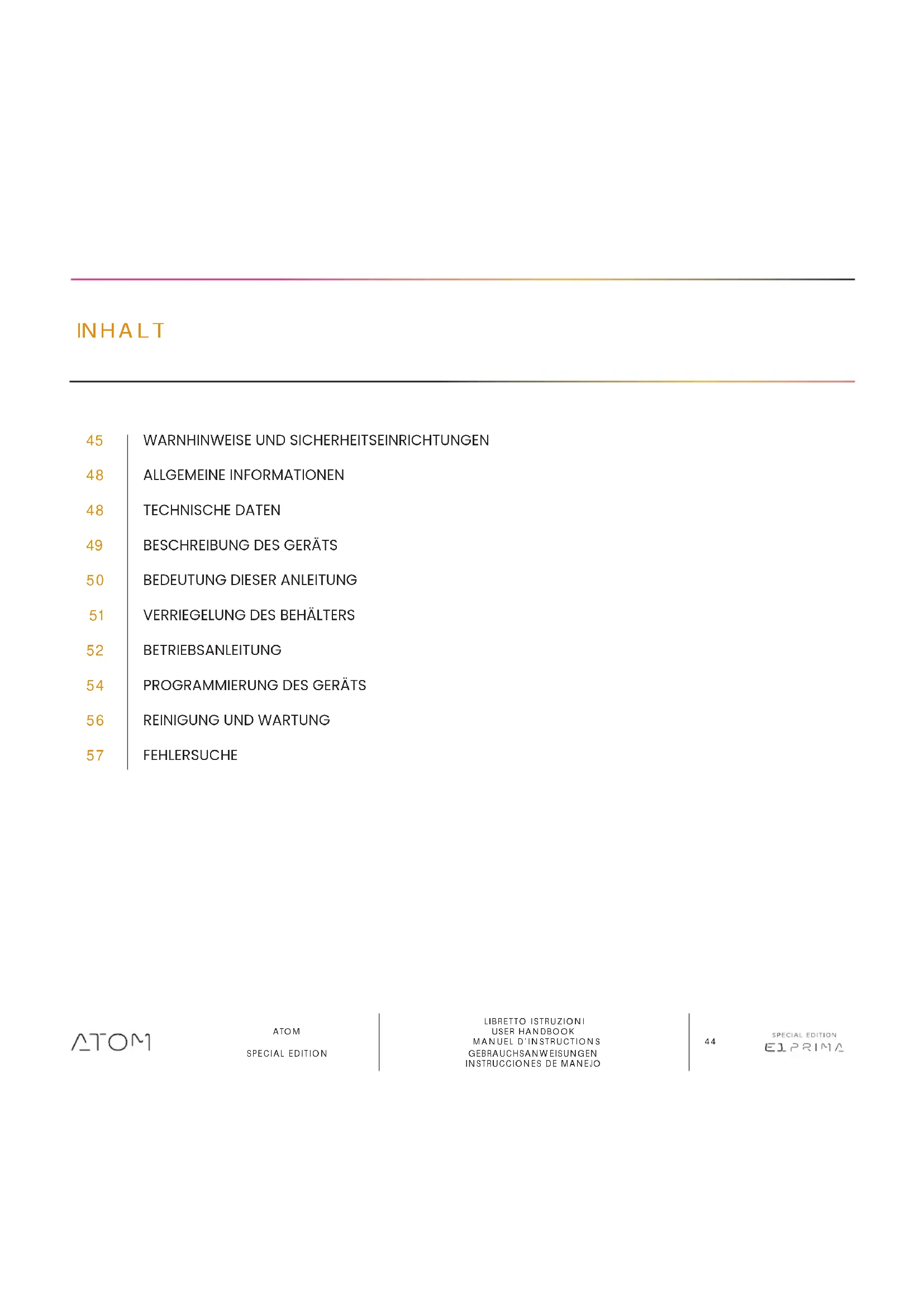 AUFBEWAHRUNG DES HANDBUCHS Diese Anleitung muss dem Bediener und/oder dem Wartungstechniker jederzeit zur Verfügung stehen, da sie über den korrekten Betrieb und über eventuelle Rest- risiken informiert sein müs- sen. Die Anleitung muss an einem trockenen, sauberen und vor Hitze geschützten Ort aufbewahrt werden. Die Anleitung ist so aufzu- bewahren, dass ihr Inhalt weder ganz noch teilwei- se geschädigt wird. Es ist untersagt, Seiten dieses Handbuchs zu entfernen, herauszureißen oder umzu- schreiben. Bei Verlust der Anleitung oder wenn zusätzliche Infor- mationen benötigt werden, bitte Kontakt mit dem Ge- bietshändler oder mit dem Hersteller aufnehmen.ATOM SPECIAL EDITION LIBRETTO ISTRUZIONI USER HANDBOOK