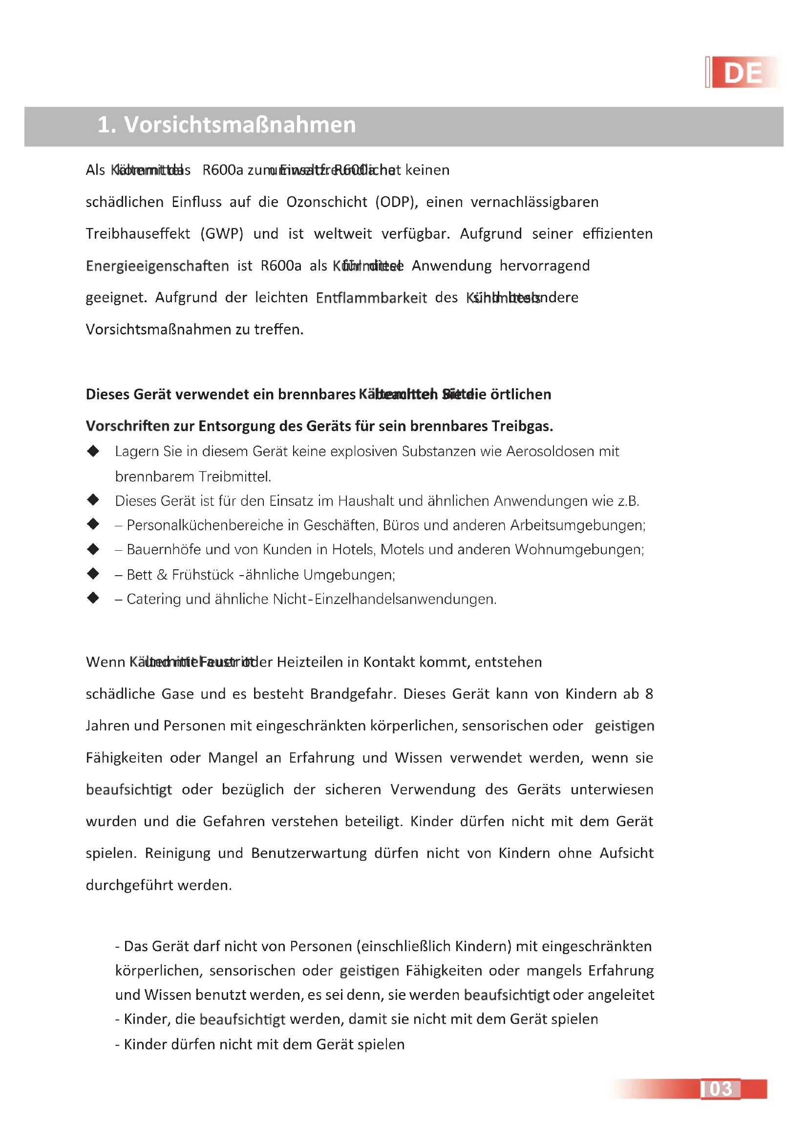 Das Gerät ist nur für die Verwendung mit R600a-Gas als vorgesehenem ausgelegt.