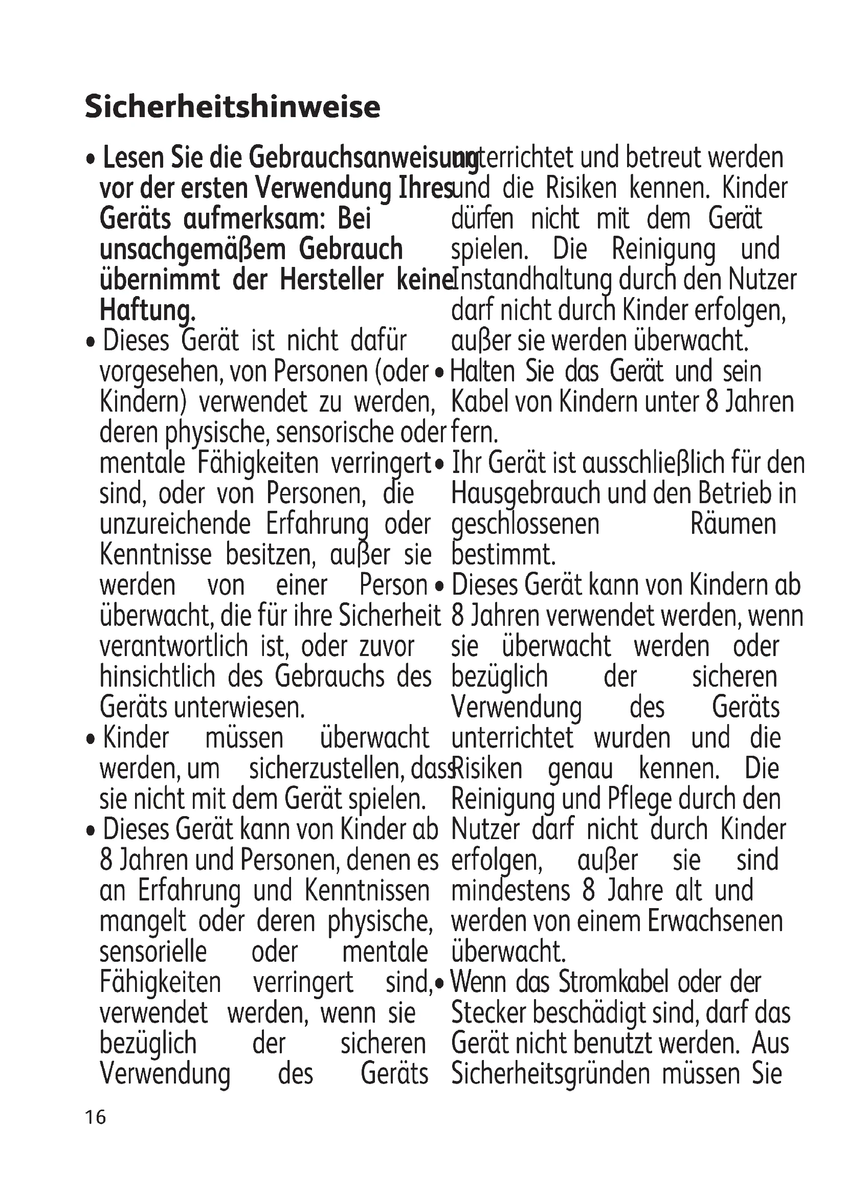 - Dieses Gerät kann von Kindern ab 8 Jahren verwendet werden, wenn sie überwacht werden oder bezüglich der sicheren Verwendung des Geräts unterrichtet wurden und die Risiken genau kennen. Die Reinigung und Pflege durch den Nutzer darf nicht durch Kinder erfolgen, außer sie sind mindestens 8 Jahre alt und werden von einem Erwachsenen überwacht.