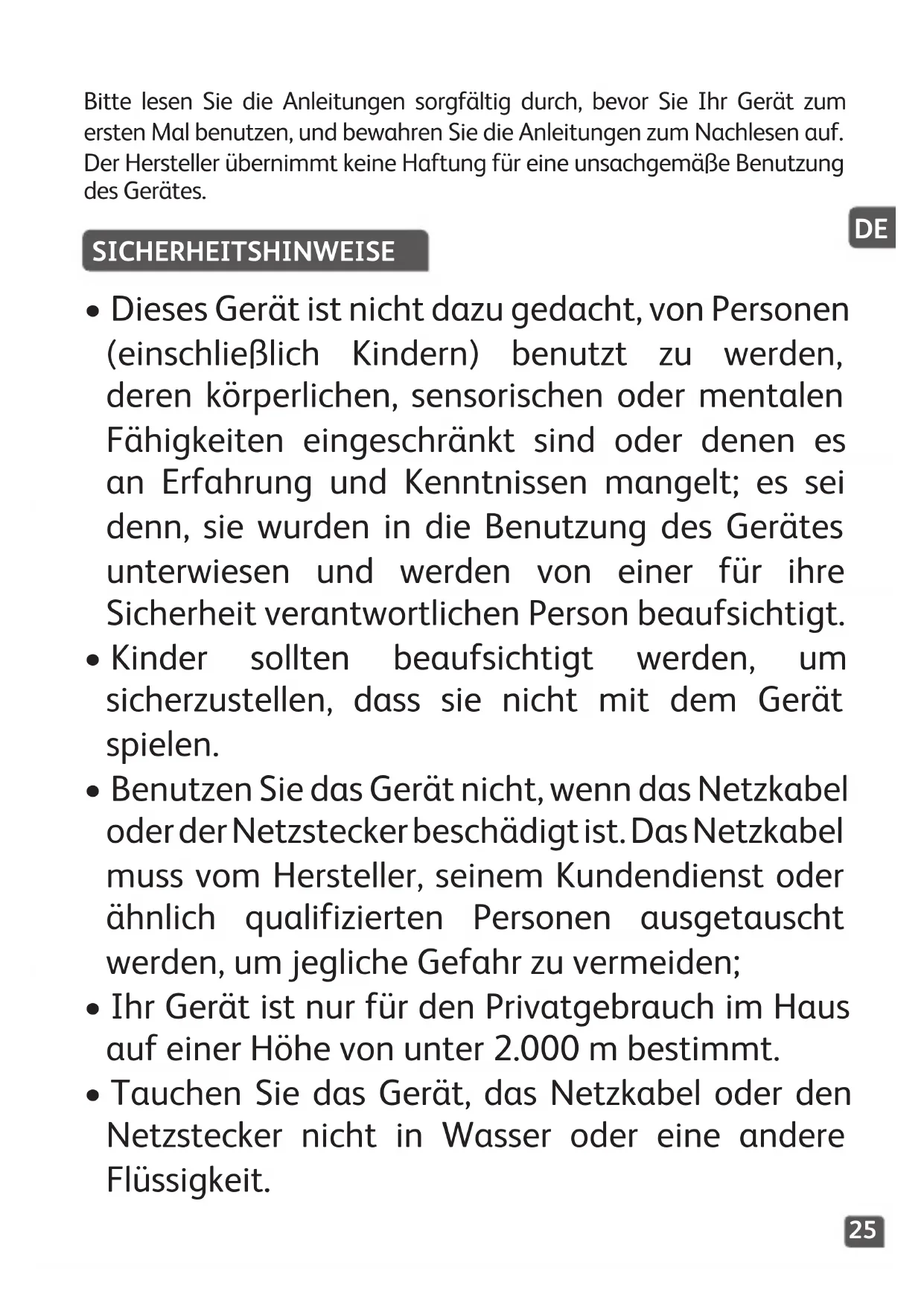 - Dieses Gerät ist nicht dazu gedacht, von Personen (einschließlich Kindern) benutzt zu werden, deren körperlichen, sensorischen oder mentalen Fähigkeiten eingeschränkt sind oder denen es an Erfahrung und Kenntnissen mangelt; es sei denn, sie wurden in die Benutzung des Gerätes unterwiesen und werden von einer für ihre Sicherheit verantwortlichen Person beaufsichtigt.