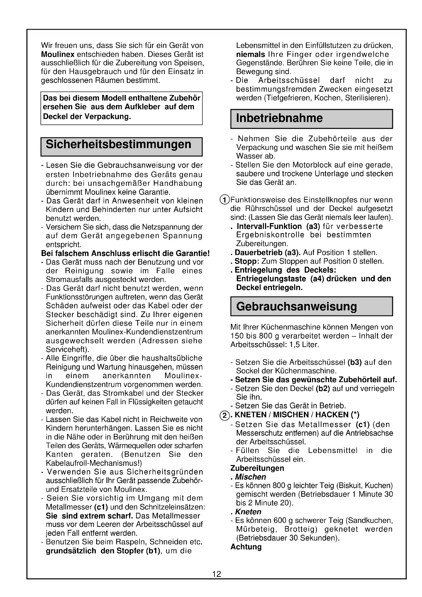 pot sunflower oil, 3 eggs, 3 tsp baking powder. delicio EU11.PM6 20/02/06, 15:371112 Lebensmittel in den Einfüllstutzen zu drücken, niemals Ihre Finger oder irgendwelche Gegenstände. Berühren Sie keine Teile, die in Bewegung sind. - Die Arbeitsschüssel darf nicht zu bestimmungsfremden Zwecken eingesetzt werden (Tiefgefrieren, Kochen, Sterilisieren). Inbetriebnahme - Nehmen Sie die Zubehörteile aus der Verpackung und waschen Sie sie mit heißem Wasser ab. - Stellen Sie den Motorblock auf eine gerade, saubere und trockene Unterlage und stecken Sie das Gerät an. Funktionsweise des Einstellknopfes nur wenn die Rührschüssel und der Deckel aufgesetzt sind: (Lassen Sie das Gerät niemals leer laufen). . Intervall-Funktion (a3) für verbesserte Ergebniskontrolle bei bestimmten Zubereitungen. . Dauerbetrieb (a3). Auf Position 1 stellen. . Stopp: Zum Stoppen auf Position 0 stellen. . Entriegelung des Deckels: Entriegelungstaste (a4) drücken und den Deckel entriegeln. Gebrauchsanweisung Mit Ihrer Küchenmaschine können Mengen von 150 bis 800 g verarbeitet werden – Inhalt der Arbeitsschüssel: 1,5 Liter. - Setzen Sie die Arbeitsschüssel (b3) auf den Sockel der Küchenmaschine. - Setzen Sie das gewünschte Zubehörteil auf. - Setzen Sie den Deckel (b2) auf und verriegeln Sie ihn. - Setzen Sie das Gerät in Betrieb. . KNETEN / MISCHEN / HACKEN (*) - Setzen Sie das Metallmesser (c1) (den Messerschutz entfernen) auf die Antriebsachse der Arbeitsschüssel. - Füllen Sie die Lebensmittel in die Arbeitsschüssel ein. Zubereitungen . Mischen - Es können 800 g leichter Teig (Biskuit, Kuchen) gemischt werden (Betriebsdauer 1 Minute 30 bis 2 Minute 20). . Kneten - Es können 600 g schwerer Teig (Sandkuchen, Mürbeteig, Brotteig) geknetet werden (Betriebsdauer 30 Sekunden). Achtung