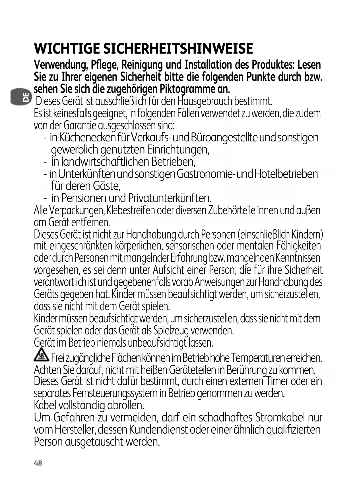 - Voor het beste bakresultaat, leg de ronde kant van de in 2 gesneden tomaat op de onderste grillplaat. VARKENSVLEES * Gebruik de dichtschroei functie als de dikte 20 mm overschrijdt. NL48 WICHTIGE SICHERHEITSHINWEISE Verwendung, Pflege, Reinigung und Installation des Produktes: Lesen Sie zu Ihrer eigenen Sicherheit bitte die folgenden Punkte durch bzw. sehen Sie sich die zugehörigen Piktogramme an. Dieses Gerät ist ausschließlich für den Hausgebrauch bestimmt. Es ist keinesfalls geeignet, in folgenden Fällen verwendet zu werden, die zudem von der Garantie ausgeschlossen sind: - in Küchenecken für Verkaufs- und Büroangestellte und sonstigen gewerblich genutzten Einrichtungen, - in landwirtschaftlichen Betrieben, - in Unterkünften und sonstigen Gastronomie- und Hotelbetrieben für deren Gäste, - in Pensionen und Privatunterkünften. Alle Verpackungen, Klebestreifen oder diversen Zubehörteile innen und außen am Gerät entfernen. Dieses Gerät ist nicht zur Handhabung durch Personen (einschließlich Kindern) mit eingeschränkten körperlichen, sensorischen oder mentalen Fähigkeiten oder durch Personen mit mangelnder Erfahrung bzw. mangelnden Kenntnissen vorgesehen, es sei denn unter Aufsicht einer Person, die für ihre Sicherheit verantwortlich ist und gegebenenfalls vorab Anweisungen zur Handhabung des Geräts gegeben hat. Kinder müssen beaufsichtigt werden, um sicherzustellen, dass sie nicht mit dem Gerät spielen. Kinder müssen beaufsichtigt werden, um sicherzustellen, dass sie nicht mit dem Gerät spielen oder das Gerät als Spielzeug verwenden. Gerät im Betrieb niemals unbeaufsichtigt lassen.