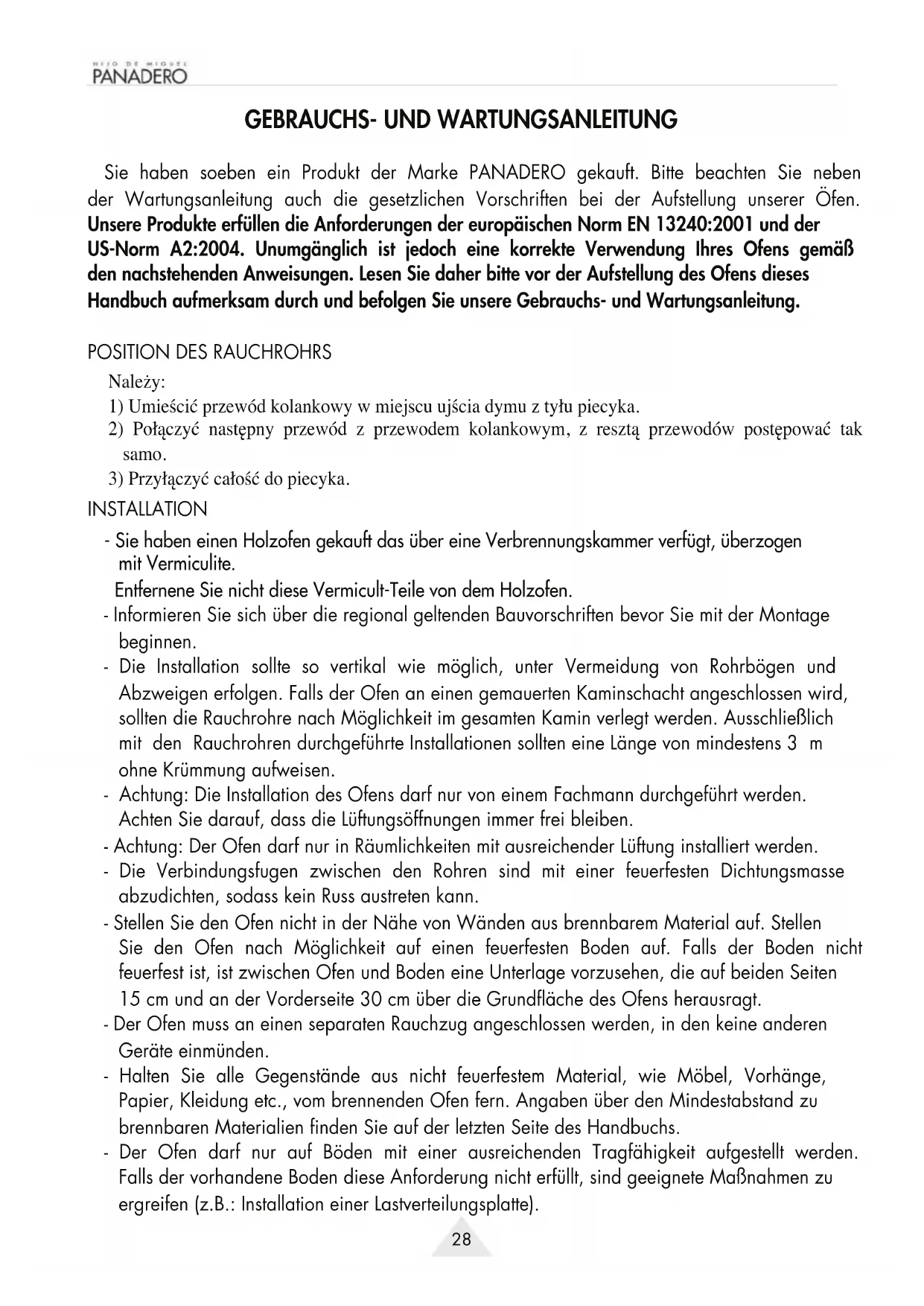Sie haben soeben ein Produkt der Marke PANADERO gekauft. Bitte beachten Sie neben der Wartungsanleitung auch die gesetzlichen Vorschriften bei der Aufstellung unserer Öfen. Unsere Produkte erfüllen die Anforderungen der europäischen Norm EN 13240:2001 und der US-Norm A2:2004. Unumgänglich ist jedoch eine korrekte Verwendung Ihres Ofens gemäß den nachstehenden Anweisungen. Lesen Sie daher bitte vor der Aufstellung des Ofens dieses Handbuch aufmerksam durch und befolgen Sie unsere Gebrauchs- und Wartungsanleitung.