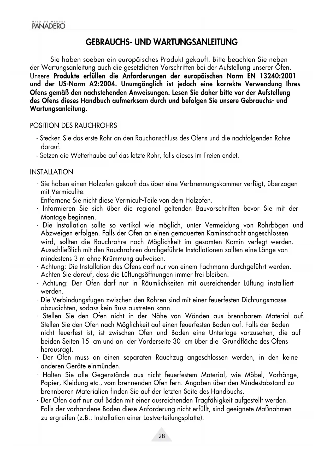 Sie haben soeben ein europäisches Produkt gekauft. Bitte beachten Sie neben der Wartungsanleitung auch die gesetzlichen Vorschriften bei der Aufstellung unserer Öfen. Unsere Produkte erfüllen die Anforderungen der europäischen Norm EN 13240:2001 und der US-Norm A2:2004. Unumgänglich ist jedoch eine korrekte Verwendung Ihres Ofens gemäß den nachstehenden Anweisungen. Lesen Sie daher bitte vor der Aufstellung des Ofens dieses Handbuch aufmerksam durch und befolgen Sie unsere Gebrauchs- und Wartungsanleitung.