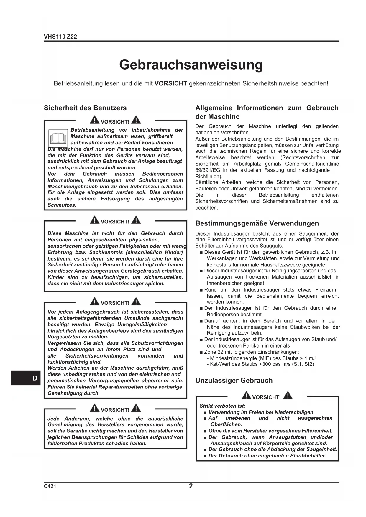 Gebrauchsanweisung Allgemeine Informationen zum Gebrauch der Maschine Der Gebrauch der Maschine unterliegt den geltenden nationalen Vorschriften. Außer der Betriebsanleitung und den Bestimmungen, die im jeweiligen Benutzungsland gelten, müssen zur Unfallverhütung auch die technischen Regeln für eine sichere und korrekte Arbeitsweise beachtet werden (Rechtsvorschriften zur Sicherheit am Arbeitsplatz gemäß Gemeinschaftsrichtlinie 89/391/EG in der aktuellen Fassung und nachfolgende Richtlinien). Sämtliche Arbeiten, welche die Sicherheit von Personen, Bauteilen oder Umwelt gefährden könnten, sind zu vermeiden. Die in dieser Betriebsanleitung enthaltenen Sicherheitsvorschriften und Sicherheitsmaßnahmen sind zu beachten. Bestimmungsgemäße Verwendungen Dieser Industriesauger besteht aus einer Saugeinheit, der eine Filtereinheit vorgeschaltet ist, und er verfügt über einen Behälter zur Aufnahme des Saugguts. ■ Dieses Gerät ist für den gewerblichen Gebrauch, z.B. in Werkanlagen und Werkstätten, sowie zur Vermietung und keinesfalls für normale Haushaltszwecke geeignete. ■ Dieser Industriesauger ist für Reinigungsarbeiten und das Aufsaugen von trockenen Materialien ausschließlich in Innenbereichen geeignet. ■ Rund um den Industriesauger stets etwas Freiraum lassen, damit die Bedienelemente bequem erreicht werden können. ■ Der Industriesauger ist für den Gebrauch durch eine Bedienperson bestimmt. ■ Darauf achten, in dem Bereich und vor allem in der Nähe des Industriesaugers keine Staubwolken bei der Reinigung aufzuwirbeln. ■ Der Industriesauger ist für das Aufsaugen von Staub und/ oder trockenen Partikeln in einer als ■ Zone 22 mit folgenden Einschränkungen: - Mindestzündenergie (MIE) des Staubs > 1 mJ - Kst-Wert des Staubs <300 bas m/s (St1, St2) Unzulässiger Gebrauch VORSICHT! Strikt verboten ist: ■ Verwendung im Freien bei Niederschlägen. ■ Auf unebenen und nicht waagerechten Oberächen. ■ Ohne die vom Hersteller vorgesehene Filtereinheit. ■ Der Gebrauch, wenn Ansaugstutzen und/oder Ansaugschlauch auf Körperteile gerichtet sind. ■ Der Gebrauch ohne die Abdeckung der Saugeinheit. ■ Der Gebrauch ohne eingebauten Staubbehälter. Betriebsanleitung lesen und die mit VORSICHT gekennzeichneten Sicherheitshinweise beachten! Sicherheit des Benutzers VORSICHT! Betriebsanleitung vor Inbetriebnahme der Maschine aufmerksam lesen, gribereit aufbewahren und bei Bedarf konsultieren. Die Maschine darf nur von Personen benutzt werden, die mit der Funktion des Geräts vertraut sind, ausdrücklich mit dem Gebrauch der Anlage beauftragt und entsprechend geschult wurden. Vor dem Gebrauch müssen Bedienpersonen Informationen, Anweisungen und Schulungen zum Maschinengebrauch und zu den Substanzen erhalten, für die Anlage eingesetzt werden soll. Dies umfasst auch die sichere Entsorgung des aufgesaugten Schmutzes. VORSICHT! Diese Maschine ist nicht für den Gebrauch durch Personen mit eingeschränkten physischen, sensorischen oder geistigen Fähigkeiten oder mit wenig Erfahrung bzw. Sachkenntnis (einschließlich Kinder) bestimmt, es sei denn, sie werden durch eine für ihre Sicherheit zuständige Person beaufsichtigt oder haben von dieser Anweisungen zum Gerätegebrauch erhalten. Kinder sind zu beaufsichtigen, um sicherzustellen, dass sie nicht mit dem Industriesauger spielen. VORSICHT! Vor jedem Anlagengebrauch ist sicherzustellen, dass alle sicherheitsgefährdenden Umstände sachgerecht beseitigt wurden. Etwaige Unregelmäßigkeiten hinsichtlich des Anlagenbetriebs sind den zuständigen Vorgesetzten zu melden. Vergewissern Sie sich, dass alle Schutzvorrichtungen und Abdeckungen an ihrem Platz sind und alle Sicherheitsvorrichtungen vorhanden und funktionstüchtig sind. Werden Arbeiten an der Maschine durchgeführt, muß diese unbedingt stehen und von den elektrischen und pneumatischen Versorgungsquellen abgetrennt sein. Führen Sie keinerlei Reparaturarbeiten ohne vorherige Genehmigung durch. VORSICHT! Jede Änderung, welche ohne die ausdrückliche Genehmigung des Herstellers vorgenommen wurde, soll die Garantie nichtig machen und den Hersteller von jeglichen Beanspruchungen für Schäden aufgrund von fehlerhaften Produkten schadlos halten.VHS110 Z22