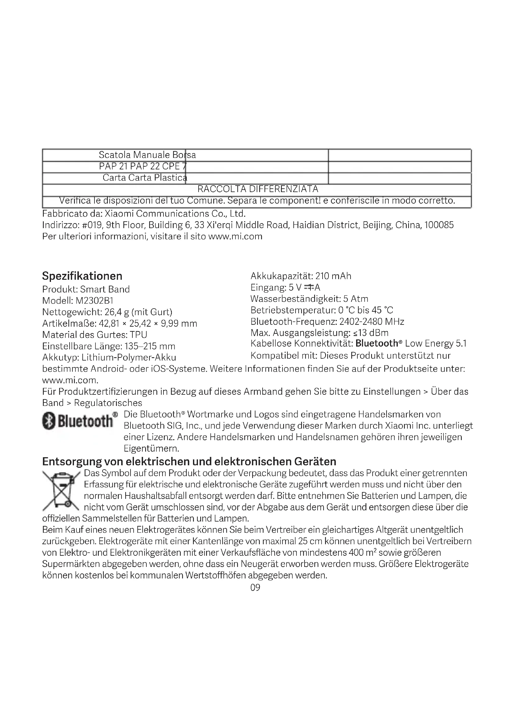 Carta Carta Plastica RACCOLTA DIFFERENZIATA Verifica Ie disposizioni del tuo Comune. Separa Ie component! e conferiscile in modo corretto. Fabbricato da: Xiaomi Communications Co., Ltd. Indirizzo: #019, 9th Floor, Building 6, 33 Xi'erqi Middle Road, Haidian District, Beijing, China, 100085 Per ulteriori informazioni, visitare il sito www.mi.com Spezifikationen Produkt: Smart Band Modell: M2302B1 Nettogewicht: 26,4g (mit Gurt) Artikelmaße: 42,81×25,42×9,99 mm Material des Gurtes: TPU Einstellbare Länge: 135–215mm Akkutyp: Lithium-Polymer-Akku Akkukapazität: 210mAh Eingang: 5 V 1 A Wasserbeständigkeit: 5 Atm Betriebstemperatur: 0°C bis 45°C Bluetooth-Frequenz: 2402-2480 MHz Max. Ausgangsleistung: ≤13 dBm Kabellose Konnektivität: Bluetooth® Low Energy 5.1 Kompatibel mit: Dieses Produkt unterstützt nur bestimmte Android- oder iOS-Systeme. Weitere Informationen finden Sie auf der Produktseite unter: www.mi.com. Für Produktzertifizierungen in Bezug auf dieses Armband gehen Sie bitte zu Einstellungen > Über das Band > Regulatorisches Die Bluetooth® Wortmarke und Logos sind eingetragene Handelsmarken von Bluetooth SIG, Inc., und jede Verwendung dieser Marken durch Xiaomi Inc. unterliegt einer Lizenz. Andere Handelsmarken und Handelsnamen gehören ihren jeweiligen Eigentümern. Entsorgung von elektrischen und elektronischen Geräten Das Symbol auf dem Produkt oder der Verpackung bedeutet, dass das Produkt einer getrennten Erfassung für elektrische und elektronische Geräte zugeführt werden muss und nicht über den normalen Haushaltsabfall entsorgt werden darf. Bitte entnehmen Sie Batterien und Lampen, die nicht vom Gerät umschlossen sind, vor der Abgabe aus dem Gerät und entsorgen diese über die offiziellen Sammelstellen für Batterien und Lampen. Beim Kauf eines neuen Elektrogerätes können Sie beim Vertreiber ein gleichartiges Altgerät unentgeltlich zurückgeben. Elektrogeräte mit einer Kantenlänge von maximal 25 cm können unentgeltlich bei Vertreibern von Elektro- und Elektronikgeräten mit einer Verkaufsfläche von mindestens 400 m² sowie größeren Supermärkten abgegeben werden, ohne dass ein Neugerät erworben werden muss. Größere Elektrogeräte können kostenlos bei kommunalen Wertstoffhöfen abgegeben werden. 09Durch die korrekte Entsorgung tragen Sie dazu bei, negative Auswirkungen auf die Umwelt und die menschliche Gesundheit zu vermeiden, die durch unsachgemäße Erfassung und Behandlung von Elektroaltgeräten entstehen können. Bitte löschen Sie sämtliche personenbezogenen Daten auf dem Gerät, bevor Sie es entsorgen. Für weitere Informationen kontaktieren sie bitte Ihre Kommunalverwaltung, Ihren örtlichen Abfallentsorger oder das Geschäft, in dem Sie das Produkt erworben haben. EU-Konformitätserklärung Hiermit bestätigt Xiaomi Communications Co., Ltd., dass das Funkgerät des Typs M2302B1 mit der Verordnung 2014/53/EU in Einklang steht. Der vollständige Wortlaut der EU- Konformitätserklärung ist unter der folgenden Internetadresse abrufbar: http://www.mi.com/ global/service/support/declaration.html Vorsichtsmaßnahmen