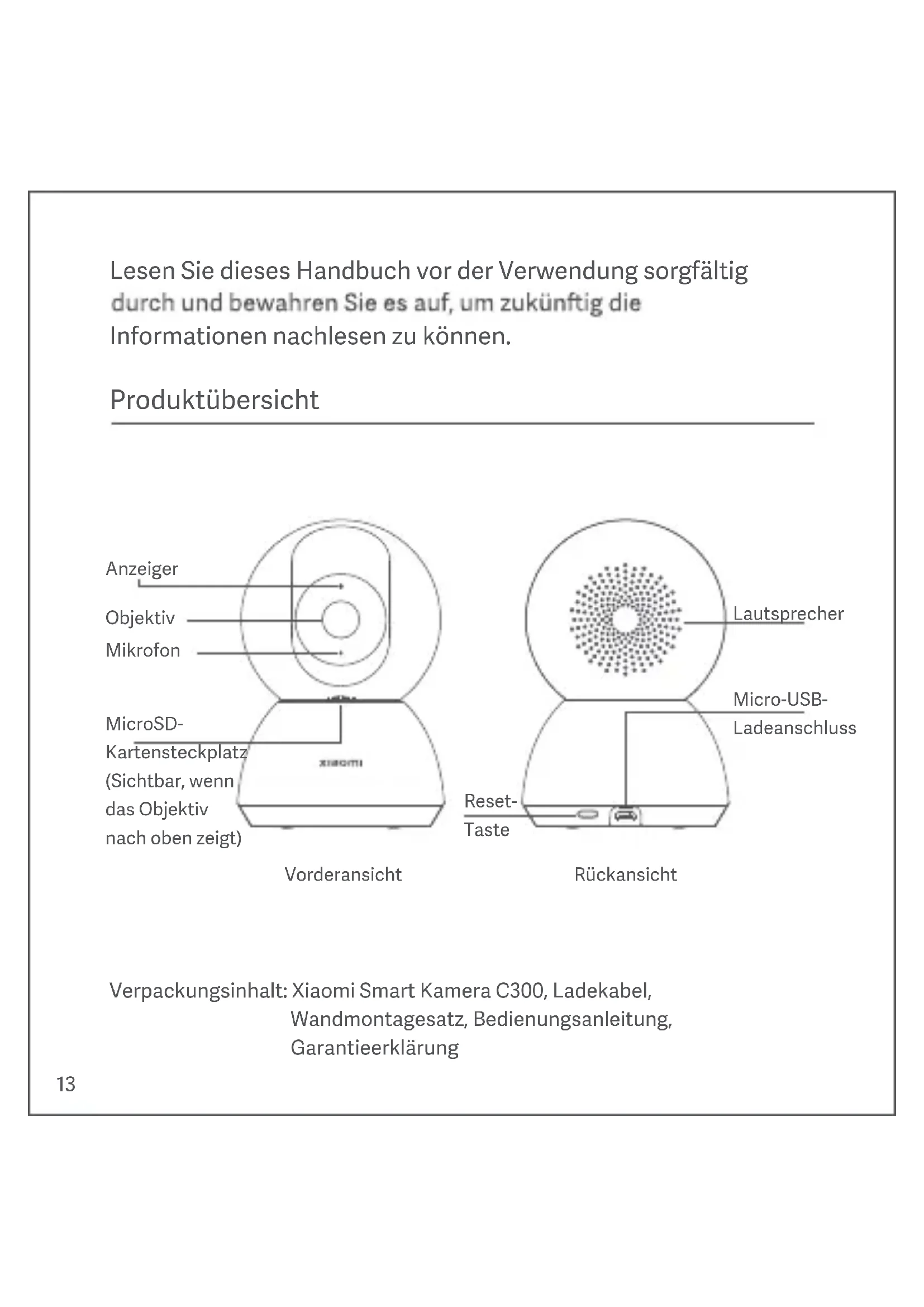 Manufactured by: Xiaomi Communications Co., Ltd. Please use a compatible and qualified adapter with an output of 5 V=2 A to power the product. Address: #019, 9th Floor, Building 6, 33 Xi'erqi Middle Road, Haidian District, Beijing, China For further information, please go to www.mi.com User Manual Version: V1.0Produktübersicht Lautsprecher Anzeiger Objektiv Mikrofon ZURÜCKSETZEN Lesen Sie dieses Handbuch vor der Verwendung sorgfältig Informationen nachlesen zu können. MicroSD- Kartensteckplatz (Sichtbar, wenn das Objektiv nach oben zeigt) Micro-USB- Ladeanschluss Reset- Taste Vorderansicht Rückansicht Verpackungsinhalt: Xiaomi Smart Kamera C300, Ladekabel, Wandmontagesatz, Bedienungsanleitung, Garantieerklärung
