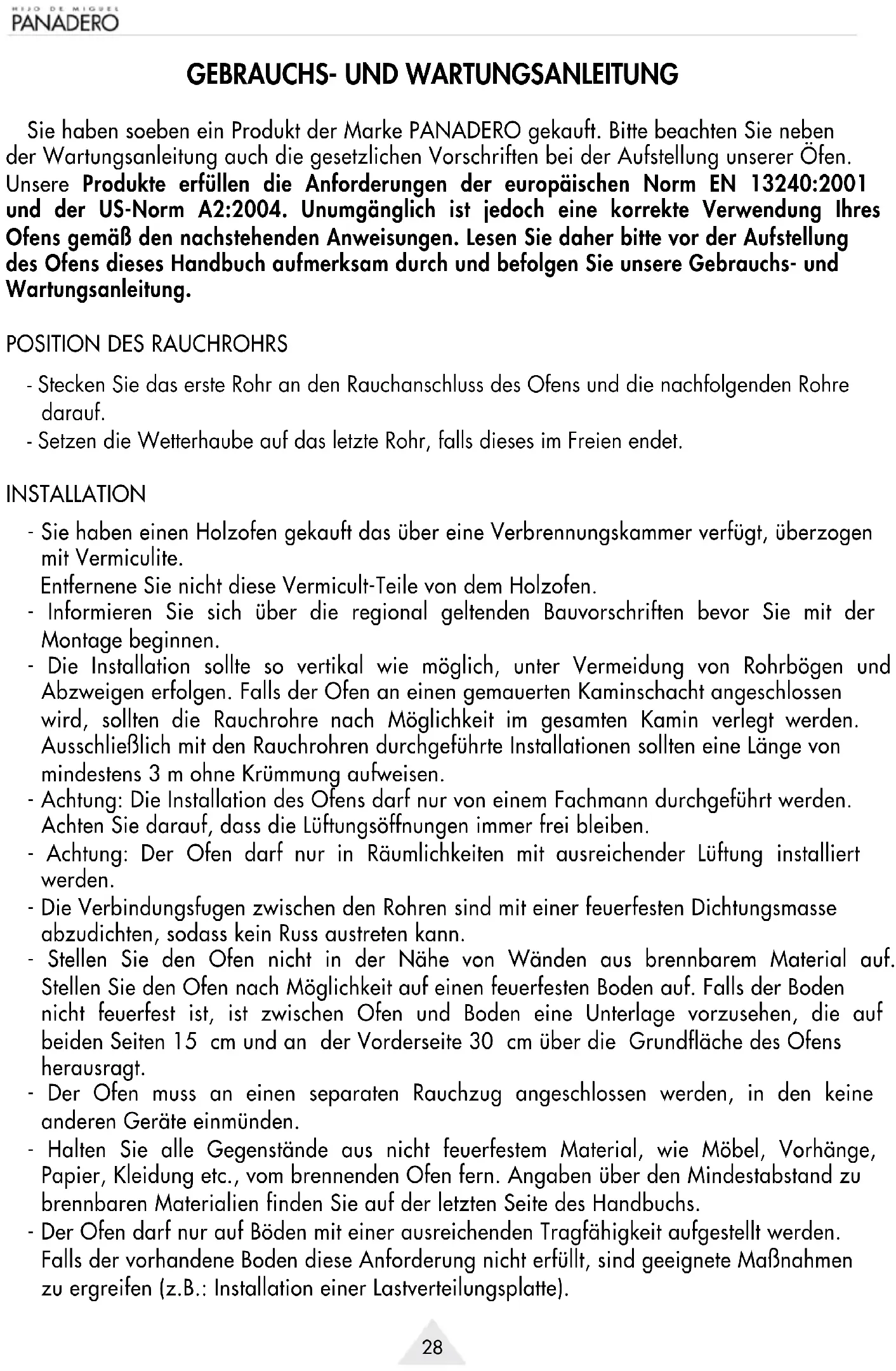 Sie haben soeben ein Produkt der Marke PANADERO gekauft. Bitte beachten Sie neben der Wartungsanleitung auch die gesetzlichen Vorschriften bei der Aufstellung unserer Öfen. Unsere Produkte erfüllen die Anforderungen der europäischen Norm EN 13240:2001 und der US-Norm A2:2004. Unumgänglich ist jedoch eine korrekte Verwendung Ihres Ofens gemäß den nachstehenden Anweisungen. Lesen Sie daher bitte vor der Aufstellung des Ofens dieses Handbuch aufmerksam durch und befolgen Sie unsere Gebrauchs- und Wartungsanleitung.