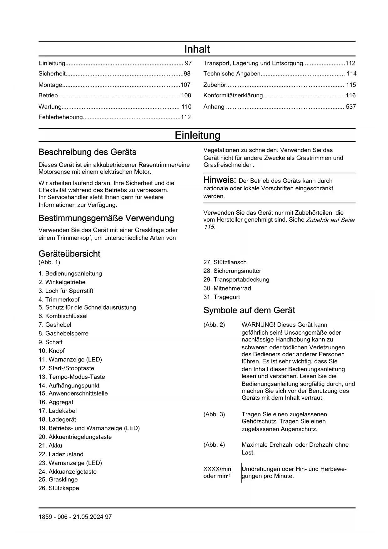 - Anhang Einleitung Beschreibung des Geräts Dieses Gerät ist ein akkubetriebener Rasentrimmer/eine Motorsense mit einem elektrischen Motor. Wir arbeiten laufend daran, Ihre Sicherheit und die Effektivität während des Betriebs zu verbessern. Ihr Servicehändler steht Ihnen gern für weitere Informationen zur Verfügung. Bestimmungsgemäße Verwendung Verwenden Sie das Gerät mit einer Grasklinge oder einem Trimmerkopf, um unterschiedliche Arten von Vegetationen zu schneiden. Verwenden Sie das Gerät nicht für andere Zwecke als Grastrimmen und Grasfreischneiden. Hinweis: Der Betrieb des Geräts kann durch nationale oder lokale Vorschriften eingeschränkt werden. Verwenden Sie das Gerät nur mit Zubehörteilen, die vom Hersteller genehmigt sind. Siehe Zubehör auf Seite p. 537