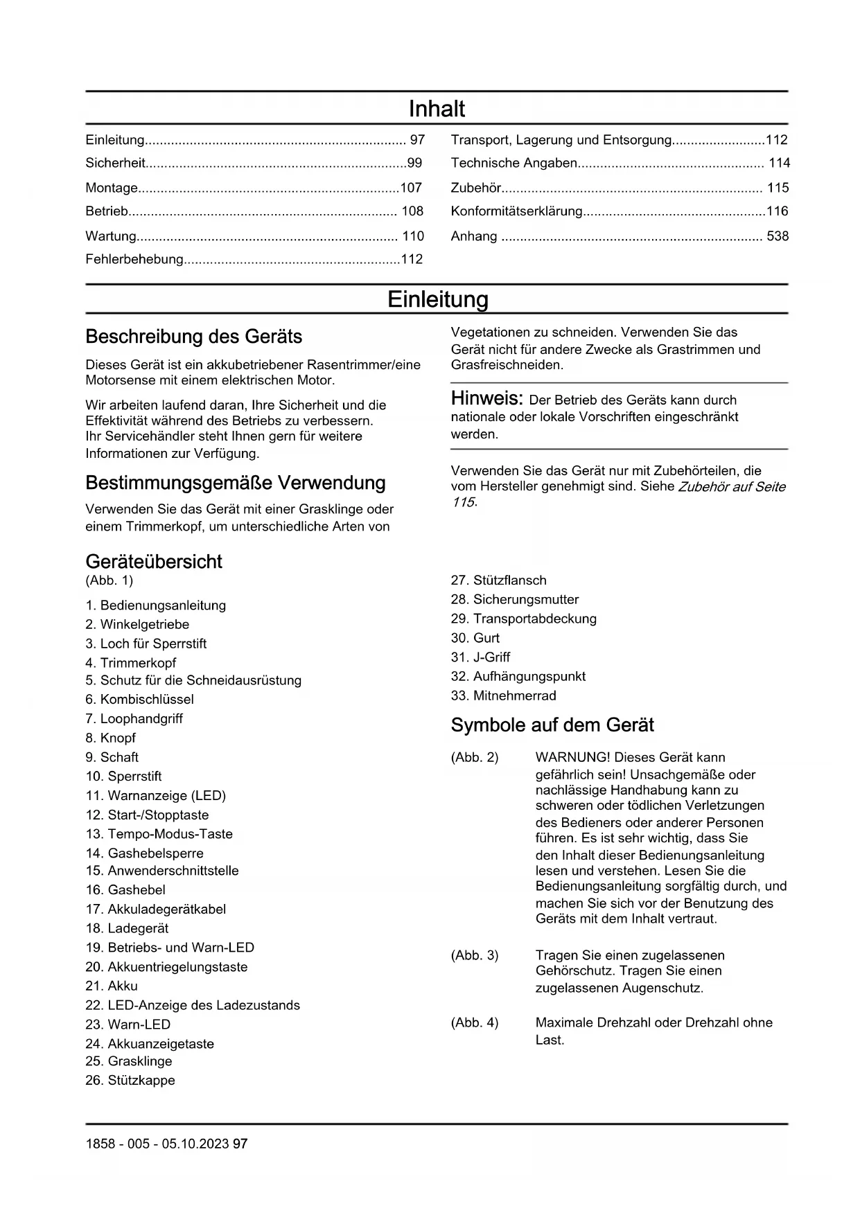 - Anhang Einleitung Beschreibung des Geräts Dieses Gerät ist ein akkubetriebener Rasentrimmer/eine Motorsense mit einem elektrischen Motor. Wir arbeiten laufend daran, Ihre Sicherheit und die Effektivität während des Betriebs zu verbessern. Ihr Servicehändler steht Ihnen gern für weitere Informationen zur Verfügung. Bestimmungsgemäße Verwendung Verwenden Sie das Gerät mit einer Grasklinge oder einem Trimmerkopf, um unterschiedliche Arten von Vegetationen zu schneiden. Verwenden Sie das Gerät nicht für andere Zwecke als Grastrimmen und Grasfreischneiden. Hinweis: Der Betrieb des Geräts kann durch nationale oder lokale Vorschriften eingeschränkt werden. Verwenden Sie das Gerät nur mit Zubehörteilen, die vom Hersteller genehmigt sind. Siehe Zubehör auf Seite p. 538