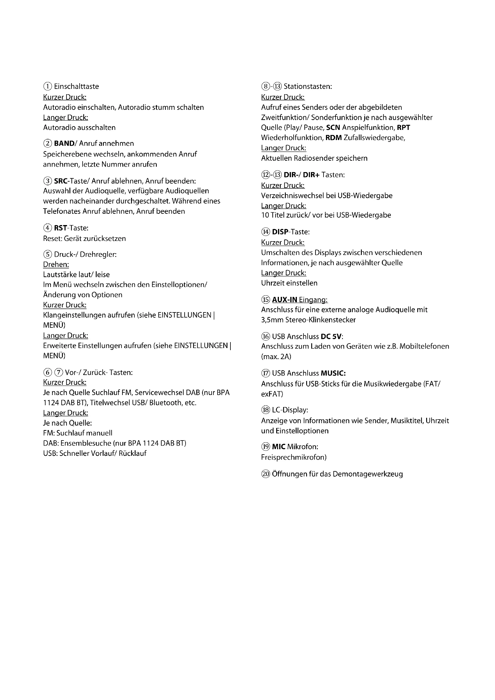 Kurzer Druck: Autoradio einschalten, Autoradio stumm schalten Langer Druck: Autoradio ausschalten ② BAND/ Anruf annehmen Speicherebene wechseln, ankommenden Anruf annehmen, letzte Nummer anrufen ③ SRC-Taste/ Anruf ablehnen, Anruf beenden: Auswahl der Audioquelle, verfügbare Audioquellen werden nacheinander durchgeschaltet. Während eines Telefonates Anruf ablehnen, Anruf beenden ④ RST-Taste: Reset: Gerät zurücksetzen ⑤ Druck-/ Drehregler: Drehen: Lautstärke laut/ leise Im Menü wechseln zwischen den Einstelloptionen/ Änderung von Optionen Kurzer Druck: Klangeinstellungen aufrufen (siehe EINSTELLUNGEN | MENÜ) Langer Druck: Erweiterte Einstellungen aufrufen (siehe EINSTELLUNGEN | MENÜ) ⑥ ⑦ Vor-/ Zurück- Tasten: Kurzer Druck: Je nach Quelle Suchlauf FM, Servicewechsel DAB (nur BPA 1124 DAB BT), Titelwechsel USB/ Bluetooth, etc. Langer Druck: Je nach Quelle: FM: Suchlauf manuell DAB: Ensemblesuche (nur BPA 1124 DAB BT) USB: Schneller Vorlauf/ Rücklauf ⑧-⑬ Stationstasten: Kurzer Druck: Aufruf eines Senders oder der abgebildeten Zweitfunktion/ Sonderfunktion je nach ausgewählter Quelle (Play/ Pause, SCN Anspielfunktion, RPT Wiederholfunktion, RDM Zufallswiedergabe, Langer Druck: Aktuellen Radiosender speichern ⑫-⑬ DIR-/ DIR+ Tasten: Kurzer Druck: Verzeichniswechsel bei USB-Wiedergabe Langer Druck: 10 Titel zurück/ vor bei USB-Wiedergabe ⑭ DISP-Taste: Kurzer Druck: Umschalten des Displays zwischen verschiedenen Informationen, je nach ausgewählter Quelle Langer Druck: Uhrzeit einstellen ⑮ AUX-IN Eingang: Anschluss für eine externe analoge Audioquelle mit 3,5mm Stereo-Klinkenstecker ⑯ USB Anschluss DC 5V: Anschluss zum Laden von Geräten wie z.B. Mobiltelefonen (max. 2A) ⑰ USB Anschluss MUSIC: Anschluss für USB-Sticks für die Musikwiedergabe (FAT/ exFAT) ⑱ LC-Display: Anzeige von Informationen wie Sender, Musiktitel, Uhrzeit und Einstelloptionen ⑲ MIC Mikrofon: Freisprechmikrofon) ⑳ Öffnungen für das DemontagewerkzeugDE