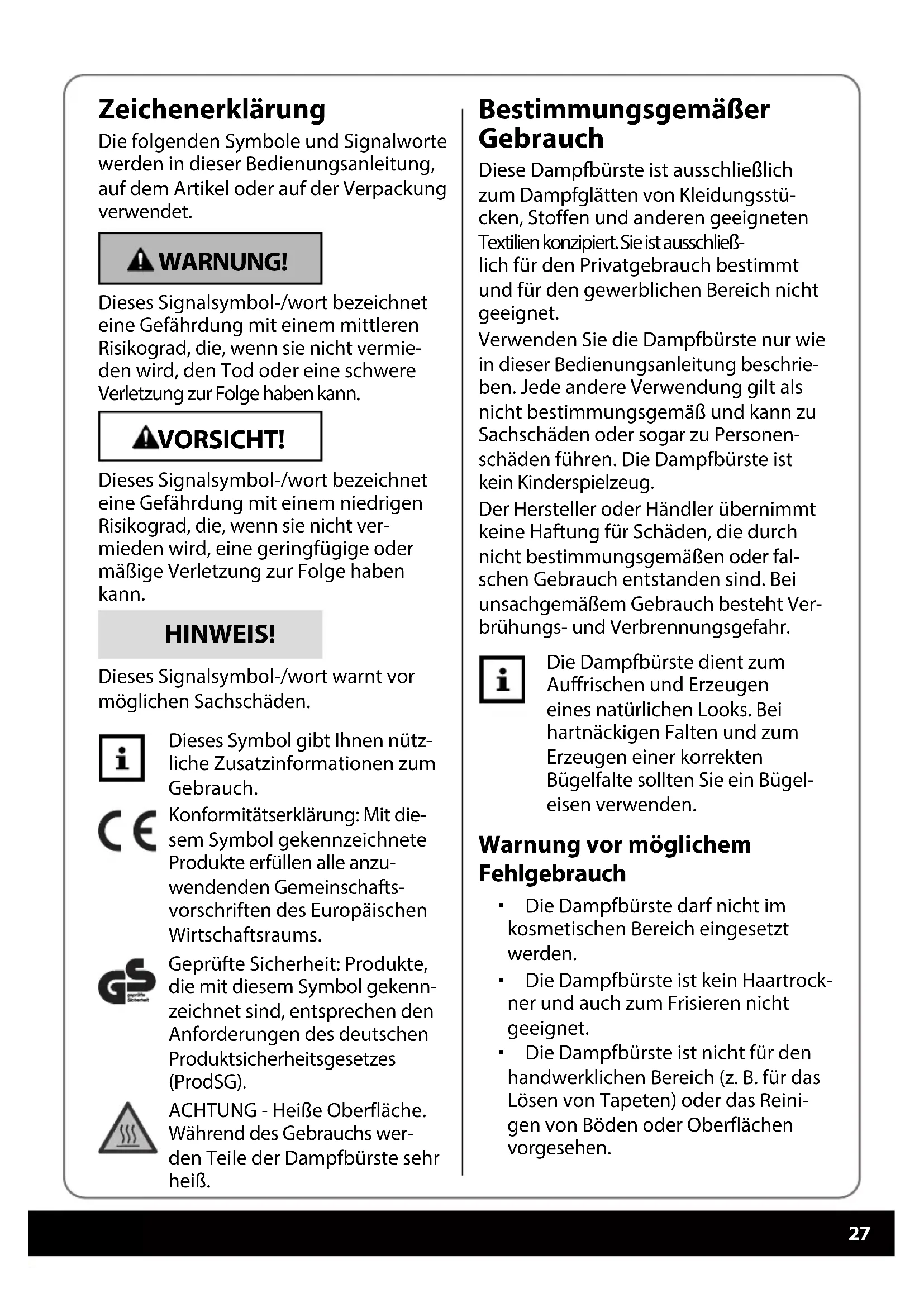 Zeichenerklärung Die folgenden Symbole und Signalworte werden in dieser Bedienungsanleitung, auf dem Artikel oder auf der Verpackung verwendet. WARNUNG! Dieses Signalsymbol-/wort bezeichnet eine Gefährdung mit einem mittleren Risikograd, die, wenn sie nicht vermie- den wird, den Tod oder eine schwere Verletzung zur Folge haben kann. VORSICHT! Dieses Signalsymbol-/wort bezeichnet eine Gefährdung mit einem niedrigen Risikograd, die, wenn sie nicht ver- mieden wird, eine geringfügige oder mäßige Verletzung zur Folge haben kann. HINWEIS! Dieses Signalsymbol-/wort warnt vor möglichen Sachschäden. Dieses Symbol gibt Ihnen nütz- liche Zusatzinformationen zum Gebrauch. Konformitätserklärung: Mit die- sem Symbol gekennzeichnete Produkte erfüllen alle anzu- wendenden Gemeinschafts- vorschriften des Europäischen Wirtschaftsraums. Geprüfte Sicherheit: Produkte, die mit diesem Symbol gekenn- zeichnet sind, entsprechen den Anforderungen des deutschen Produktsicherheitsgesetzes (ProdSG). ACHTUNG - Heiße Oberfläche. Während des Gebrauchs wer- den Teile der Dampfbürste sehr heiß. Bestimmungsgemäßer Gebrauch Diese Dampfbürste ist ausschließlich zum Dampfglätten von Kleidungsstü- cken, Stoffen und anderen geeigneten Textilien konzipiert. Sie ist ausschließ- lich für den Privatgebrauch bestimmt und für den gewerblichen Bereich nicht geeignet. Verwenden Sie die Dampfbürste nur wie in dieser Bedienungsanleitung beschrie- ben. Jede andere Verwendung gilt als nicht bestimmungsgemäß und kann zu Sachschäden oder sogar zu Personen- schäden führen. Die Dampfbürste ist kein Kinderspielzeug. Der Hersteller oder Händler übernimmt keine Haftung für Schäden, die durch nicht bestimmungsgemäßen oder fal- schen Gebrauch entstanden sind. Bei unsachgemäßem Gebrauch besteht Ver- brühungs- und Verbrennungsgefahr. Die Dampfbürste dient zum Auffrischen und Erzeugen eines natürlichen Looks. Bei hartnäckigen Falten und zum Erzeugen einer korrekten Bügelfalte sollten Sie ein Bügel- eisen verwenden. Warnung vor möglichem Fehlgebrauch Die Dampfbürste darf nicht im kosmetischen Bereich eingesetzt werden. Die Dampfbürste ist kein Haartrock- ner und auch zum Frisieren nicht geeignet. Die Dampfbürste ist nicht für den handwerklichen Bereich (z. B. für das Lösen von Tapeten) oder das Reini- gen von Böden oder Oberflächen vorgesehen.28 Sicherheitshinweise WARNUNG! Stromschlaggefahr! Fehlerhafte Elektroinstallation, zu hohe Netzspannung und fehlerhafter Umgang mit einem elektrischen Gerät können zu elektrischem Stromschlag führen. Zur Dampferzeugung wird der Wassertank des Gerätes mit Wasser gefüllt. Tauchen Sie das Gerät selbst sowie Netzanschlussleitung und Netzstecker jedoch niemals in Was- ser oder eine andere Flüssigkeit, da sonst die Gefahr eines elektrischen Schlages besteht. Betreiben Sie das Gerät nicht in einer feuchten Umgebung oder einer Umgebung mit hoher Luftfeuchtig- keit. Schließen Sie das Gerät an eine ord- nungsgemäß installierte Steckdose an, deren Spannung den „Techni- schen Daten“ entspricht. Achten Sie darauf, dass die Steck- dose gut zugänglich ist, damit Sie im Bedarfsfall schnell den Netzstecker ziehen können. Benutzen Sie die Dampfbürste nicht, wenn Gerät, Netzanschlussleitung oder Netzstecker beschädigt sind oder wenn das Gerät heruntergefal- len ist, wenn o ensichtliche Beschä- digungen sichtbar sind oder wenn es undicht ist. Achten Sie darauf, dass die Netzan- schlussleitung nicht durch scharfe Kanten oder heiße Gegenstände beschädigt wird. Bedienen Sie die Dampfbürste nicht mit nassen Händen. Richten Sie den Dampfstrahl nicht auf elektrische Geräte (Fernseher, Öfen etc.) oder elektrische Installa- tionen (Schalter, Steckdosen etc.). Ziehen Sie den Netzstecker aus der Steckdose, wenn Sie die Dampf- bürste nicht benutzen, bevor Sie sie reinigen oder mit Wasser füllen, umstellen oder wegpacken und wenn während des Betriebs o en- sichtlich eine Störung auftritt sowie bei Gewitter. Ziehen Sie dabei immer am Netzstecker, nicht am Kabel. Wickeln Sie die Netzanschlusslei- tung nicht um die Dampfbürste. Verwenden Sie kein Verlängerungs- kabel. Nehmen Sie keine Veränderungen am Gerät oder an der Netzanschluss- leitung vor. Lassen Sie Reparaturen nur von einer Fachwerkstatt durch- führen. Beachten Sie auch die bei- liegenden Garantiebedingungen. Falls Dampfbürste, Netzanschluss- leitung oder Netzstecker beschädigt sind, müssen Sie diese durch den Hersteller oder eine Fachwerkstatt reparieren lassen, um Gefährdungen zu vermeiden. Benutzen Sie dieses Gerät nicht in der Nähe von Badewannen, Schwimmbecken, Duschwannen oder anderen Gefäßen, die Wasser enthalten. Stromschlaggefahr! Wenn die Netzanschlussleitung die- ses Gerätes beschädigt wird, muss sie durch den Hersteller oder seinen Kundendienst oder eine ähnlich quali zierte Person ersetzt werden, um Gefährdungen zu vermeiden. Netzanschlussleitung nicht um das Gerät oder Teile des Gerätes wickeln. Durch fehlerhaftes Aufwickeln kann die Kabelisolation beschädigt werden und es besteht Stromschlag- gefahr.29