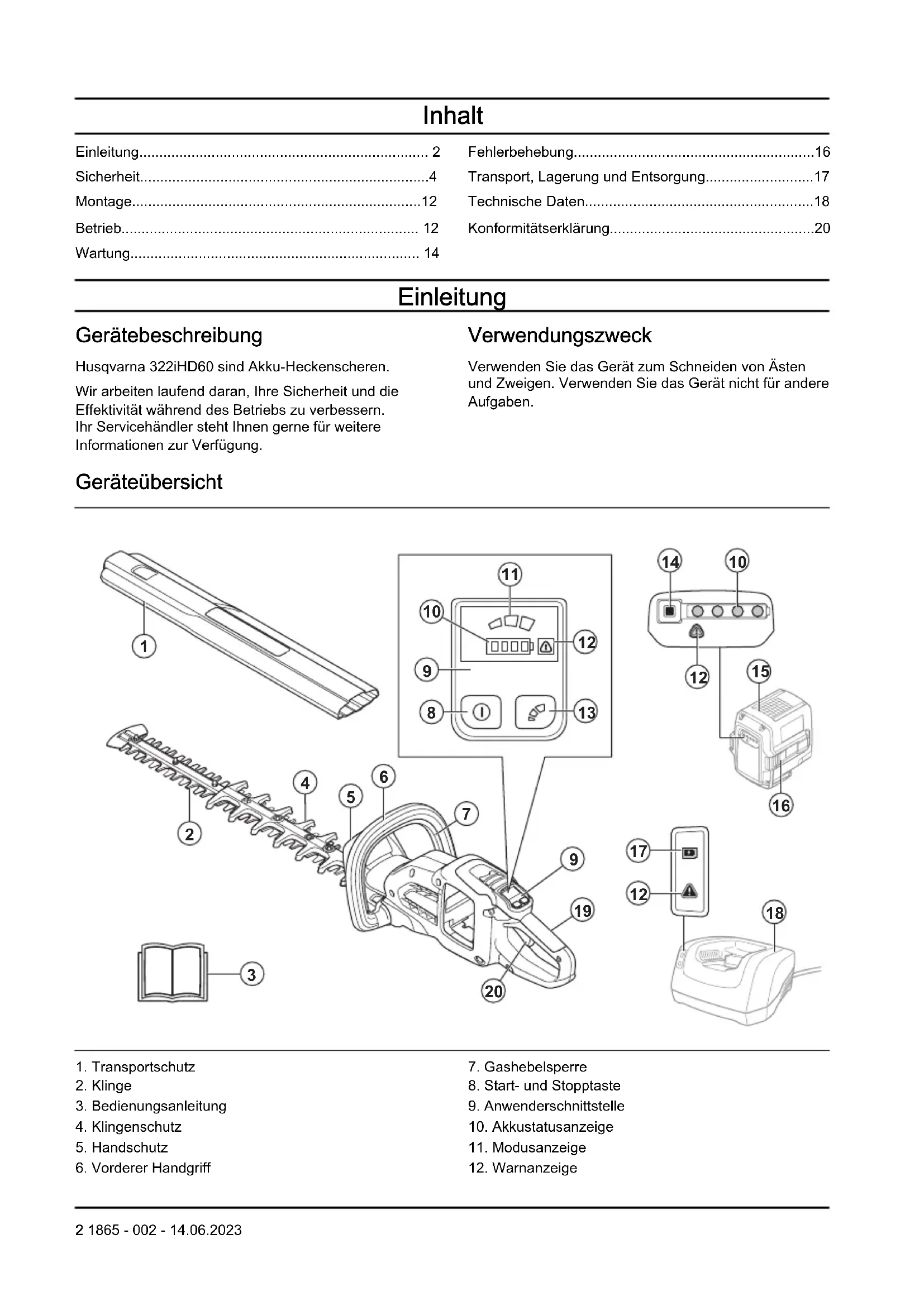 - Konformitätserklärung Einleitung Gerätebeschreibung Husqvarna 322iHD60 sind Akku-Heckenscheren. Wir arbeiten laufend daran, Ihre Sicherheit und die Effektivität während des Betriebs zu verbessern. Ihr Servicehändler steht Ihnen gerne für weitere Informationen zur Verfügung. Verwendungszweck Verwenden Sie das Gerät zum Schneiden von Ästen und Zweigen. Verwenden Sie das Gerät nicht für andere Aufgaben. Geräteübersicht p. 20