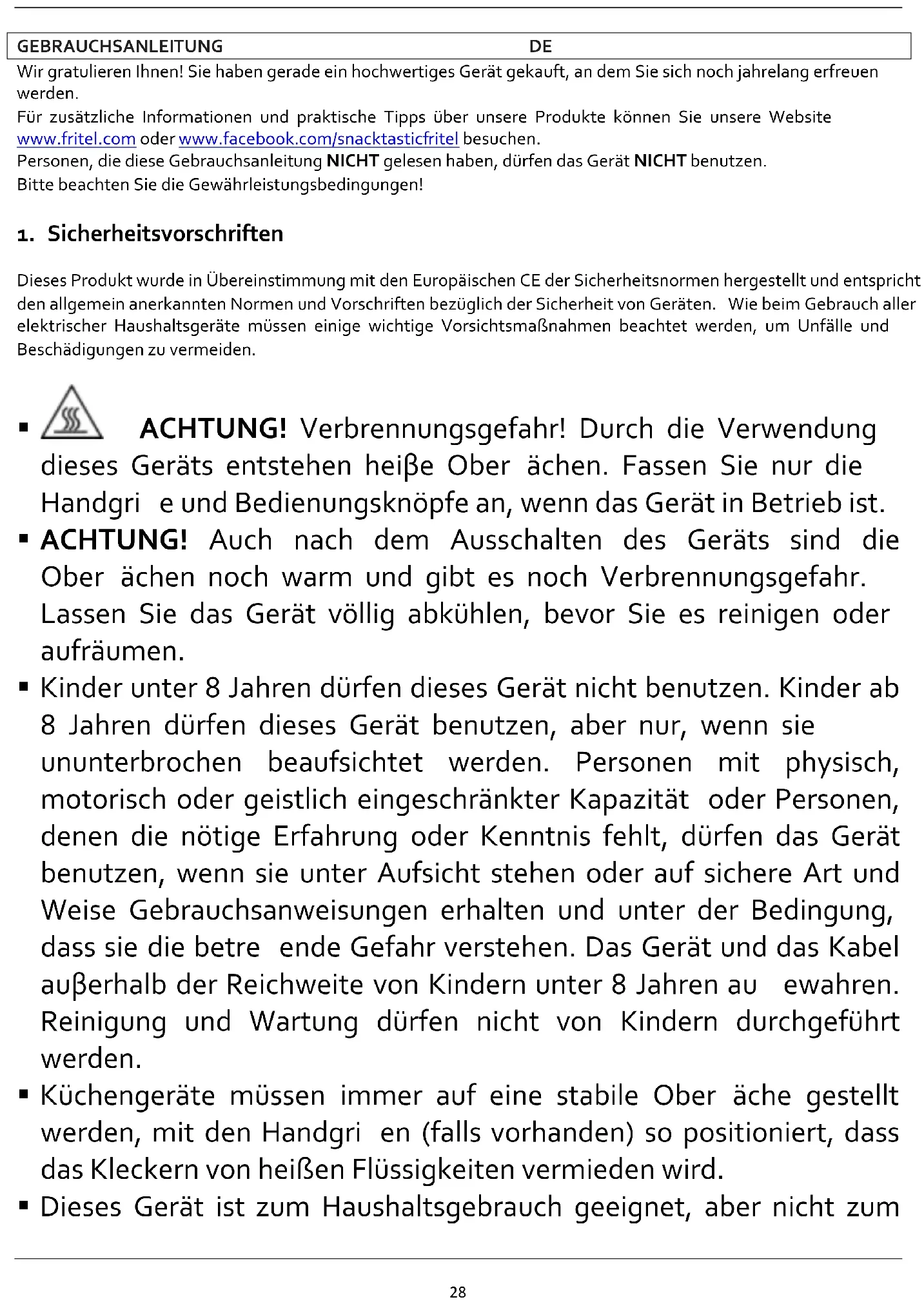 All liabilities, towards both consumer(s) and third parties, which could result from not observing all the safety regulations prescribed in this user manual, shall under no circumstances be charged to the manufacturer. In case of non-observation of these safety regulations, the user of the appliance, or any other person not having observed these safety regulations, protects the manufacturer from all responsibilities that he could be charged with.28 GEBRAUCHSANLEITUNG DE Wir gratulieren Ihnen! Sie haben gerade ein hochwertiges Gerät gekauft, an dem Sie sich noch jahrelang erfreuen werden. Für zusätzliche Informationen und praktische Tipps über unsere Produkte können Sie unsere Website www.fritel.com oder www.facebook.com/snacktasticfritel besuchen. Personen, die diese Gebrauchsanleitung NICHT gelesen haben, dürfen das Gerät NICHT benutzen. Bitte beachten Sie die Gewährleistungsbedingungen!