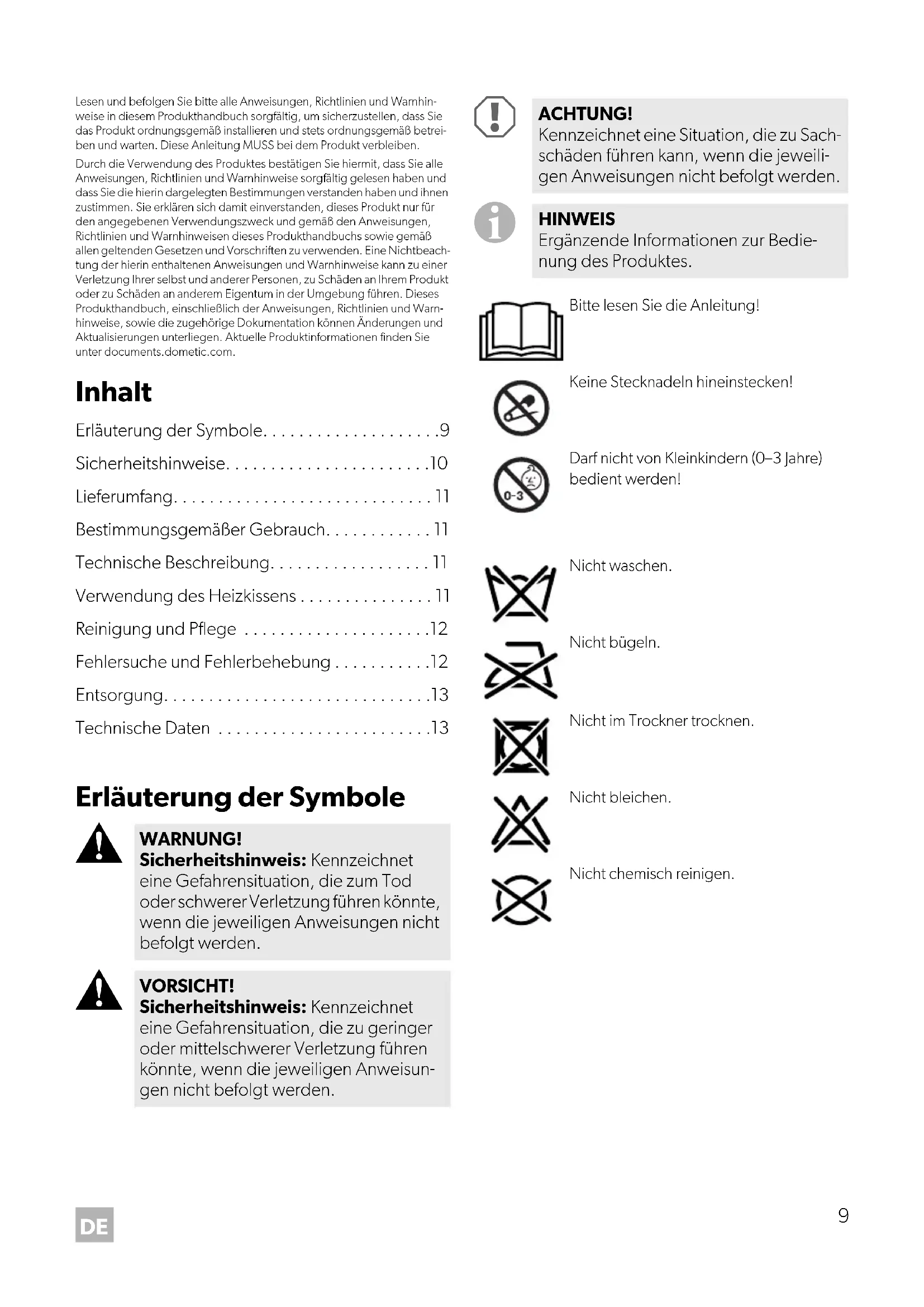 - Verwendung für andere als die in der Anleitung beschriebenen Zwecke Dometic behält sich das Recht vor, das Erschei- nungsbild des Produkts und dessen technische Daten zu ändern. Technische Beschreibung Das Heizkissen ist mit einer automatischen Abschaltfunktion ausgestattet. Nach etwa 45 Minuten Dauerbetrieb wird die Wärmezufuhr automatisch abgeschaltet. Das Heizkissen verfügt über ein Sicherheitsther- mostat, das die Wärme reguliert und Überhitzung verhindert, indem es das Heizkissen automatisch ausschaltet, sobald die Höchsttemperatur von 55 °C erreicht ist. Verwendung des Heiz- kissens