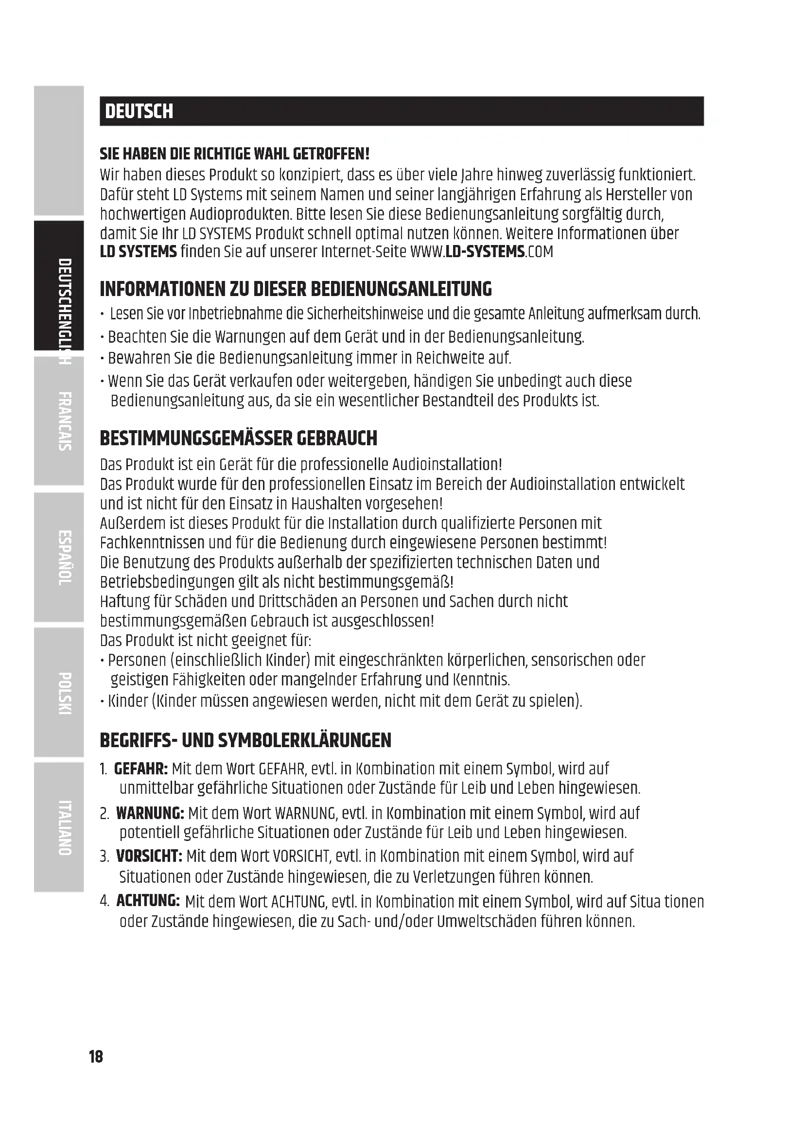 Declarations of conformity for products subject to the LVD, EMC, RoHS Directive can be requested from info@adamhall.com. Declarations of conformity for products subject to RED Directive can be downloaded from www.adamhall.com/compliance/. Subject to misprints and errors, as well as technical or other modifications! DEUTSCHFRANCAIS ESPAÑOL ENGLISH ITALIANO POLSKI18 DEUTSCH SIE HABEN DIE RICHTIGE WAHL GETROFFEN! Wir haben dieses Produkt so konzipiert, dass es über viele Jahre hinweg zuverlässig funktioniert. Dafür steht LD Systems mit seinem Namen und seiner langjährigen Erfahrung als Hersteller von hochwertigen Audioprodukten. Bitte lesen Sie diese Bedienungsanleitung sorgfältig durch, damit Sie Ihr LD SYSTEMS Produkt schnell optimal nutzen können. Weitere Informationen über LD SYSTEMS finden Sie auf unserer Internet-Seite WWW.LD-SYSTEMS.COM