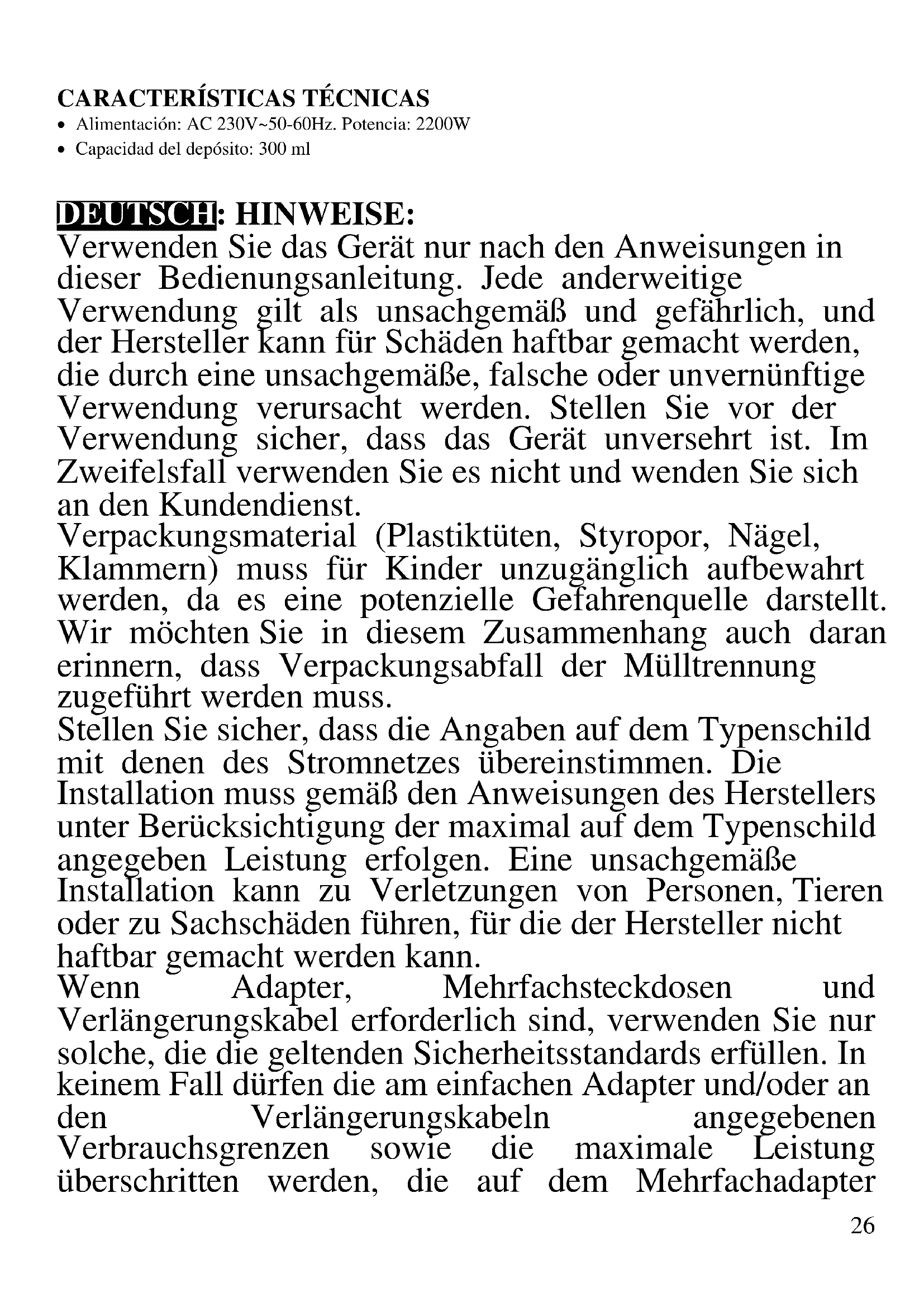 DEUTSCH: HINWEISE: Verwenden Sie das Gerät nur nach den Anweisungen in dieser Bedienungsanleitung. Jede anderweitige Verwendung gilt als unsachgemäß und gefährlich, und der Hersteller kann für Schäden haftbar gemacht werden, die durch eine unsachgemäße, falsche oder unvernünftige Verwendung verursacht werden. Stellen Sie vor der Verwendung sicher, dass das Gerät unversehrt ist. Im Zweifelsfall verwenden Sie es nicht und wenden Sie sich an den Kundendienst. Verpackungsmaterial (Plastiktüten, Styropor, Nägel, Klammern) muss für Kinder unzugänglich aufbewahrt werden, da es eine potenzielle Gefahrenquelle darstellt. Wir möchten Sie in diesem Zusammenhang auch daran erinnern, dass Verpackungsabfall der Mülltrennung zugeführt werden muss. Stellen Sie sicher, dass die Angaben auf dem Typenschild mit denen des Stromnetzes übereinstimmen. Die Installation muss gemäß den Anweisungen des Herstellers unter Berücksichtigung der maximal auf dem Typenschild angegeben Leistung erfolgen. Eine unsachgemäße Installation kann zu Verletzungen von Personen, Tieren oder zu Sachschäden führen, für die der Hersteller nicht haftbar gemacht werden kann. Wenn Adapter, Mehrfachsteckdosen und Verlängerungskabel erforderlich sind, verwenden Sie nur solche, die die geltenden Sicherheitsstandards erfüllen. In keinem Fall dürfen die am einfachen Adapter und/oder an den Verlängerungskabeln angegebenen Verbrauchsgrenzen sowie die maximale Leistung überschritten werden, die auf dem Mehrfachadapter27 angegeben ist. - Verwenden Sie das Netzkabel nicht in der Nähe von scharfen Gegenständen oder heißen Oberflächen und ziehen Sie den Netzstecker nicht am Netzkabel aus der Steckdose. Lassen Sie es nicht von der Arbeitsplatte baumeln, wo ein Kind es halten könnte. Verwenden Sie das Gerät im Falle von Schäden am Netzkabel, Stecker oder im Falle von Kurzschlüssen nicht und lassen Sie es in einer Vertragswerkstatt reparieren. - Setzen Sie das Gerät keinen ungünstigen Wetterbedingungen, wie z. B. Regen, Feuchtigkeit, Frost, aus und bewahren Sie es an einem trockenen Ort auf. Fassen Sie das Gerät nicht mit nassen Händen an und verwenden Sie es nicht barfuß. - Dieses Gerät kann von Kindern ab 8 Jahren und von Personen mit eingeschränkten körperlichen, sensorischen oder geistigen Fähigkeiten oder mangelnder Erfahrung und Kenntnissen verwendet werden, wenn sie beaufsichtigt oder instruiert wurden, um das Gerät sicher zu verwenden und die damit verbundenen Gefahren zu verstehen. Kinder dürfen nicht mit dem Gerät spielen. Reinigung und Benutzerwartung dürfen nicht von Kindern ohne Aufsicht durchgeführt werden. - Kinder dürfen nicht mit dem Gerät spielen. - Bewahren Sie das Gerät und sein Netzanschluss außerhalb der Reichweite von Kinder unter 8 Jahren. Wenn das Netzkabel beschädigt ist oder wenn ein Fehler vorliegt, darf das Gerät nicht manipuliert werden. Jede Reparatur muss vom Hersteller oder seinem technischen Kundendienst oder in jedem Fall von einer Person mit ähnlicher Qualifikation durchgeführt werden, um jegliches Risiko zu vermeiden. Die Nichtbeachtung der vorstehenden Bestimmungen kann die Sicherheit des28 Geräts beeinträchtigen und die Garantiebedingungen ungültig machen. WARNUNG: Dieses Gerät enthält eine Heizfunktion. Oberflächen, außer die funktionellen Oberflächen können hohe Temperaturen entwickeln. Da die Temperaturen von verschiedene Personen unterschiedlich wahrgenommen werden, sollte dieses Gerät mit VORSICHT verwendet werden. Halten Sie das Gerät ausschließlich auf Griffflächen die abhalten und verwenden Sie solche Hitzeschutzmaßen. Dieses Gerät ist nur für den Hausgebrauch oder gleichwertiges bestimmt, in Situationen wie bspw.: Kantinen in kleinen Firmen oder ähnliche Arbeitsumgebungen, von Kunden in Hotels, Motels oder andere Art von touristische Unterkunft, wie ländlicher oder Wohn –Tourismus. Das Gerät darf nicht mit einer Zeitschaltuhr oder mit einem separaten Fernwirksystem betrieben werden Führen Sie vor jedem Gebrauch das Netzkabel aus. Setzen Sie das Produkt keinen Stößen aus, es könnte beschädigt werden. Verwenden Sie nur originale und kompatible Teile und Zubehör. Halten Sie das Gerät fern von brennbaren Materialien, Wärmequellen, Dampf-und kalte Zonen. GRBRAUCHSANWEISUNG Beim ersten Gebrauch die Schutzfolie von der Bügelsohle entfernen, im Fall einer, aufgrund der Anwesenheit von Schutz Öl und Rückständen von der Schutzfolie, kann Dampf von der Bügelsohle ausgestoßen werden. Nach einigen Anwendungen, verschwindet der Rauch. Beim ersten Gebrauch den Dampf mehrmals weit weg von den Kleidern ausstoßen und probieren Sie das Eisen auf ein altes Tuch aus, um mögliche Rückstände zu entfernen, da diese das Gewebe zum Bügel verschmutzen oder29 zerkratzen könnte. Wenn nicht in Gebrauch, das Eisen in einer senkrechten Position abstellen. Halten Sie das Netzkabel frei von Knoten und Verwicklung. Kabel nicht um das Gerät rollen, vor oder nach der Verwendung. Ziehen Sie am Stecker, nicht am Kabel um es von der Steckdose abzutrennen. Es wird empfohlen nicht allzu häufig den bezeichneten Knopf, im Fachjargon „stock steam“ zu verwenden (Dampfimpuls), denn jedes Mal wenn Sie diesen Knopf drücken stellt sich zusätzliches Wasser zum normalen Dampfflusses dazu, dies führt zu einem Überschuss an kaltem Wasser in die Sohle und tendenziell die Temperatur dieser zu senken, dass sogar zu Wassertropfen führen kann, anstelle des gewünschten Dampf. Wenn immer Sie einen Reinigungsvorgang durchführen wollen, folgen Sie die Anweisungen im entsprechenden Absatz nach. Verwenden Sie das Eisen nicht als Heizer. Vor jedem Wassereinfüllen oder entleeren den Netzstecker ziehen. Füllen Sie den Behälter nicht über seine maximale Kapazität und fügen Sie keine Mischungen wie Öl, Fleckenentferner, oder Allgemeine Chemikalien. Wählen sie immer die angemessene Temperatur für die Kleider zum Bügeln. Das Bügeleisen muss benutzt od