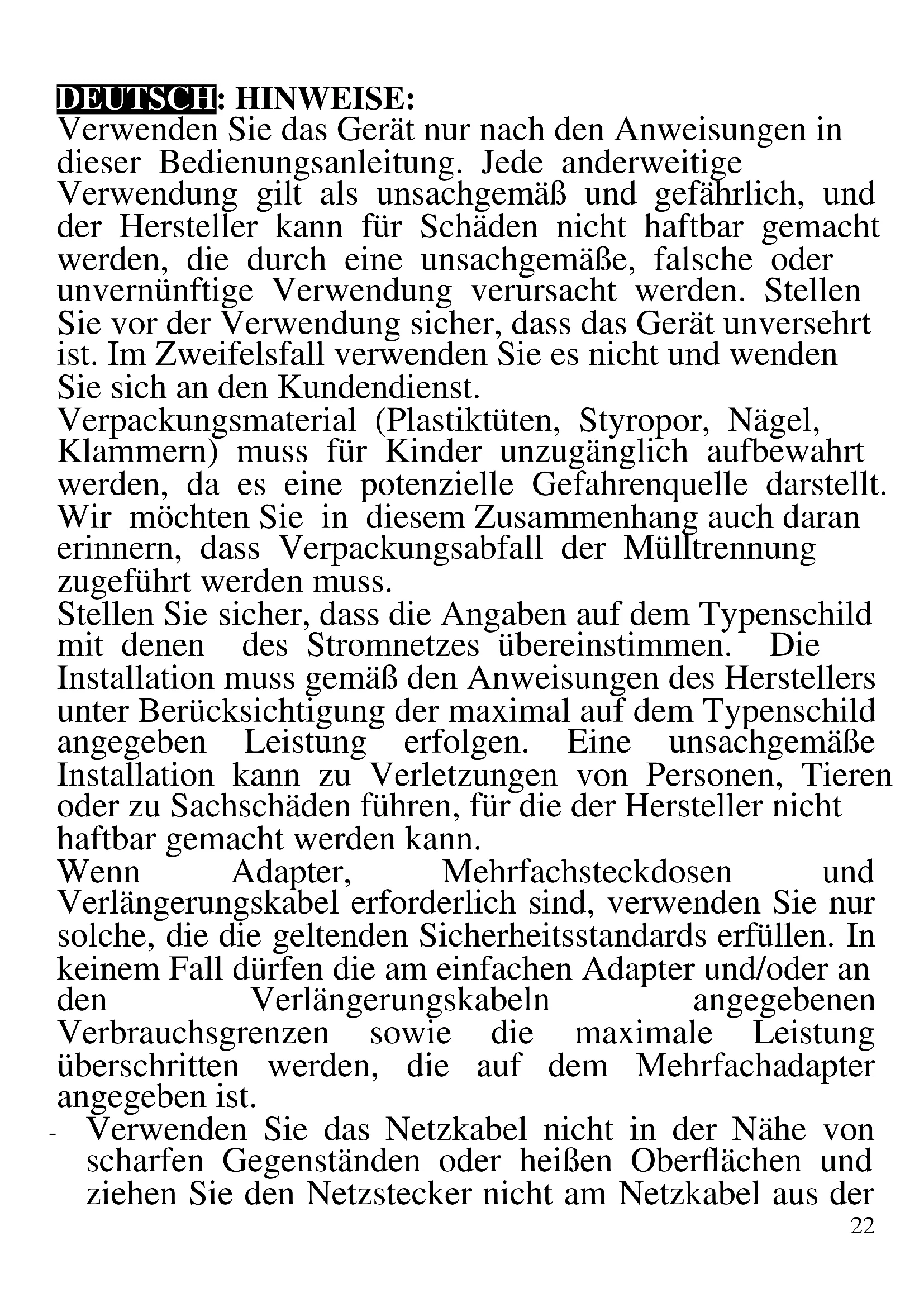 - Temperatura regulable de 40° C hasta 300° C - 90 minutos temporizador22 DEUTSCH: HINWEISE: Verwenden Sie das Gerät nur nach den Anweisungen in dieser Bedienungsanleitung. Jede anderweitige Verwendung gilt als unsachgemäß und gefährlich, und der Hersteller kann für Schäden nicht haftbar gemacht werden, die durch eine unsachgemäße, falsche oder unvernünftige Verwendung verursacht werden. Stellen Sie vor der Verwendung sicher, dass das Gerät unversehrt ist. Im Zweifelsfall verwenden Sie es nicht und wenden Sie sich an den Kundendienst. Verpackungsmaterial (Plastiktüten, Styropor, Nägel, Klammern) muss für Kinder unzugänglich aufbewahrt werden, da es eine potenzielle Gefahrenquelle darstellt. Wir möchten Sie in diesem Zusammenhang auch daran erinnern, dass Verpackungsabfall der Mülltrennung zugeführt werden muss. Stellen Sie sicher, dass die Angaben auf dem Typenschild mit denen des Stromnetzes übereinstimmen. Die Installation muss gemäß den Anweisungen des Herstellers unter Berücksichtigung der maximal auf dem Typenschild angegeben Leistung erfolgen. Eine unsachgemäße Installation kann zu Verletzungen von Personen, Tieren oder zu Sachschäden führen, für die der Hersteller nicht haftbar gemacht werden kann. Wenn Adapter, Mehrfachsteckdosen und Verlängerungskabel erforderlich sind, verwenden Sie nur solche, die die geltenden Sicherheitsstandards erfüllen. In keinem Fall dürfen die am einfachen Adapter und/oder an den Verlängerungskabeln angegebenen Verbrauchsgrenzen sowie die maximale Leistung überschritten werden, die auf dem Mehrfachadapter angegeben ist. - Verwenden Sie das Netzkabel nicht in der Nähe von scharfen Gegenständen oder heißen Oberflächen und ziehen Sie den Netzstecker nicht am Netzkabel aus der23 Steckdose. Lassen Sie es nicht von der Arbeitsplatte baumeln, wo ein Kind es halten könnte. Verwenden Sie das Gerät im Falle von Schäden am Netzkabel, Stecker oder im Falle von Kurzschlüssen nicht und lassen Sie es in einer Vertragswerkstatt reparieren. - Setzen Sie das Gerät keinen ungünstigen Wetterbedingungen, wie z. B. Regen, Feuchtigkeit, Frost, aus und bewahren Sie es an einem trockenen Ort auf. Fassen Sie das Gerät nicht mit nassen Händen an und verwenden Sie es nicht barfuß. - Dieses Gerät kann nicht von Kindern verwendet werden, auch wenn diese älter als 8 Jahre sind. - Dieses Gerät kann von Personen mit eingeschränkten körperlichen, sensorischen oder geistigen Fähigkeiten oder mangelnder Erfahrung und Kenntnissen verwendet werden, wenn sie in sicherer Weise beaufsichtigt oder instruiert wurden, wie das Gerät verwendet werden kann, und die damit verbundenen Gefahren verstehen. - Kinder dürfen nicht mit dem Gerät spielen. - Bewahren Sie das Gerät und sein Netzanschluss außerhalb der Reichweite von Kinder unter 8 Jahren. Wenn das Netzkabel beschädigt ist oder wenn ein Fehler vorliegt, darf das Gerät nicht manipuliert werden. Jede Reparatur muss vom Hersteller oder seinem technischen Kundendienst oder in jedem Fall von einer Person mit ähnlicher Qualifikation durchgeführt werden, um jegliches Risiko zu vermeiden. Die Nichtbeachtung der vorstehenden Bestimmungen kann die Sicherheit des Geräts beeinträchtigen und die Garantiebedingungen ungültig machen. WARNUNG: Dieses Gerät enthält eine Heizfunktion. Oberflächen, außer die funktionellen Oberflächen können hohe Temperaturen entwickeln. Da die Temperaturen von verschiedene Personen unterschiedlich wahrgenommen werden, sollte dieses Gerät mit VORSICHT verwendet24 werden. Halten Sie das Gerät ausschließlich auf Griffflächen die abhalten und verwenden Sie solche Hitzeschutzmaßen. Dieses Gerät ist nur für den Hausgebrauch oder gleichwertiges bestimmt, in Situationen wie bspw.: Kantinen in kleinen Firmen oder ähnliche Arbeitsumgebungen, von Kunden in Hotels, Motels oder andere Art von touristische Unterkunft, wie ländlicher oder Wohn –Tourismus. Das Gerät darf nicht mit einer Zeitschaltuhr oder mit einem separaten Fernwirksystem betrieben werden Führen Sie vor jedem Gebrauch das Netzkabel aus. Setzen Sie das Produkt keinen Stößen aus, es könnte beschädigt werden. Verwenden Sie nur originale und kompatible Teile und Zubehör. Halten Sie das Gerät fern von brennbaren Materialien, Wärmequellen, Dampf-und kalte Zonen. BEDIENUNGSANLEITUNG Benutzen Sie nur für höhe Temperaturen geeignete Töpfe. Stellen Sie das Hinterteil an eine Wand. Das Gerät wird während des Betriebs sehr warm. Berühren Sie nur den Türgriff und die Knöpfe. Berühren Sie das Glas und die Seitenteile nicht. Legen Sie keine Gegenstände auf die Tür, wenn sie aufgemacht ist. Sie könnte beschädigt werden oder das Ofen könnte fallen und brechen. Benutzen Sie immer Topflappen, um den Rost und das Blech auszuziehen. Vermeiden Sie Wasser auf das Glas der Tür, wenn es warm ist, da es brechen könnte. Benutzen Sie den Ofen nicht, wenn Sie Beschädigungen an der Tür oder der Türdichtung bemerken. Falls der Ofen nicht richtig funktioniert, wenden Sie sich an das Kundencenter. Ihr Eingriff kann den Ofen beschädigen. Vor jeder Nutzung, Rollen Sie das Kabel ab.25 Behandeln Sie das gerade gekochte Essen sorgfältig, da es sehr heiß sein kann. Betreiben Sie das Gerät nie unbeaufsichtigt. Nach jeder Nutzung, ziehen Sie immer den Stecker aus der Steckdose. Tauchen Sie den Ofen nicht in Wasser oder andere Flüssigkeiten und vermeiden Sie Spritzen auf ihn. Benutzen Sie nie Plastikbehälter für das traditionelle Garen. Benutzen Sie das Gerät nicht als Heizgerät. Stecken Sie keine Gegenstände in die Luftschlitze. Bevor Sie das Gerät reinigen, stecken Sie den Stecker aus der Steckdose und warten Sie auf die Abkühlung aller Teile des Geräts. Entnehmen Sie alle Gegenstände aus dem Kochraum. Legen Sie das Gerät auf stabile und feste Flächen. Lassen Sie während des Betriebs genügenden Raum an den Seiten des Ofens. Halten Sie das Gerät von brennbaren Materialien, Vorhängen, Heizque