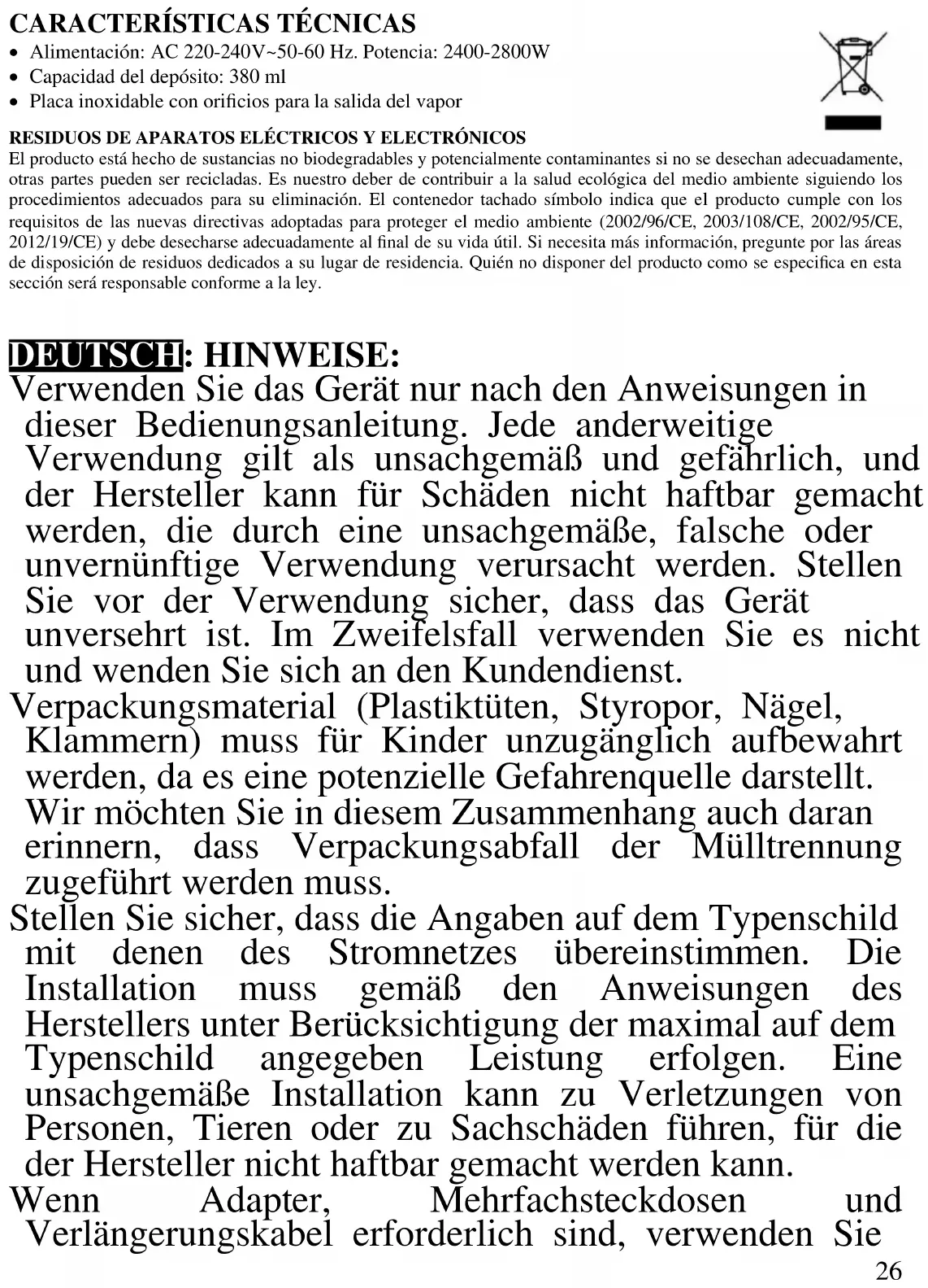 DEUTSCH: HINWEISE: Verwenden Sie das Gerät nur nach den Anweisungen in dieser Bedienungsanleitung. Jede anderweitige Verwendung gilt als unsachgemäß und gefährlich, und der Hersteller kann für Schäden nicht haftbar gemacht werden, die durch eine unsachgemäße, falsche oder unvernünftige Verwendung verursacht werden. Stellen Sie vor der Verwendung sicher, dass das Gerät unversehrt ist. Im Zweifelsfall verwenden Sie es nicht und wenden Sie sich an den Kundendienst. Verpackungsmaterial (Plastiktüten, Styropor, Nägel, Klammern) muss für Kinder unzugänglich aufbewahrt werden, da es eine potenzielle Gefahrenquelle darstellt. Wir möchten Sie in diesem Zusammenhang auch daran erinnern, dass Verpackungsabfall der Mülltrennung zugeführt werden muss. Stellen Sie sicher, dass die Angaben auf dem Typenschild mit denen des Stromnetzes übereinstimmen. Die Installation muss gemäß den Anweisungen des Herstellers unter Berücksichtigung der maximal auf dem Typenschild angegeben Leistung erfolgen. Eine unsachgemäße Installation kann zu Verletzungen von Personen, Tieren oder zu Sachschäden führen, für die der Hersteller nicht haftbar gemacht werden kann. Wenn Adapter, Mehrfachsteckdosen und Verlängerungskabel erforderlich sind, verwenden Sie27 nur solche, die die geltenden Sicherheitsstandards erfüllen. In keinem Fall dürfen die am einfachen Adapter und/oder an den Verlängerungskabeln angegebenen Verbrauchsgrenzen sowie die maximale Leistung überschritten werden, die auf dem Mehrfachadapter angegeben ist. - Verwenden Sie das Netzkabel nicht in der Nähe von scharfen Gegenständen oder heißen Oberflächen und ziehen Sie den Netzstecker nicht am Netzkabel aus der Steckdose. Lassen Sie es nicht von der Arbeitsplatte baumeln, wo ein Kind es halten könnte. Verwenden Sie das Gerät im Falle von Schäden am Netzkabel, Stecker oder im Falle von Kurzschlüssen nicht und lassen Sie es in einer Vertragswerkstatt reparieren. - Setzen Sie das Gerät keinen ungünstigen Wetterbedingungen, wie z. B. Regen, Feuchtigkeit, Frost, aus und bewahren Sie es an einem trockenen Ort auf. Fassen Sie das Gerät nicht mit nassen Händen an und verwenden Sie es nicht barfuß. - Dieses Gerät kann von Kindern ab 8 Jahren und von Personen mit eingeschränkten körperlichen, sensorischen oder geistigen Fähigkeiten oder mangelnder Erfahrung und Kenntnissen verwendet werden, wenn sie beaufsichtigt oder instruiert wurden, um das Gerät sicher zu verwenden und die damit verbundenen Gefahren zu verstehen. Kinder dürfen nicht mit dem Gerät spielen. Reinigung und Benutzerwartung dürfen nicht von Kindern ohne Aufsicht durchgeführt werden. - Kinder dürfen nicht mit dem Gerät spielen. - Bewahren Sie das Gerät und sein Netzanschluss außerhalb der Reichweite von Kinder unter 8 Jahren. Wenn das Netzkabel beschädigt ist oder wenn ein Fehler vorliegt, darf das Gerät nicht manipuliert werden. Jede Reparatur muss vom Hersteller oder seinem technischen Kundendienst oder in jedem Fall von einer Person mit28 ähnlicher Qualifikation durchgeführt werden, um jegliches Risiko zu vermeiden. Die Nichtbeachtung der vorstehenden Bestimmungen kann die Sicherheit des Geräts beeinträchtigen und die Garantiebedingungen ungültig machen. WARNUNG: Dieses Gerät enthält eine Heizfunktion. Oberflächen, außer die funktionellen Oberflächen können hohe Temperaturen entwickeln. Da die Temperaturen von verschiedene Personen unterschiedlich wahrgenommen werden, sollte dieses Gerät mit VORSICHT verwendet werden. Halten Sie das Gerät ausschließlich auf Griffflächen die abhalten und verwenden Sie solche Hitzeschutzmaßen. Dieses Gerät ist nur für den Hausgebrauch oder gleichwertiges bestimmt, in Situationen wie bspw.: Kantinen in kleinen Firmen oder ähnliche Arbeitsumgebungen, von Kunden in Hotels, Motels oder andere Art von touristische Unterkunft, wie ländlicher oder Wohn –Tourismus. Das Gerät darf nicht mit einer Zeitschaltuhr oder mit einem separaten Fernwirksystem betrieben werden Führen Sie vor jedem Gebrauch das Netzkabel aus. Setzen Sie das Produkt keinen Stößen aus, es könnte beschädigt werden. Verwenden Sie nur originale und kompatible Teile und Zubehör. GRBRAUCHSANWEISUNG Beim ersten Gebrauch die Schutzfolie von der Bügelsohle entfernen, im Fall einer, aufgrund der Anwesenheit von Schutz Öl und Rückständen von der Schutzfolie, kann Dampf von der Bügelsohle ausgestoßen werden. Nach einigen Anwendungen, verschwindet der Rauch. Halten Sie das Netzkabel frei von Knoten und Verwicklung. Kabel nicht um das Gerät rollen, vor oder nach der Verwendung.29 Beim ersten Gebrauch den Dampf mehrmals weit weg von den Kleidern ausstoßen und probieren Sie das Eisen auf ein altes Tuch aus, um mögliche Rückstände zu entfernen, da diese das Gewebe zum Bügel verschmutzen oder zerkratzen könnte. Wenn nicht in Gebrauch, das Eisen in einer senkrechten Position abstellen. Es wird empfohlen nicht allzu häufig den bezeichneten Knopf, im Fachjargon „stock steam“ zu verwenden (Dampfimpuls), denn jedes Mal wenn Sie diesen Knopf drücken stellt sich zusätzliches Wasser zum normalen Dampfflusses dazu, dies führt zu einem Überschuss an kaltem Wasser in die Sohle und tendenziell die Temperatur dieser zu senken, dass sogar zu Wassertropfen führen kann, anstelle des gewünschten Dampf. Wenn immer Sie einen Reinigungsvorgang durchführen wollen, folgen Sie die Anweisungen im entsprechenden Absatz nach. Verwenden Sie das Eisen nicht als Heizer. Vor jedem Wassereinfüllen oder entleeren den Netzstecker ziehen. Füllen Sie den Behälter nicht über seine maximale Kapazität und fügen Sie keine Mischungen wie Öl, Fleckenentferner, oder Allgemeine Chemikalien. Wählen sie immer die angemessene Temperatur für die Kleider zum Bügeln. Das Bügeleisen muss benutzt oder in Arbeitspausen auf einer stabilen Oberfläche abgestellt werden Wenn man das Bügeleisen aufräumt, sicherstellen, dass die Oberfläche auf dem es setzt stab