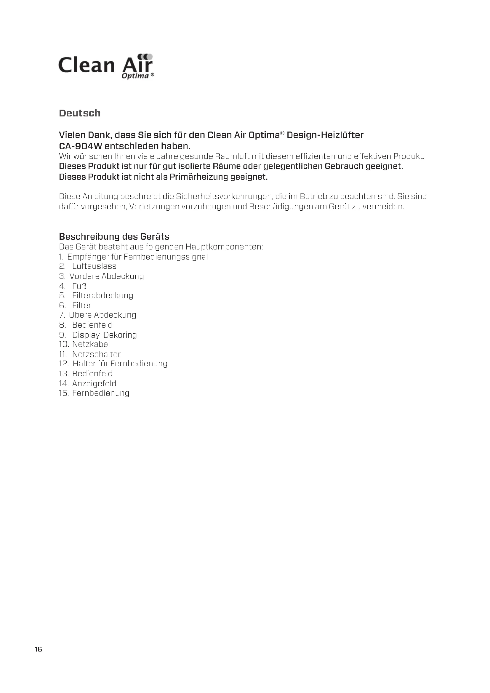 Clean Air Optima International B.V. | David Ricardostraat 9-7 / 9-9 | 7559 SH Hengelo (ov) The Netherlands | Phone: +31 (0) 74 - 2670145 Clean Air Optima Germany GmbH | Enschedestraße 14 | 48529 Nordhorn | Germany Phone: +49 (0) 5921 879-121 E-mail: info@cleanairoptima.com Internet: www.cleanairoptima.com16 Deutsch Vielen Dank, dass Sie sich für den Clean Air Optima® Design-Heizlüfter CA-904W entschieden haben. Wir wünschen Ihnen viele Jahre gesunde Raumluft mit diesem ezienten und eektiven Produkt. Dieses Produkt ist nur für gut isolierte Räume oder gelegentlichen Gebrauch geeignet. Dieses Produkt ist nicht als Primärheizung geeignet. Diese Anleitung beschreibt die Sicherheitsvorkehrungen, die im Betrieb zu beachten sind. Sie sind dafür vorgesehen, Verletzungen vorzubeugen und Beschädigungen am Gerät zu vermeiden. Beschreibung des Geräts Das Gerät besteht aus folgenden Hauptkomponenten: