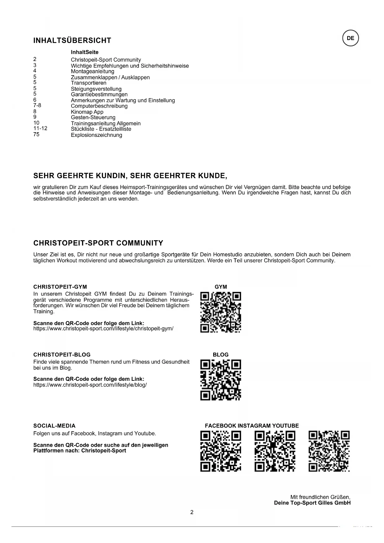 INHALTSÜBERSICHT SEHR GEEHRTE KUNDIN, SEHR GEEHRTER KUNDE, wir gratulieren Dir zum Kauf dieses Heimsport-Trainingsgerätes und wünschen Dir viel Vergnügen damit. Bitte beachte und befolge die Hinweise und Anweisungen dieser Montage- und Bedienungsanleitung. Wenn Du irgendwelche Fragen hast, kannst Du dich selbstverständlich jederzeit an uns wenden. Mit freundlichen Grüßen, Deine Top-Sport Gilles GmbH CHRISTOPEIT-GYM CHRISTOPEIT-BLOG SOCIAL-MEDIA CHRISTOPEIT-SPORT COMMUNITY In unserem Christopeit GYM ndest Du zu Deinem Trainings- gerät verschiedene Programme mit unterschiedlichen Heraus- forderungen. Wir wünschen Dir viel Freude bei Deinem täglichem Training. Scanne den QR-Code oder folge dem Link: https://www.christopeit-sport.com/lifestyle/christopeit-gym/ Unser Ziel ist es, Dir nicht nur neue und großartige Sportgeräte für Dein Homestudio anzubieten, sondern Dich auch bei Deinem täglichen Workout motivierend und abwechslungsreich zu unterstützen. Werde ein Teil unserer Christopeit-Sport Community. Folgen uns auf Facebook, Instagram und Youtube. Scanne den QR-Code oder suche auf den jeweiligen Plattformen nach: Christopeit-Sport Finde viele spannende Themen rund um Fitness und Gesundheit bei uns im Blog. Scanne den QR-Code oder folge dem Link: https://www.christopeit-sport.com/lifestyle/blog/ InhaltSeite GYM BLOG