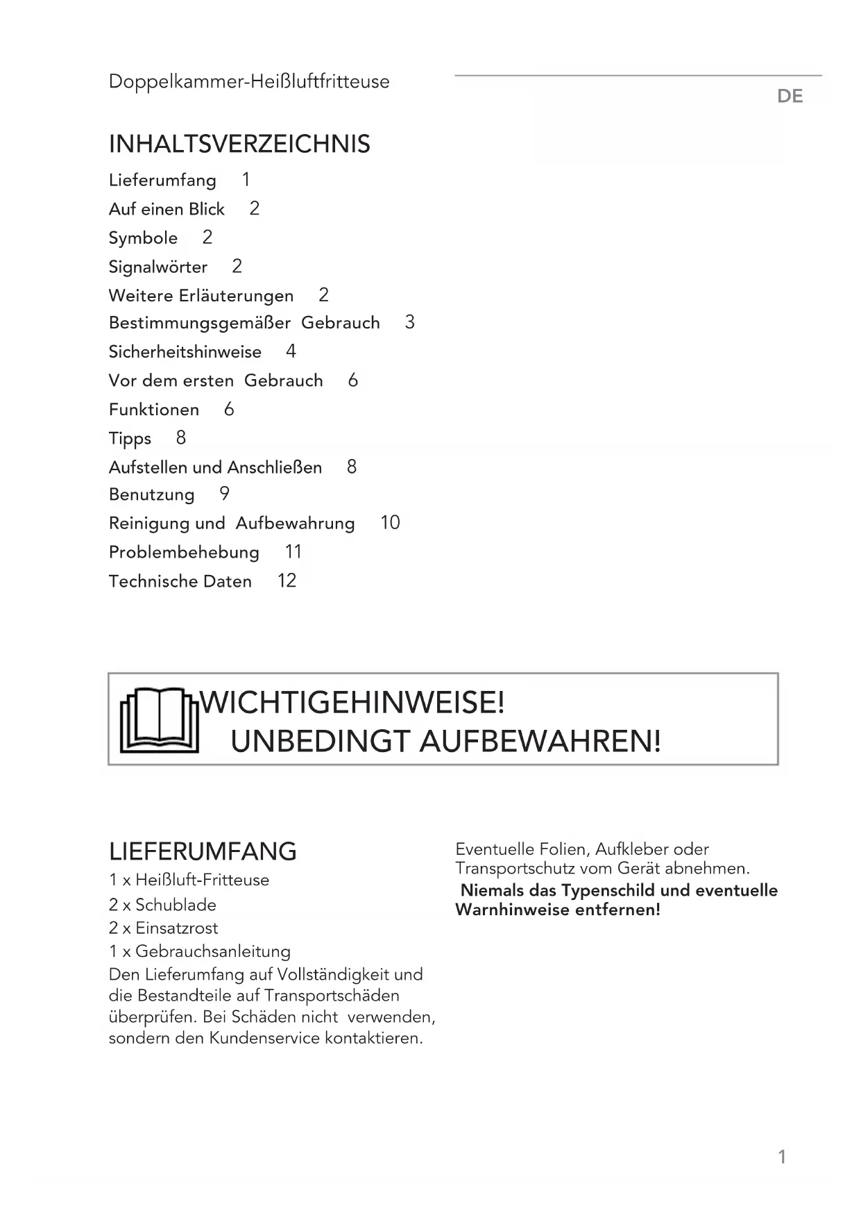 INHALTSVERZEICHNIS Lieferumfang 1 Auf einen Blick 2 Symbole 2 Signalwörter 2 Weitere Erläuterungen 2 Bestimmungsgemäßer Gebrauch 3 Sicherheitshinweise 4 Vor dem ersten Gebrauch 6 Funktionen 6 Tipps 8 Aufstellen und Anschließen 8 Benutzung 9 Reinigung und Aufbewahrung 10 Problembehebung 11 Technische Daten 12 LIEFERUMFANG 1 x Heißluft-Fritteuse 2 x Schublade 2 x Einsatzrost 1 x Gebrauchsanleitung Den Lieferumfang auf Vollständigkeit und die Bestandteile auf Transportschäden überprüfen. Bei Schäden nicht verwenden, sondern den Kundenservice kontaktieren. Eventuelle Folien, Aufkleber oder Transportschutz vom Gerät abnehmen. Niemals das Typenschild und eventuelle Warnhinweise entfernen! WICHTIGE HINWEISE!