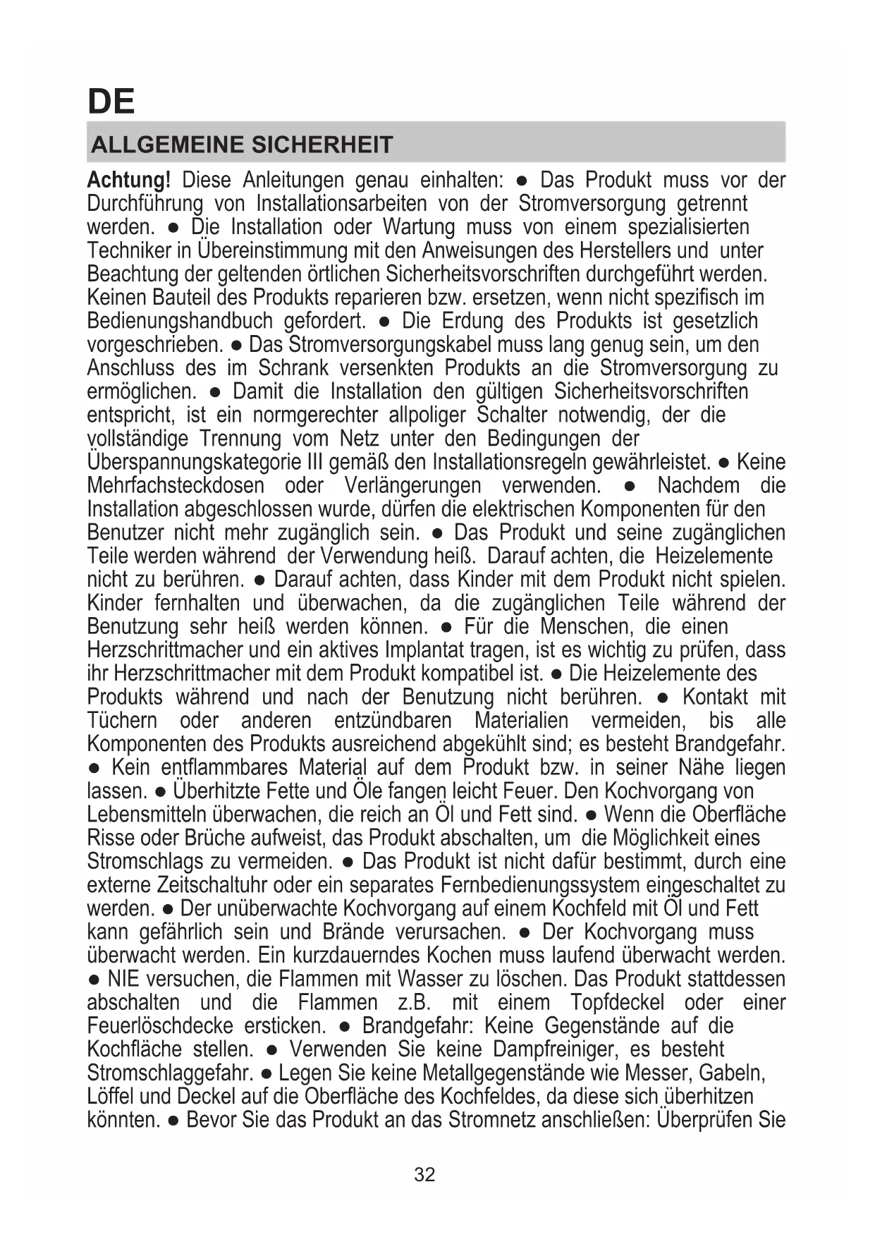 - Safety: EN/IEC 60335-1; EN/IEC 60335-2-6, EN/IEC 60335-2-31, EN/IEC 62233; • Performance: EN/IEC 61591; ISO 5167-1; ISO 5167-3; ISO 5168; EN/IEC 60704-1; EN/IEC 60704-2-13; EN/IEC 60704-3; ISO 3741; EN 50564; IEC 62301.EN 60350-2; • EMC: EN 55014-1; CISPR 14-1; EN 55014-2; CISPR 14-2; EN/IEC 61000-3-3; EN/IEC 61000-3-12. Declaration of conformity: This appliance meets the energy label requirements of the European Commission Regulation(EU) N.65/2014 and the Ecodesign requirements of the European Commission Regulation(EU) N.66/2014 in conformity to the European standards IEC 61591 and IEC 60704-2-13. Ecodesign for Energy-Related Products and Energy Information (Amendment) (EU Exit) Regulations 2019, in compliance with the European standard IEC 60350-1. 30OPERATING ERRORS Informative code Description Possible causes Solution The command zone switches off due to an excessively high tem- perature The temperature inside the electronic parts is too high Wait for the hob to cool be- fore reusing it Container unsuitable Loss of magnetic properties Remove the pot Communication problems between the user interface and induction module No power supply to the module; the power cable has not been connected correctly or it is faulty Disconnect the hob from the electrical network and check the connection For all other error sig- nals Call customer service and report the error code TECHNICAL SPECIFICATIONS Height (cm) Width (cm) Depth (cm) 25 65 51,5 Components not supplied with product To download the safety instructions, user manual, technical data sheet and energy data: Visit the website docs.bauknecht.eu Use the QR code Alternatively, contact Customer Service (using the phone number indicated on the warranty booklet). When contacting Cus- tomer Service, communicate the codes on the product rating plate. 31DE ALLGEMEINE SICHERHEIT Achtung! Diese Anleitungen genau einhalten: ● Das Produkt muss vor der Durchführung von Installationsarbeiten von der Stromversorgung getrennt werden. ● Die Installation oder Wartung muss von einem spezialisierten Techniker in Übereinstimmung mit den Anweisungen des Herstellers und unter Beachtung der geltenden örtlichen Sicherheitsvorschriften durchgeführt werden. Keinen Bauteil des Produkts reparieren bzw. ersetzen, wenn nicht spezifisch im Bedienungshandbuch gefordert. ● Die Erdung des Produkts ist gesetzlich vorgeschrieben. ● Das Stromversorgungskabel muss lang genug sein, um den Anschluss des im Schrank versenkten Produkts an die Stromversorgung zu ermöglichen. ● Damit die Installation den gültigen Sicherheitsvorschriften entspricht, ist ein normgerechter allpoliger Schalter notwendig, der die vollständige Trennung vom Netz unter den Bedingungen der Überspannungskategorie III gemäß den Installationsregeln gewährleistet. ● Keine Mehrfachsteckdosen oder Verlängerungen verwenden. ● Nachdem die Installation abgeschlossen wurde, dürfen die elektrischen Komponenten für den Benutzer nicht mehr zugänglich sein. ● Das Produkt und seine zugänglichen Teile werden während der Verwendung heiß. Darauf achten, die Heizelemente nicht zu berühren. ● Darauf achten, dass Kinder mit dem Produkt nicht spielen. Kinder fernhalten und überwachen, da die zugänglichen Teile während der Benutzung sehr heiß werden können. ● Für die Menschen, die einen Herzschrittmacher und ein aktives Implantat tragen, ist es wichtig zu prüfen, dass ihr Herzschrittmacher mit dem Produkt kompatibel ist. ● Die Heizelemente des Produkts während und nach der Benutzung nicht berühren. ● Kontakt mit Tüchern oder anderen entzündbaren Materialien vermeiden, bis alle Komponenten des Produkts ausreichend abgekühlt sind; es besteht Brandgefahr. ● Kein entflammbares Material auf dem Produkt bzw. in seiner Nähe liegen lassen. ● Überhitzte Fette und Öle fangen leicht Feuer. Den Kochvorgang von Lebensmitteln überwachen, die reich an Öl und Fett sind. ● Wenn die Oberfläche Risse oder Brüche aufweist, das Produkt abschalten, um die Möglichkeit eines Stromschlags zu vermeiden. ● Das Produkt ist nicht dafür bestimmt, durch eine externe Zeitschaltuhr oder ein separates Fernbedienungssystem eingeschaltet zu werden. ● Der unüberwachte Kochvorgang auf einem Kochfeld mit Öl und Fett kann gefährlich sein und Brände verursachen. ● Der Kochvorgang muss überwacht werden. Ein kurzdauerndes Kochen muss laufend überwacht werden. ● NIE versuchen, die Flammen mit Wasser zu löschen. Das Produkt stattdessen abschalten und die Flammen z.B. mit einem Topfdeckel oder einer Feuerlöschdecke ersticken. ● Brandgefahr: Keine Gegenstände auf die Kochfläche stellen. ● Verwenden Sie keine Dampfreiniger, es besteht Stromschlaggefahr. ● Legen Sie keine Metallgegenstände wie Messer, Gabeln, Löffel und Deckel auf die Oberfläche des Kochfeldes, da diese sich überhitzen könnten. ● Bevor Sie das Produkt an das Stromnetz anschließen: Überprüfen Sie 32das Typenschild (auf dem unteren Teil des Produkts), um sicherzustellen, dass die Spannung und Leistung mit der des Netzes übereinstimmen und dass die Anschlussbuchse geeignet ist. Im Zweifelsfall einen qualifizierten Fachelektriker konsultieren. Wichtig: ● Das Kochfeld nach der Benutzung mit seiner Steuervorrichtung abschalten und sich nie auf dem Topffühler verlassen. ● Die Austritte von Flüssigkeiten vermeiden. Daher soll die Wärmeerzeugung zum Kochen oder Aufwärmen von Flüssigkeiten abgesenkt werden. ● Die Heizelemente mit leeren Töpfen und Pfannen oder ohne Behälter nie eingeschaltet lassen. ● Wenn Sie mit dem Kochen fertig sind, schalten Sie die entsprechende Kochzone aus. ● Verwenden Sie niemals Alufolie zum Kochen und legen Sie niemals aluminiumverpackte Produkte direkt auf. Das Aluminium würde schmelzen und Ihr Produkt unwiderruflich beschädigen. ● Niemals eine Konserven- oder Blechdose erhitzen, ohne sie vorher geöffnet zu haben: Sie könnte explodieren! Diese Warnung gilt für all