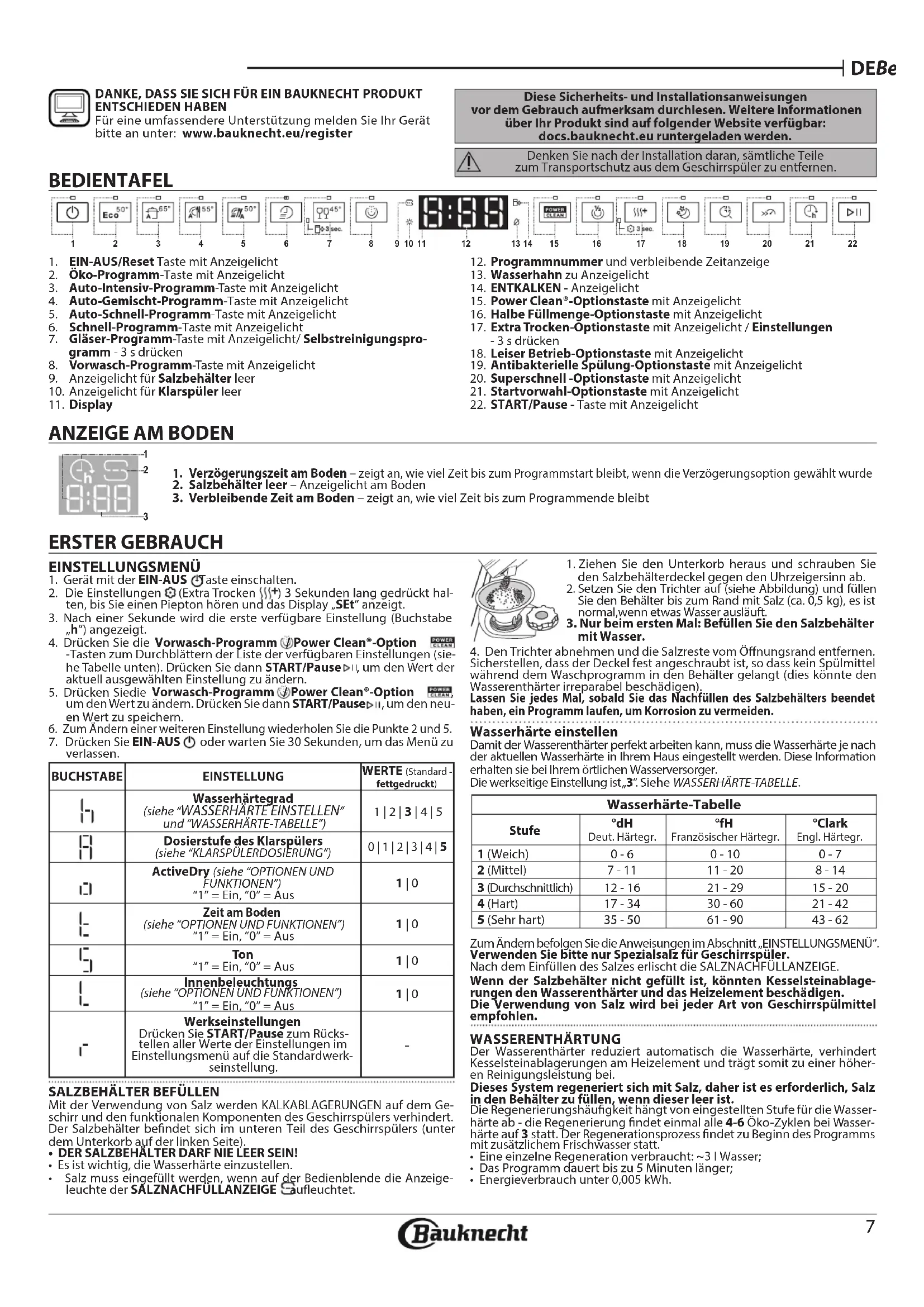 DANKE, DASS SIE SICH FÜR EIN BAUKNECHT PRODUKT ENTSCHIEDEN HABEN Für eine umfassendere Unterstützung melden Sie Ihr Gerät bitte an unter: www.bauknecht.eu/register ERSTER GEBRAUCH Diese Sicherheits- und Installationsanweisungen vor dem Gebrauch aufmerksam durchlesen. Weitere Informationen über Ihr Produkt sind auf folgender Website verfügbar: docs.bauknecht.eu runtergeladen werden. Denken Sie nach der Installation daran, sämtliche Teile zum Transportschutz aus dem Geschirrspüler zu entfernen. EINSTELLUNGSMENÜ