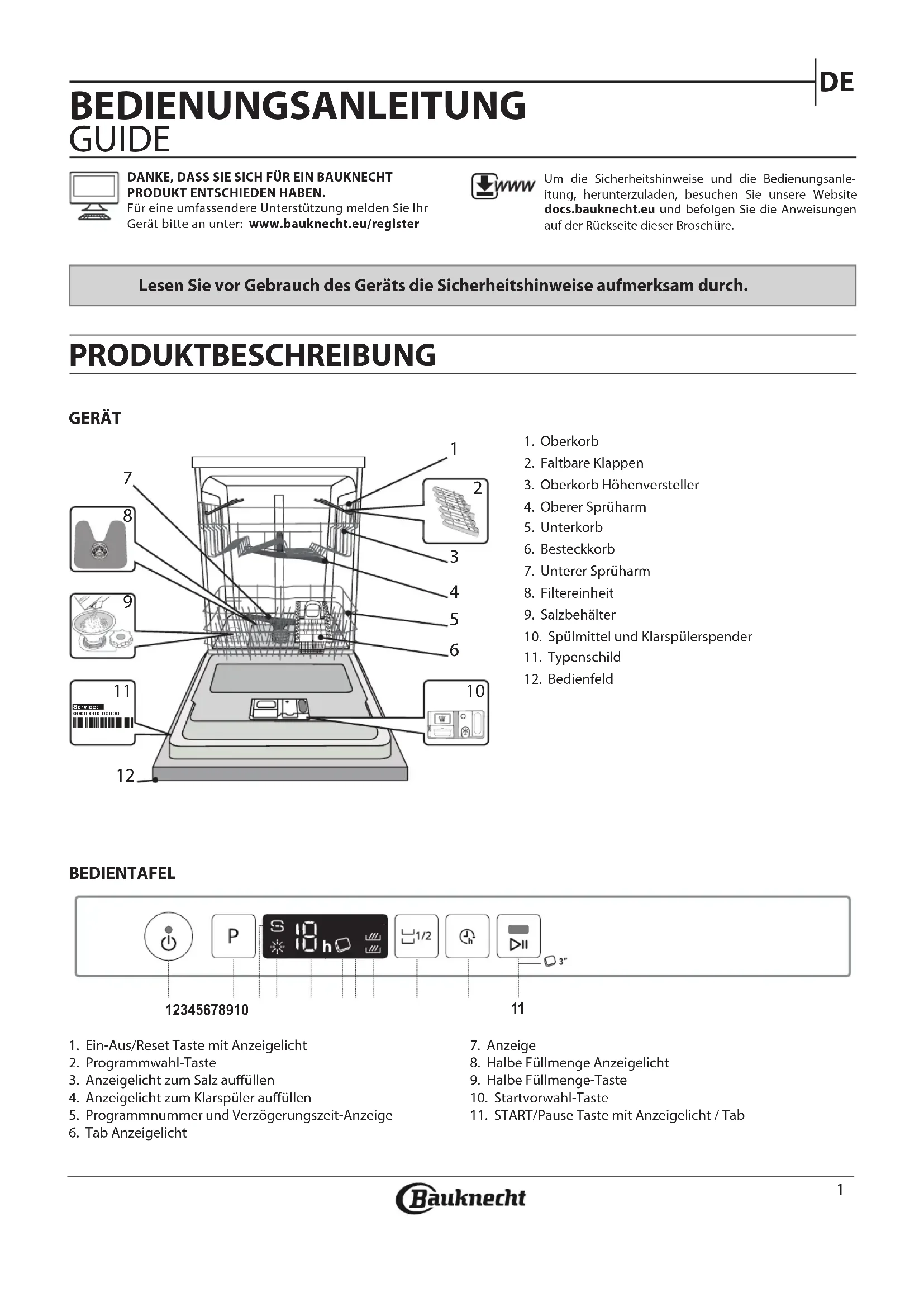 BEDIENUNGSANLEITUNG GUIDE Lesen Sie vor Gebrauch des Geräts die Sicherheitshinweise aufmerksam durch. PRODUKTBESCHREIBUNG GERÄT BEDIENTAFEL DANKE, DASS SIE SICH FÜR EIN BAUKNECHT PRODUKT ENTSCHIEDEN HABEN. Für eine umfassendere Unterstützung melden Sie Ihr Gerät bitte an unter: www.bauknecht.eu/registerUm die Sicherheitshinweise und die Bedienungsanle-itung, herunterzuladen, besuchen Sie unsere Website docs.bauknecht.eu und befolgen Sie die Anweisungen auf der Rückseite dieser Broschüre.1. Oberkorb2. Faltbare Klappen3. Oberkorb Höhenversteller4. Oberer Sprüharm5. Unterkorb6. Besteckkorb7. Unterer Sprüharm8. Filtereinheit9. Salzbehälter10. Spülmittel und Klarspülerspender11. Typenschild12. Bedienfeld1. Ein-Aus/Reset Taste mit Anzeigelicht2. Programmwahl-Taste3. Anzeigelicht zum Salz auüllen4. Anzeigelicht zum Klarspüler auüllen5. Programmnummer und Verzögerungszeit-Anzeige6. Tab Anzeigelicht7. Anzeige8. Halbe Füllmenge Anzeigelicht9. Halbe Füllmenge-Taste 10. Startvorwahl-Taste11. START/Pause Taste mit Anzeigelicht / Tab1 2 3 4 5 6 7 8 9 10 0000 000 00000 Service:
