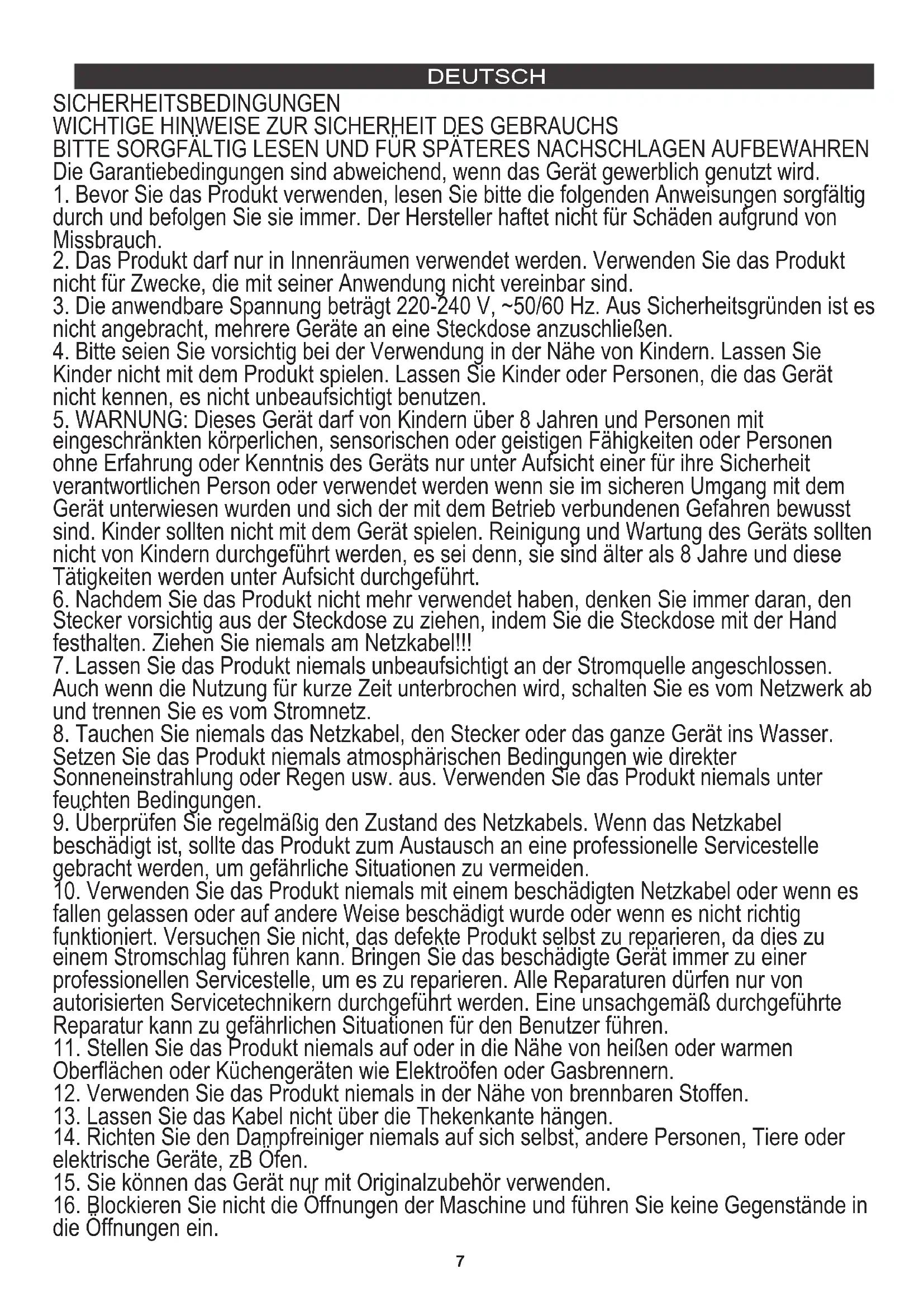 HINWEIS: Stellen Sie vor der Reinigung sicher, dass das Produkt ausgeschaltet und von der Stromversorgung getrennt wurde. Stellen Sie außerdem sicher, dass das Produkt und Komponenten/Zubehör abgekühlt sind. Schritt 1: Nach der Verwendung des Produkts muss das restliche Wasser im Wasserbehälter aus dem Gerät gegossen und an der Luft getrocknet werden, um Kalkbildung im Wasserbehälter zu vermeiden. Schritt 2: Verwenden Sie keine harten oder scharfen Gegenstände, um das Produkt oder andere Komponenten zu reinigen, um Schäden zu vermeiden. Schritt 3: Nehmen Sie das Tuch und verwenden Sie ein mildes Reinigungsmittel, um das Tuch gründlich zu reinigen. Lassen Sie es vor der weiteren Verwendung oder Lagerung gründlich an der Luft trocknen. Schritt 5: Verwenden Sie ein weiches, feuchtes Tuch, um das Maschinengehäuse, die Düse und alle anderen Zubehörteile zu reinigen. Verwenden Sie dann ein trockenes, weiches Tuch, um das Produkt trocken zu wischen. Schritt 4: Bewahren Sie das Produkt und das Zubehör an einem trockenen und kühlen Ort außerhalb der Reichweite von Kindern oder Tieren auf. Schritt 5: Wenn das Produkt längere Zeit nicht verwendet wird, können Sie das Produkt zerlegen. ANMERKUNGEN: Nach dem Abkühlen des Produkts wird heißer Dampf nach dem Abkühlen zu Wasserdampf. Etwas Wasserdampf wird sich in der Dampfdüse ansammeln und zu Wassertropfen werden, was ein normales Phänomen ist – lassen Sie es daher vollständig trocknen. Reinigungstücher können bei niedrigen Temperaturen (bis 30 C) in der Maschine gewaschen werden. Geben Sie keine Reinigungstücher in einen elektrischen Trockner. Lassen Sie es an der Luft trocknen. Das Reinigungstuch ist ein Verbrauchsartikel. Bitte ersetzen Sie es gegebenenfalls durch ein neues Reinigungstuch. Andernfalls wird die Effizienz des Geräts beeinträchtigt. Wenn sich das Reinigungstuch aufzulösen beginnt, schneiden Sie die losen Fäden bitte vorsichtig ab und ziehen Sie nicht daran. Kalk verstopft ist , mischen Sie einen Teil Zitronensäure mit drei Teilen Wasser. Gießen Sie diese Mischung in den Wasserbehälter und lassen Sie sie 6 Stunden stehen. Schalten Sie danach das Gerät über einer nicht zitronensäure-/wasserbeständigen Oberfläche ein. FEHLERBEHEBUNG Wenn es ein Problem mit Ihrem Produkt gibt, überprüfen Sie die folgenden Details, bevor Sie den Service anfordern zu Ihrem Händler. Ausgabe: Kein Dampf Mögliche Lösung: Überprüfen Sie, ob das Gerät an die Stromversorgung angeschlossen ist. Überprüfen Sie, ob sich der Netzschalter und der Dampfschalter in der Position ON befinden Überprüfen Sie den Wasserstand. Ausgabe: Funktioniert nicht Mögliche Lösung: Überprüfen Sie, ob der Netzschalter des Geräts eingeschaltet und das Kabel an die Stromversorgung angeschlossen ist. Ausgabe: Kalk verstopft Mögliche Lösung: Mischen Sie einen Teil Zitronensäure mit drei Teilen Wasser. Gießen Sie diese Mischung in den Wasserbehälter und lassen Sie sie 6 Stunden stehen. Schalten Sie das Gerät danach über einer nicht zitronensäure-/wasserbeständigen Oberfläche ein. Technische Daten: Stromversorgung: 220-240 V ~ 50/60 Hz Leistung: 1200 W10 Fassungsvermögen des Wasserbehälters: 120 ml Dampfleistung: ~ 22 ml/min Den Pappkarton im Altpapier entsorgen. Polyäthylenbeutel (PE) in dem Behälter für Kunststoff entsorgen. Das abgenutzte Gerät zum Recycling zu einer offiziellen Sammelstelle bringen, da es gefährliche Substanzen enthält, die die Umwelt gefährden können. Das Gerät sollte in einer Form abgegeben werden, die eine weitere Nutzung unmöglich macht. Wenn es Batterien enthält, sollten diese rausgenommen und separat an einer Sammelstelle abgegeben werden. Das Gerät darf nicht in den Hausmüll rausgeworfen werden!! FRANÇAIS