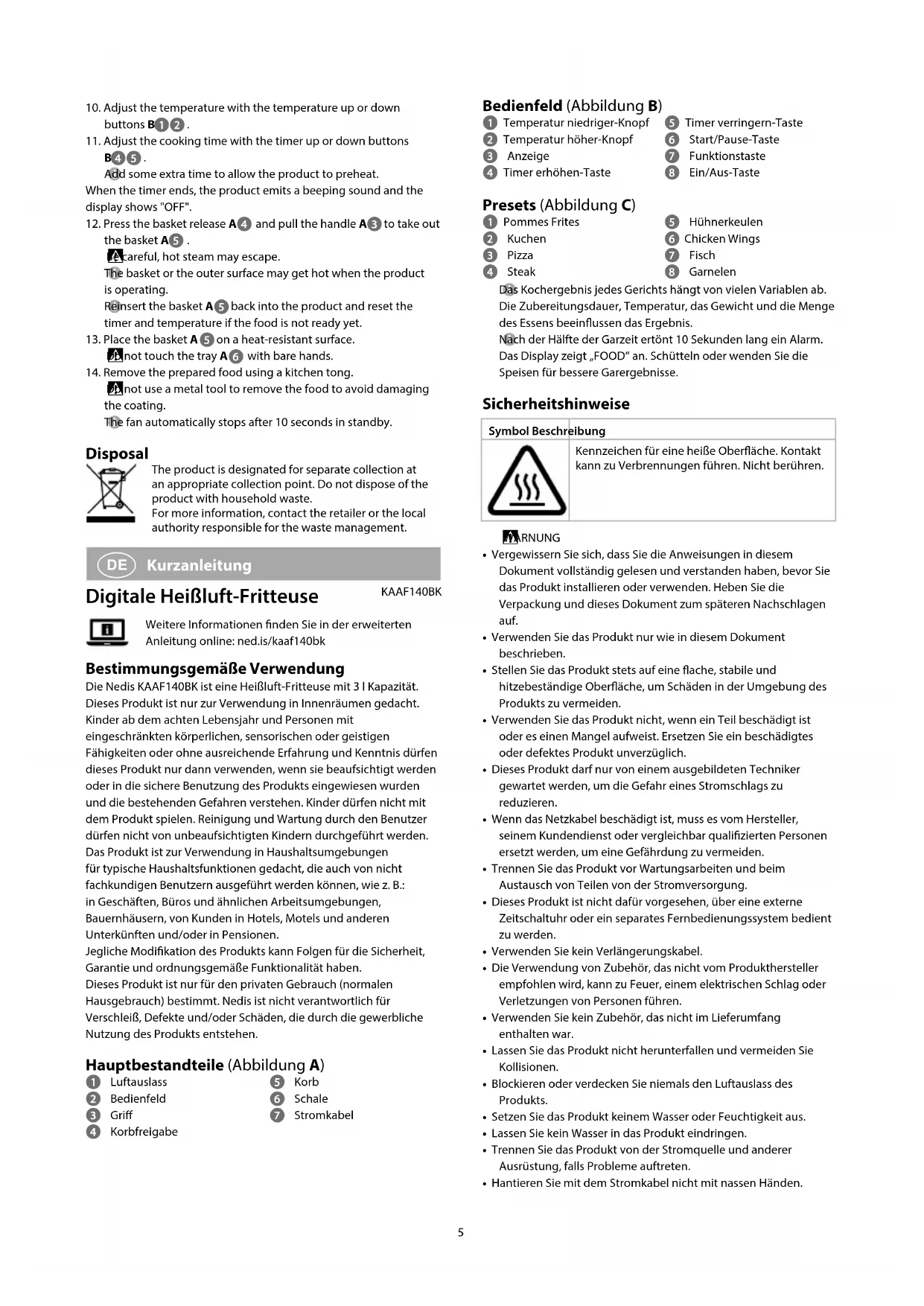 Kurzanleitung Digitale Heißluft-Fritteuse KAAF140BKWeitere Informationen nden Sie in der erweiterten Anleitung online: ned.is/kaaf140bk Bestimmungsgemäße Verwendung Die Nedis KAAF140BK ist eine Heißluft-Fritteuse mit 3l Kapazität.Dieses Produkt ist nur zur Verwendung in Innenräumen gedacht.Kinder ab dem achten Lebensjahr und Personen mit eingeschränkten körperlichen, sensorischen oder geistigen Fähigkeiten oder ohne ausreichende Erfahrung und Kenntnis dürfen dieses Produkt nur dann verwenden, wenn sie beaufsichtigt werden oder in die sichere Benutzung des Produkts eingewiesen wurden und die bestehenden Gefahren verstehen. Kinder dürfen nicht mit dem Produkt spielen. Reinigung und Wartung durch den Benutzer dürfen nicht von unbeaufsichtigten Kindern durchgeführt werden.Das Produkt ist zur Verwendung in Haushaltsumgebungen für typische Haushaltsfunktionen gedacht, die auch von nicht fachkundigen Benutzern ausgeführt werden können, wie z.B.: in Geschäften, Büros und ähnlichen Arbeitsumgebungen, Bauernhäusern, von Kunden in Hotels, Motels und anderen Unterkünften und/oder in Pensionen.Jegliche Modikation des Produkts kann Folgen für die Sicherheit, Garantie und ordnungsgemäße Funktionalität haben.Dieses Produkt ist nur für den privaten Gebrauch (normalen Hausgebrauch) bestimmt. Nedis ist nicht verantwortlich für Verschleiß, Defekte und/oder Schäden, die durch die gewerbliche Nutzung des Produkts entstehen. Hauptbestandteile (Abbildung A) 1 Luftauslass2 Bedienfeld3 Gri4 Korbfreigabe5 Korb6 Schale7 Stromkabel Bedienfeld (Abbildung B) 1 Temperatur niedriger-Knopf2 Temperatur höher-Knopf3 Anzeige4 Timer erhöhen-Taste5 Timer verringern-Taste6 Start/Pause-Taste7 Funktionstaste8 Ein/Aus-Taste Presets (Abbildung C) 1 Pommes Frites2 Kuchen3 Pizza4 Steak5 Hühnerkeulen6 Chicken Wings7 Fisch8 Garnelen Das Kochergebnis jedes Gerichts hängt von vielen Variablen ab. Die Zubereitungsdauer, Temperatur, das Gewicht und die Menge des Essens beeinussen das Ergebnis. Nach der Hälfte der Garzeit ertönt 10 Sekunden lang ein Alarm. Das Display zeigt „FOOD“ an. Schütteln oder wenden Sie die Speisen für bessere Garergebnisse. Sicherheitshinweise Symbol BeschreibungKennzeichen für eine heiße Oberäche. Kontakt kann zu Verbrennungen führen. Nicht berühren. WARNUNG• Vergewissern Sie sich, dass Sie die Anweisungen in diesem Dokument vollständig gelesen und verstanden haben, bevor Sie das Produkt installieren oder verwenden. Heben Sie die Verpackung und dieses Dokument zum späteren Nachschlagen auf.