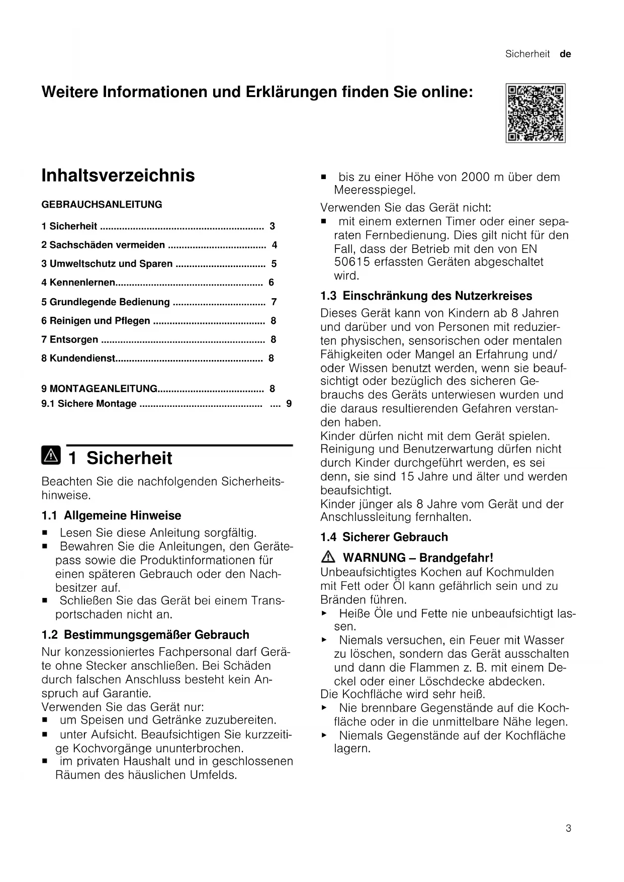 1 Sicherheit Beachten Sie die nachfolgenden Sicherheits- hinweise. 1.1 Allgemeine Hinweise ¡ Lesen Sie diese Anleitung sorgfältig. ¡ Bewahren Sie die Anleitungen, den Geräte- pass sowie die Produktinformationen für einen späteren Gebrauch oder den Nach- besitzer auf. ¡ Schließen Sie das Gerät bei einem Trans- portschaden nicht an. 1.2 Bestimmungsgemäßer Gebrauch Nur konzessioniertes Fachpersonal darf Gerä- te ohne Stecker anschließen. Bei Schäden durch falschen Anschluss besteht kein An- spruch auf Garantie. Verwenden Sie das Gerät nur: ¡ um Speisen und Getränke zuzubereiten. ¡ unter Aufsicht. Beaufsichtigen Sie kurzzeiti- ge Kochvorgänge ununterbrochen. ¡ im privaten Haushalt und in geschlossenen Räumen des häuslichen Umfelds. ¡ bis zu einer Höhe von 2000m über dem Meeresspiegel. Verwenden Sie das Gerät nicht: ¡ mit einem externen Timer oder einer sepa- raten Fernbedienung. Dies gilt nicht für den Fall, dass der Betrieb mit den von EN 50615 erfassten Geräten abgeschaltet wird. 1.3 Einschränkung des Nutzerkreises Dieses Gerät kann von Kindern ab 8 Jahren und darüber und von Personen mit reduzier- ten physischen, sensorischen oder mentalen Fähigkeiten oder Mangel an Erfahrung und/ oder Wissen benutzt werden, wenn sie beauf- sichtigt oder bezüglich des sicheren Ge- brauchs des Geräts unterwiesen wurden und die daraus resultierenden Gefahren verstan- den haben. Kinder dürfen nicht mit dem Gerät spielen. Reinigung und Benutzerwartung dürfen nicht durch Kinder durchgeführt werden, es sei denn, sie sind 15 Jahre und älter und werden beaufsichtigt. Kinder jünger als 8 Jahre vom Gerät und der Anschlussleitung fernhalten. 1.4 Sicherer Gebrauch WARNUNG‒Brandgefahr! Unbeaufsichtigtes Kochen auf Kochmulden mit Fett oder Öl kann gefährlich sein und zu Bränden führen. ▶ Heiße Öle und Fette nie unbeaufsichtigt las- sen. ▶ Niemals versuchen, ein Feuer mit Wasser zu löschen, sondern das Gerät ausschalten und dann die Flammen z. B. mit einem De- ckel oder einer Löschdecke abdecken. Die Kochfläche wird sehr heiß. ▶ Nie brennbare Gegenstände auf die Koch- fläche oder in die unmittelbare Nähe legen. ▶ Niemals Gegenstände auf der Kochfläche lagern.de Sachschäden vermeiden