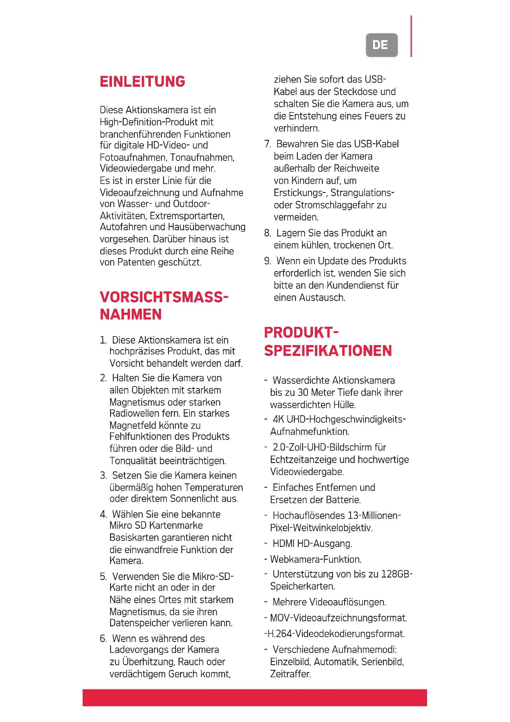 erforderlich ist, wenden Sie sich bitte an den Kundendienst für einen Austausch. PRODUKT- SPEZIFIKATIONEN - Wasserdichte Aktionskamera bis zu 30 Meter Tiefe dank ihrer wasserdichten Hülle. - 4K UHD-Hochgeschwindigkeits- Aufnahmefunktion. - 2.0-Zoll-UHD-Bildschirm für Echtzeitanzeige und hochwertige Videowiedergabe. - Einfaches Entfernen und Ersetzen der Batterie. - Hochauflösendes 13-Millionen- Pixel-Weitwinkelobjektiv. - HDMI HD-Ausgang. - Webkamera-Funktion. - Unterstützung von bis zu 128GB- Speicherkarten. - Mehrere Videoauflösungen. - MOV-Videoaufzeichnungsformat. - H.264-Videodekodierungsformat. - Verschiedene Aufnahmemodi: Einzelbild, Automatik, Serienbild, Zeitraffer.DE - Ultra-kompaktes und nüchternes Design. - Neueste Fernsteuerungstechnologie über WLAN auf Android- oder iOS-Smartphones mit der iSmart DV app (erhältlich im Google Play Store und im App Store).