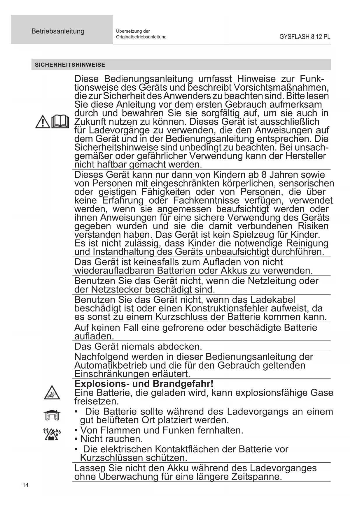 - Environment-related faults (such as pollution, rust and dust). In the event of a breakdown, please return the appliance to your distributor, along with: - a dated proof of purchase (receipt or invoice etc.). a note explaining the malfunction.14 Betriebsanleitung GYSFLASH 8.12 PL Übersetzung der Originalbetriebsanleitung SICHERHEITSHINWEISE Diese Bedienungsanleitung umfasst Hinweise zur Funk- tionsweise des Geräts und beschreibt Vorsichtsmaßnahmen, die zur Sicherheit des Anwenders zu beachten sind. Bitte lesen Sie diese Anleitung vor dem ersten Gebrauch aufmerksam durch und bewahren Sie sie sorgfältig auf, um sie auch in Zukunft nutzen zu können. Dieses Gerät ist ausschließlich für Ladevorgänge zu verwenden, die den Anweisungen auf dem Gerät und in der Bedienungsanleitung entsprechen. Die Sicherheitshinweise sind unbedingt zu beachten. Bei unsach- gemäßer oder gefährlicher Verwendung kann der Hersteller nicht haftbar gemacht werden. Dieses Gerät kann nur dann von Kindern ab 8 Jahren sowie von Personen mit eingeschränkten körperlichen, sensorischen oder geistigen Fähigkeiten oder von Personen, die über keine Erfahrung oder Fachkenntnisse verfügen, verwendet werden, wenn sie angemessen beaufsichtigt werden oder ihnen Anweisungen für eine sichere Verwendung des Geräts gegeben wurden und sie die damit verbundenen Risiken verstanden haben. Das Gerät ist kein Spielzeug für Kinder. Es ist nicht zulässig, dass Kinder die notwendige Reinigung und Instandhaltung des Geräts unbeaufsichtigt durchführen. Das Gerät ist keinesfalls zum Auaden von nicht wiederauadbaren Batterien oder Akkus zu verwenden. Benutzen Sie das Gerät nicht, wenn die Netzleitung oder der Netzstecker beschädigt sind. Benutzen Sie das Gerät nicht, wenn das Ladekabel beschädigt ist oder einen Konstruktionsfehler aufweist, da es sonst zu einem Kurzschluss der Batterie kommen kann. Auf keinen Fall eine gefrorene oder beschädigte Batterie auaden. Das Gerät niemals abdecken. Nachfolgend werden in dieser Bedienungsanleitung der Automatikbetrieb und die für den Gebrauch geltenden Einschränkungen erläutert. Explosions- und Brandgefahr! Eine Batterie, die geladen wird, kann explosionsfähige Gase freisetzen.