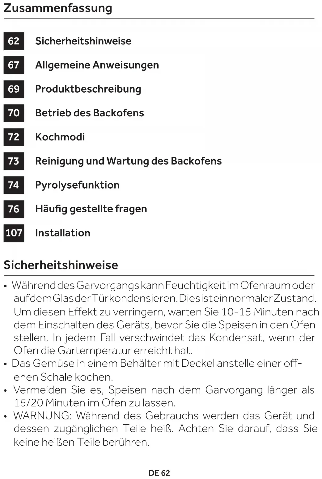 Sicherheitshinweise Allgemeine Anweisungen Produktbeschreibung Betrieb des Backofens Kochmodi Reinigung und Wartung des Backofens Pyrolysefunktion Häug gestellte fragen Installation Zusammenfassung