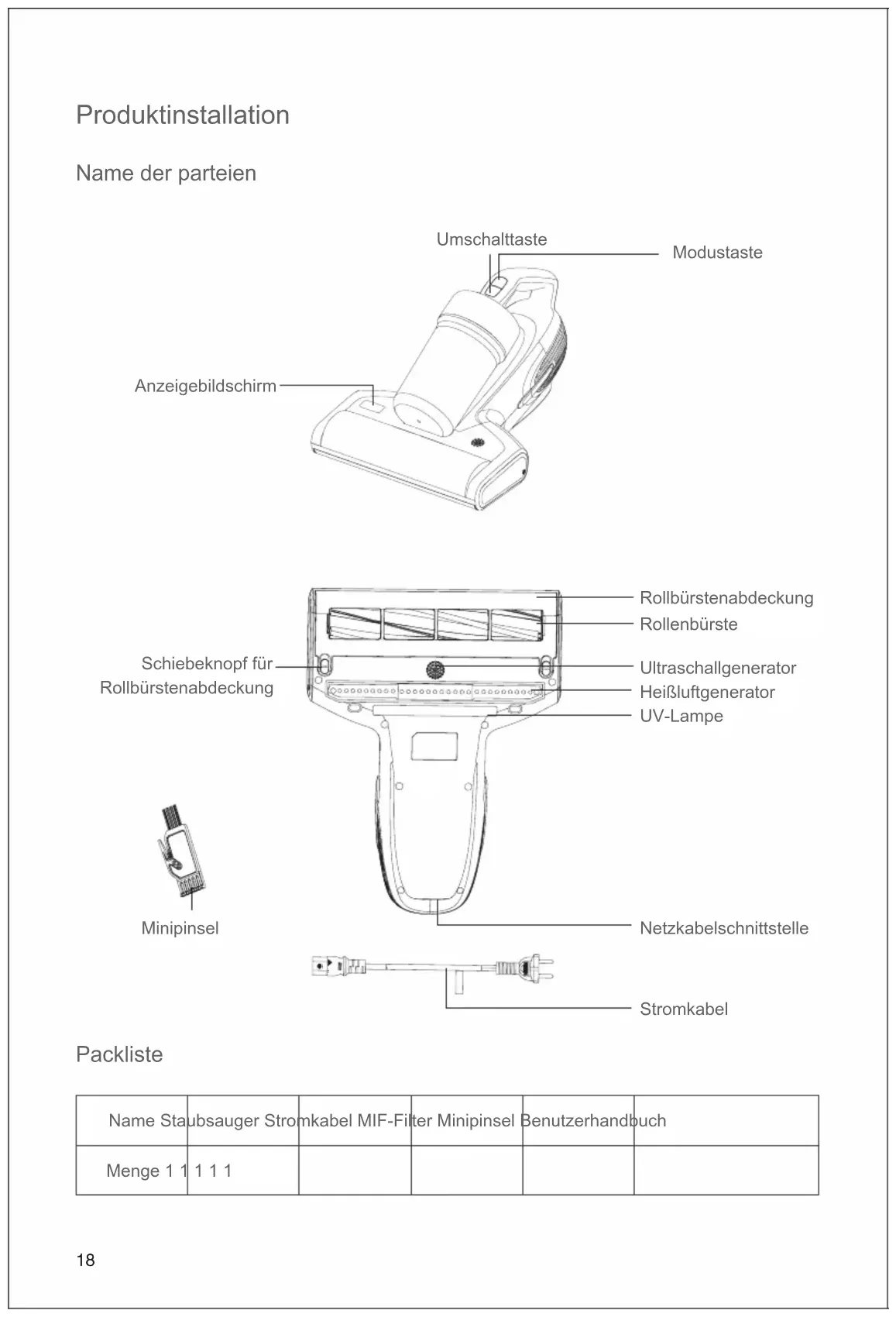 Vakuum Lampenschirm Bürstenreinigung und Installation Schalten Sie die Maschine aus und ziehen Sie den Netzstecker, schieben und drücken Sie den Schiebeknopf der Bürstenabdeckung von Hand, um ihn vom geschlossenen Zustand in den geöffneten Zustand zu bringen (Abbildung 8), dann drehen Sie die Bürstenabdeckung und ziehen Sie die Walze heraus Bürstenanordnung (Abbildung 9), d. h. kann gereinigt werden. Installieren Sie nach dem Reinigen der Bürstenrolle die Bürstenrolleneinheit und die Bürstenabdeckung nacheinander in das Gehäuse (Abbildung 10) und verriegeln Sie den Bürstenrollenschieber. (Abbildung 11) Anmerkungen:Achten Sie beim Reinigen der Bürstenrolle darauf, die Stromversorgung zu trennen, um eine versehentliche Aktivierung der Bürstenrolle und Verletzungen zu vermeiden. Tägliche Wartung und Lagerung Es wird empfohlen, den Staubbecher und die MIF-Filterwatte nach jedem Gebrauch für den nächsten Gebrauch zu reinigen. Wenn der Staubbecher während des Gebrauchs voller Staub ist, wird empfohlen, ihn sofort zu reinigen, da sonst der Gebrauchseffekt beeinträchtigt wird; Nachdem die kumulative Nutzungszeit des MIF-Filters 30h-50h erreicht hat (je nach Verwendung des MIF-Filters), wird empfohlen, den MIF-Filter an der dafür vorgesehenen Stelle zu kaufen und zu ersetzen, um die Leistung des Geräts nicht zu beeinträchtigen. Die Durchdringung ultravioletter Strahlen ist schwach, und jedes Papier, gewöhnliches Glas oder Kunststoff verringert die Intensität der ultravioletten Strahlung erheblich. Darüber hinaus wirken sich die Staub- und Ölflecken auf der unteren transparenten Abdeckung direkt auf die Durchdringungsfähigkeit aus, daher sollte die transparente Abdeckung regelmäßig abgewischt und gereinigt werden, um das Eindringen und die Stärke der ultravioletten Strahlen nicht zu beeinträchtigen. Berühren Sie die transparente Abdeckung nicht mit den Fingern, da Flecken das Eindringen von ultravioletten Strahlen beeinträchtigen. Wenn Sie das Gerät längere Zeit nicht benutzen, stellen Sie es bitte an einem kühlen und trockenen Ort auf und stellen Sie es nicht direktem Sonnenlicht oder einer feuchten Umgebung aus. Der staubempfindliche transparente Lampenschirm im Luftkanal muss regelmäßig gereinigt und abgewischt werden, um die Übertragung und den Empfang von Infrarotsignalen nicht zu beeinträchtigen. (Abbildung 12)22 Vorsichtsmaßnahmen Lesen Sie diese Bedienungsanleitung vor dem Gebrauch sorgfältig durch und bewahren Sie sie zur späteren Verwendung an einem sicheren Ort auf. Lassen Sie die Maschine niemals unbeaufsichtigt laufen. Bitte schalten Sie den Netzschalter aus und ziehen Sie den Netzstecker, wenn das Gerät inaktiv sein soll. Ziehen Sie das Netzkabel bei einem Stromschlag nicht mit nassen Händen heraus. Schalten Sie die Stromquelle während der Wartung oder bei Außerbetriebnahme aus. Halten Sie die Stromleitung von scharfen Gegenständen fern und ziehen Sie das Kabel nicht heraus, um die Maschine zu bewegen, wenn das Kabel beschädigt ist. Verwenden Sie das Produkt aus Sicherheitsgründen nicht zum Reinigen von heißen Gegenständen wie Kohlenstoff, Zigarettenkippen, scharfen Gegenständen, Glasscherben, ätzenden Flüssigkeiten, brennbaren und explosiven Stoffen, Benzin und Alkohol Dies kann das Produkt beschädigen oder einen Brand verursachen. Verwenden Sie dieses Produkt nicht zum Reinigen von Wasser oder feuchtem Staub. Verwenden Sie es nicht an feuchten Orten (z. B. Bad, WC, Wäsche usw.), um Störungen zu vermeiden. Stellen Sie das Gerät nicht in der Nähe von Heizkörpern auf und setzen Sie es bei Brandgefahr keinem direkten Sonnenlicht aus. Halten Sie dieses Produkt von besonderen Personen wie Kindern fern, die nicht von Erwachsenen beaufsichtigt werden. Betreiben Sie die Maschine nicht mit blockierter Ansaugöffnung, wenn das Produkt beschädigt ist. Das Produkt ist mit UV-Licht ausgestattet. Schauen Sie aus Sicherheitsgründen nicht auf den Boden des Geräts, wenn die UV-Strahlung eingeschaltet ist. Wenden Sie dieses Produkt nicht auf Panzen an, um übermäßige UV-Schäden und Schäden an Gegenständen zu vermeiden. Setzen Sie sich NICHT auf dieses Produkt, um eine Beschädigung des Produkts zu vermeiden. Entfernen Sie nicht die Bürstenwalzenabdeckung und drücken Sie die Abdeckung nicht nach außen, während die Maschine eingeschaltet oder in Betrieb ist. Dieses Produkt darf NUR zur Reinigung von Textilien wie Matratzen, Decken, Kissen, Sofas usw. verwendet werden. Wenn die Stromleitung beschädigt ist, wenden Sie sich an den Hersteller und andere Sicherheitsexperten.23 Fehlerbehebung Wenn der Fehler nach den folgenden Lösungen weiterhin besteht, wenden Sie sich sofort an den Kundendienst oder den örtlichen Händler. Schwierigkeiten Mögliche Gründe Lösung Lebensmitt- elversagen Die Stromleitung ist nicht fest eingesteckt. Stecken Sie die Stromleitung fest ein. Kein Strom an der Steckdose. Überprüfen Sie die Steckdose. Interrupteur d’alimentation non ap- puyé. Appuyez sur le bouton Marche / Arrêt. Niedrige Saugleistung Überprüfen Sie die Steckdose. Sauganschluss reinigen. Ansammlung von Staub auf dem Filter. Reinigen Sie den Filter. Staubansammlung auf dem Zyk- lon. Reinigen Sie den Zyklon. UV-Röhren- versagen Die UV-Funktion wird aus Sich- erheitsgründen oder zur Verrin- gerung der Reexion des Objekts automatisch deaktiviert. Die UV-Funktion funktioniert bei einer Höhe des Objekts von weni- ger als 3 cm. Die Maschine arbeitet lange in der gleichen Position. Bewegen Sie die Maschine vor- wärts und rückwärts. Die Maschine steht senkrecht. Die Maschine kippte nicht mehr als 30 Grad. Das Sensorfenster ist ver- schmutzt. Reinigen Sie das Sensorfenster mit einem halbtrockenen Tuch. UV-Lichtschäden. Wenden Sie sich an den Kunden- dienst. Schaltet sich automatisch aus Der Staubbecher ist voll. Die Maschine stoppt automatisch, um zu verhindern, dass der Motor längere Zeit läuft. Wenn sich die Maschine automatisch ab