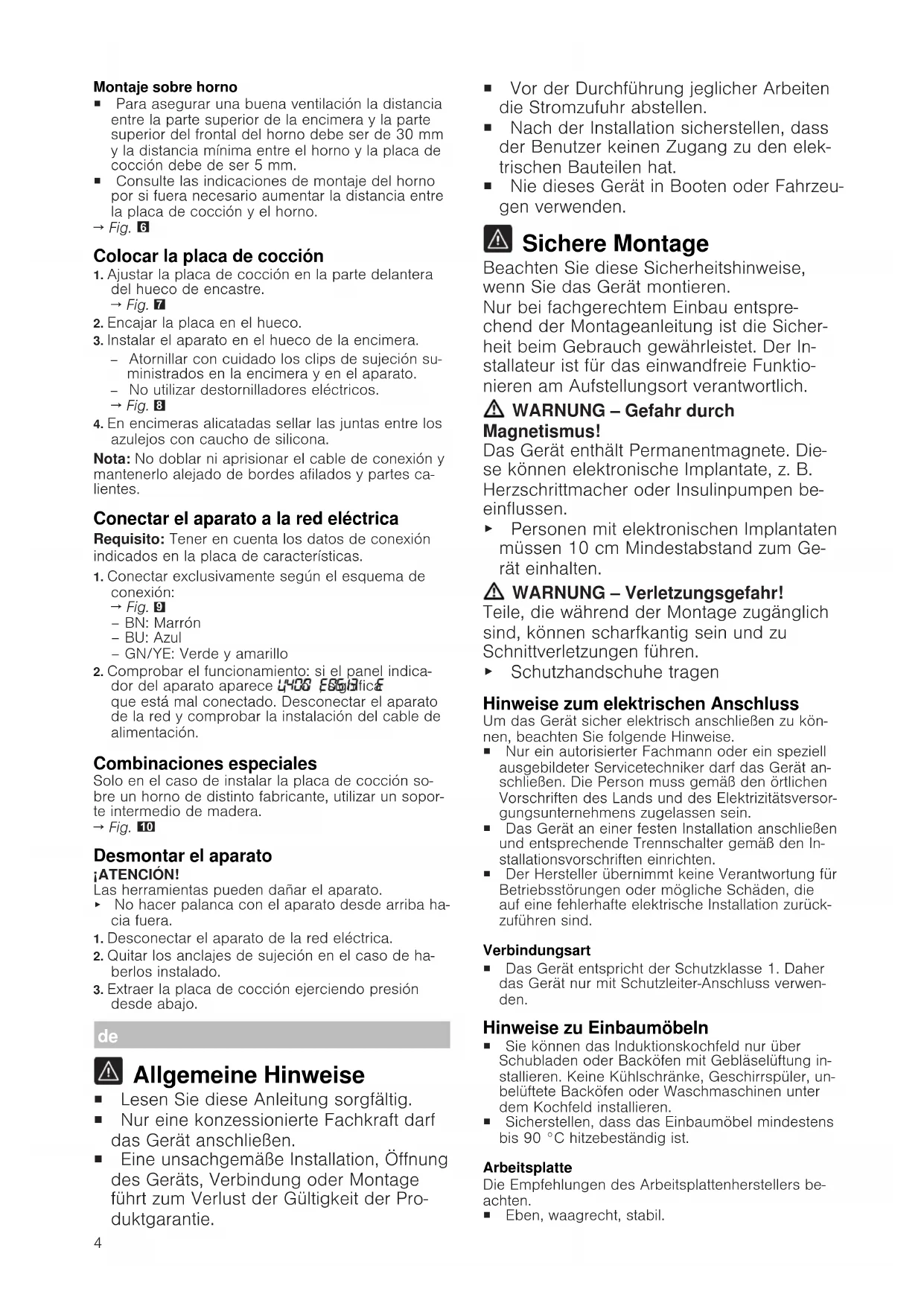 Allgemeine Hinweise ¡ Lesen Sie diese Anleitung sorgfältig. ¡ Nur eine konzessionierte Fachkraft darf das Gerät anschließen. ¡ Eine unsachgemäße Installation, Öffnung des Geräts, Verbindung oder Montage führt zum Verlust der Gültigkeit der Pro- duktgarantie. ¡ Vor der Durchführung jeglicher Arbeiten die Stromzufuhr abstellen. ¡ Nach der Installation sicherstellen, dass der Benutzer keinen Zugang zu den elek- trischen Bauteilen hat. ¡ Nie dieses Gerät in Booten oder Fahrzeu- gen verwenden. Sichere Montage Beachten Sie diese Sicherheitshinweise, wenn Sie das Gerät montieren. Nur bei fachgerechtem Einbau entspre- chend der Montageanleitung ist die Sicher- heit beim Gebrauch gewährleistet. Der In- stallateur ist für das einwandfreie Funktio- nieren am Aufstellungsort verantwortlich. WARNUNG‒Gefahr durch Magnetismus! Das Gerät enthält Permanentmagnete. Die- se können elektronische Implantate, z.B. Herzschrittmacher oder Insulinpumpen be- einflussen. ▶ Personen mit elektronischen Implantaten müssen 10cm Mindestabstand zum Ge- rät einhalten. WARNUNG‒Verletzungsgefahr! Teile, die während der Montage zugänglich sind, können scharfkantig sein und zu Schnittverletzungen führen. ▶ Schutzhandschuhe tragen Hinweise zum elektrischen Anschluss Um das Gerät sicher elektrisch anschließen zu kön- nen, beachten Sie folgende Hinweise. ¡ Nur ein autorisierter Fachmann oder ein speziell ausgebildeter Servicetechniker darf das Gerät an- schließen. Die Person muss gemäß den örtlichen Vorschriften des Lands und des Elektrizitätsversor- gungsunternehmens zugelassen sein. ¡ Das Gerät an einer festen Installation anschließen und entsprechende Trennschalter gemäß den In- stallationsvorschriften einrichten. ¡ Der Hersteller übernimmt keine Verantwortung für Betriebsstörungen oder mögliche Schäden, die auf eine fehlerhafte elektrische Installation zurück- zuführen sind. Verbindungsart ¡ Das Gerät entspricht der Schutzklasse 1. Daher das Gerät nur mit Schutzleiter-Anschluss verwen- den. Hinweise zu Einbaumöbeln ¡ Sie können das Induktionskochfeld nur über Schubladen oder Backöfen mit Gebläselüftung in- stallieren. Keine Kühlschränke, Geschirrspüler, un- belüftete Backöfen oder Waschmaschinen unter dem Kochfeld installieren. ¡ Sicherstellen, dass das Einbaumöbel mindestens bis 90°C hitzebeständig ist. Arbeitsplatte Die Empfehlungen des Arbeitsplattenherstellers be- achten. ¡ Eben, waagrecht, stabil.5 ¡ Die Arbeitsplatte, in die Sie das Gerät einbauen, muss Belastungen von ca. 60kg standhalten. ¡ Bei dünnen Arbeitsplatten ein hitzebeständiges und feuchtigkeitsbeständiges Verstärkungsmateri- al verwenden. ¡ Die Ebenheit des Kochfelds erst überprüfen, wenn es eingebaut ist. Dunstabzugshaube ¡ Der Abstand zwischen der Dunstabzugshaube und dem Kochfeld muss mindestens dem Ab- stand entsprechen, der in der Montageanleitung für die Dunstabzugshaube angegeben ist. Vorbereitung der Einbaumöbel