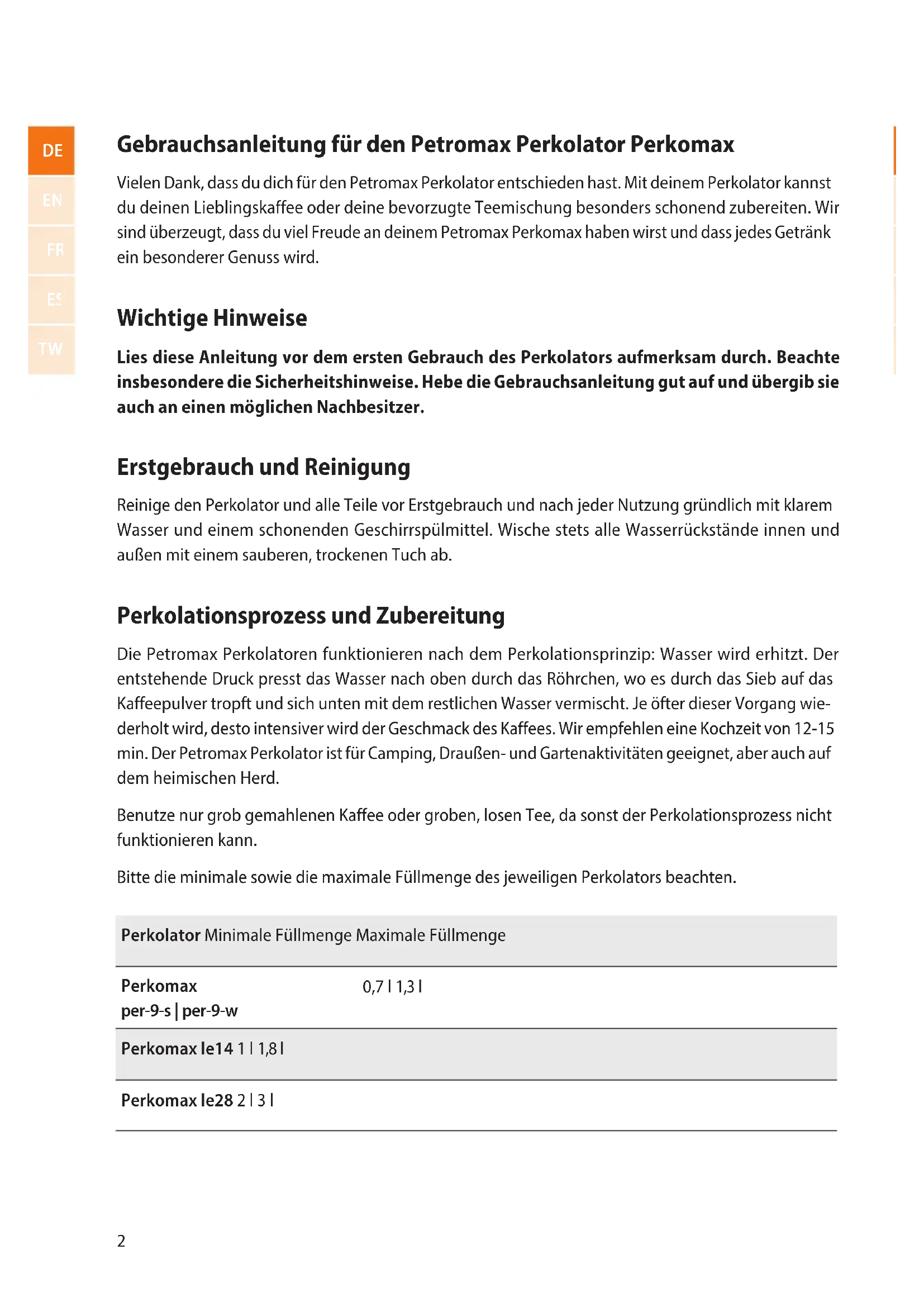 Gebrauchsanleitung für den Petromax Perkolator Perkomax Vielen Dank, dass du dich für den Petromax Perkolator entschieden hast. Mit deinem Perkolator kannst du deinen Lieblingskaffee oder deine bevorzugte Teemischung besonders schonend zubereiten. Wir sind überzeugt, dass du viel Freude an deinem Petromax Perkomax haben wirst und dass jedes Getränk ein besonderer Genuss wird. Wichtige Hinweise Lies diese Anleitung vor dem ersten Gebrauch des Perkolators aufmerksam durch. Beachte insbesondere die Sicherheitshinweise. Hebe die Gebrauchsanleitung gut auf und übergib sie auch an einen möglichen Nachbesitzer. Erstgebrauch und Reinigung Reinige den Perkolator und alle Teile vor Erstgebrauch und nach jeder Nutzung gründlich mit klarem Wasser und einem schonenden Geschirrspülmittel. Wische stets alle Wasserrückstände innen und außen mit einem sauberen, trockenen Tuch ab. Perkolationsprozess und Zubereitung Die Petromax Perkolatoren funktionieren nach dem Perkolationsprinzip: Wasser wird erhitzt. Der entstehende Druck presst das Wasser nach oben durch das Röhrchen, wo es durch das Sieb auf das Kaffeepulver tropft und sich unten mit dem restlichen Wasser vermischt. Je öfter dieser Vorgang wie- derholt wird, desto intensiver wird der Geschmack des Kaffees. Wir empfehlen eine Kochzeit von 12-15 min. Der Petromax Perkolator ist für Camping, Draußen- und Gartenaktivitäten geeignet, aber auch auf dem heimischen Herd. Benutze nur grob gemahlenen Kaffee oder groben, losen Tee, da sonst der Perkolationsprozess nicht funktionieren kann. Bitte die minimale sowie die maximale Füllmenge des jeweiligen Perkolators beachten. Perkolator Minimale Füllmenge Maximale Füllmenge Perkomax per-9-s | per-9-w 0,7 l 1,3 l Perkomax le14 1 l 1,8 l Perkomax le28 2 l 3 l3
