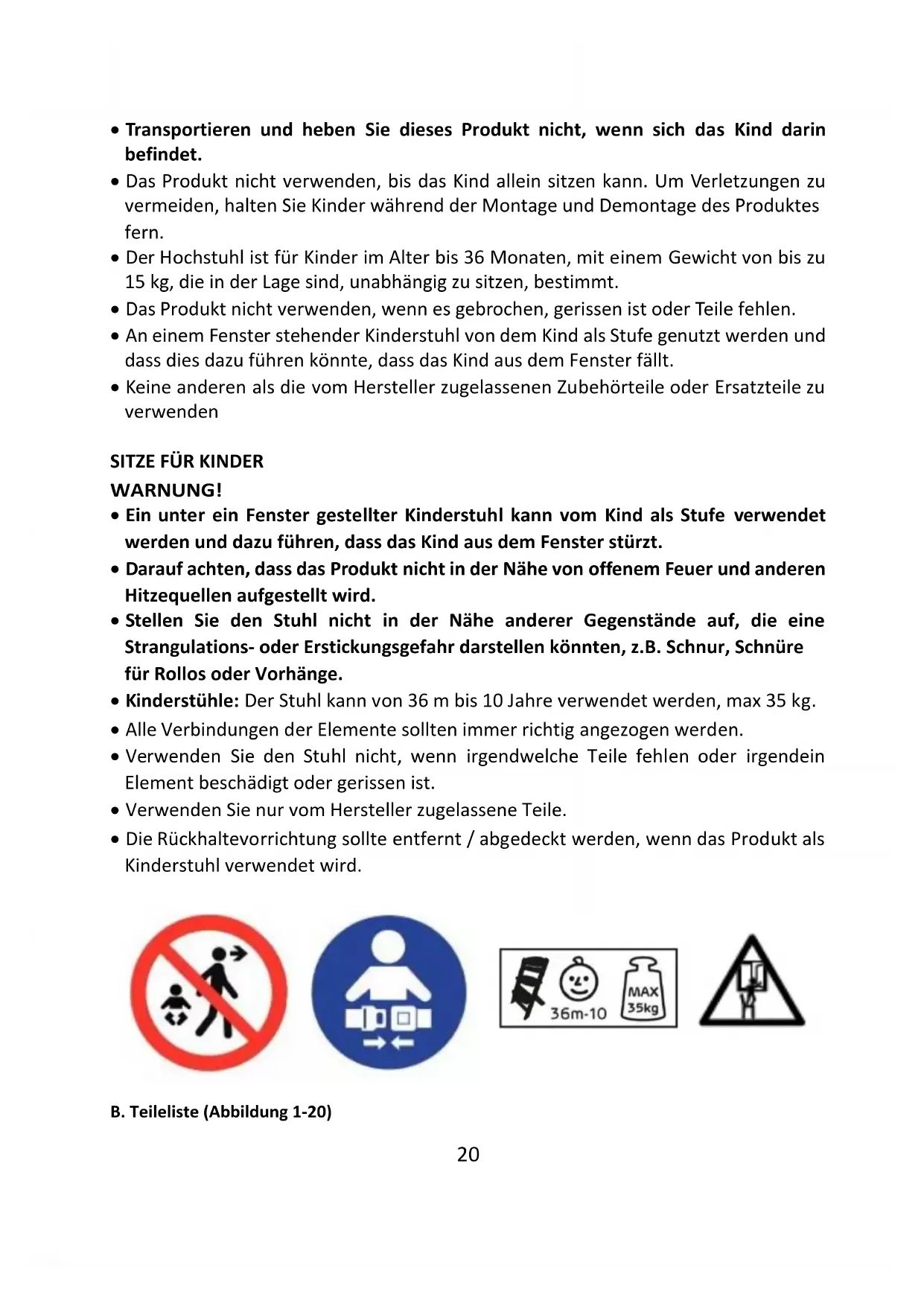 - Kinderstühle: Der Stuhl kann von 36 m bis 10 Jahre verwendet werden, max 35 kg.