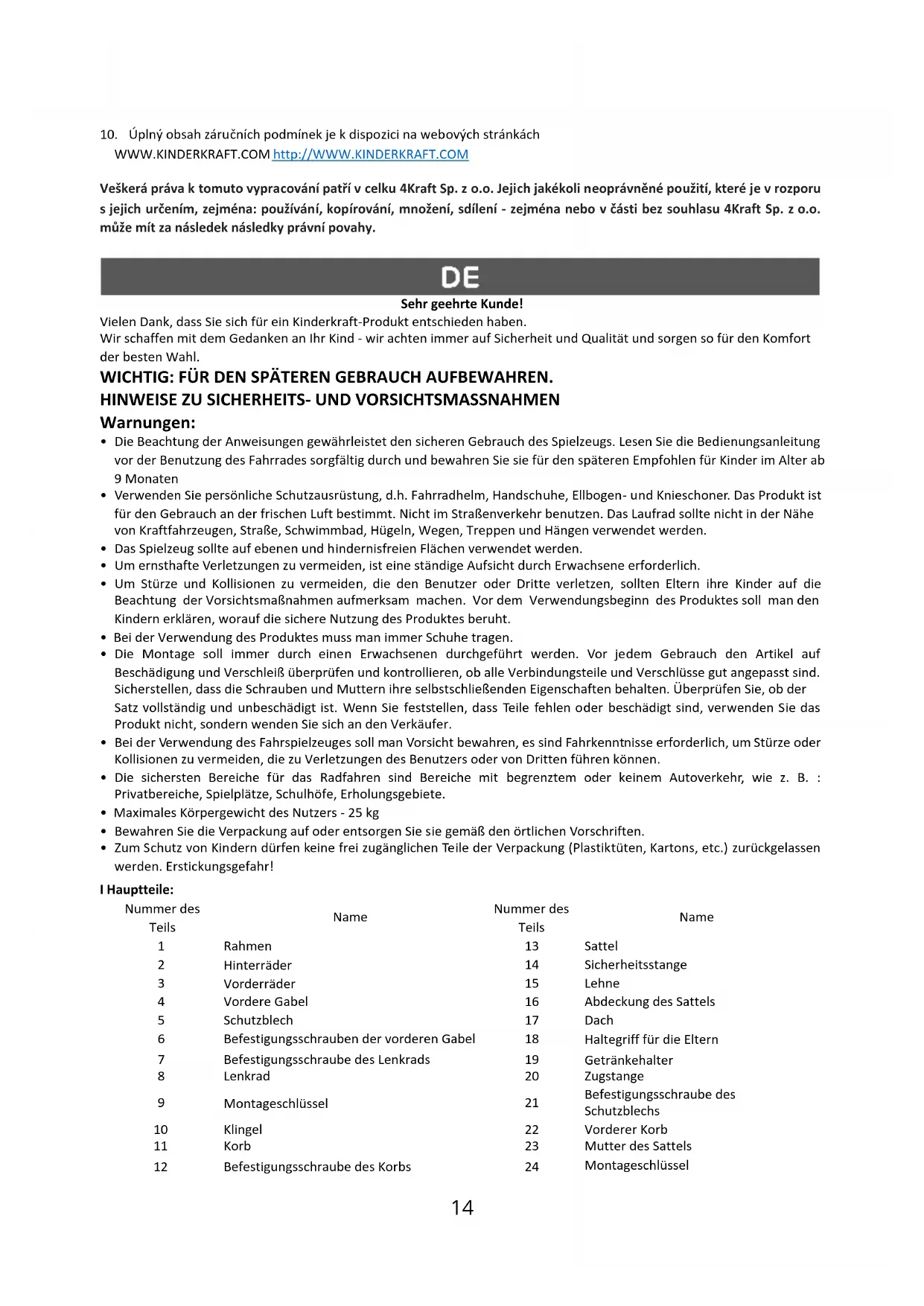 WWW.KINDERKRAFT.COM verfügbar. Alle Rechte an dieser Studie liegen vollständig bei 4Kraft Sp. z o.o. Jede nicht autorisierte Verwendung, die ihrem beabsichtigten Zweck widerspricht, insbesondere: Verwendung, Kopieren, Reproduktion, Weitergabe - ganz oder teilweise ohne Zustimmung von 4Kraft Sp. z o.o. kann rechtliche Konsequenzen haben. Dear customer Thank you for purchasing a Kinderkraft product. We design our bicycles with your child in mind - we always care about safety and quality, which guarantees that with the purchase of our products you get the comfort of the best possible choice. IT IS IMPORTANT TO KEEP THIS MANUAL FOR FUTURE USE.
