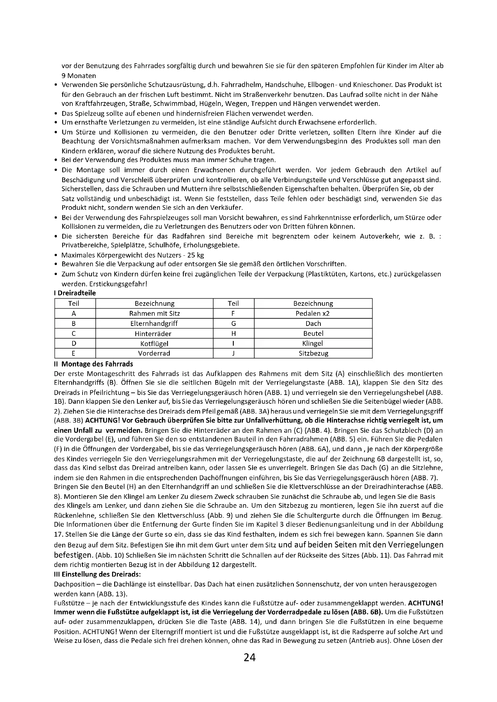 - Die Beachtung der Anweisungen gewährleistet den sicheren Gebrauch des Spielzeugs. Lesen Sie die Bedienungsanleitung24 vor der Benutzung des Fahrrades sorgfältig durch und bewahren Sie sie für den späteren Empfohlen für Kinder im Alter ab 9 Monaten