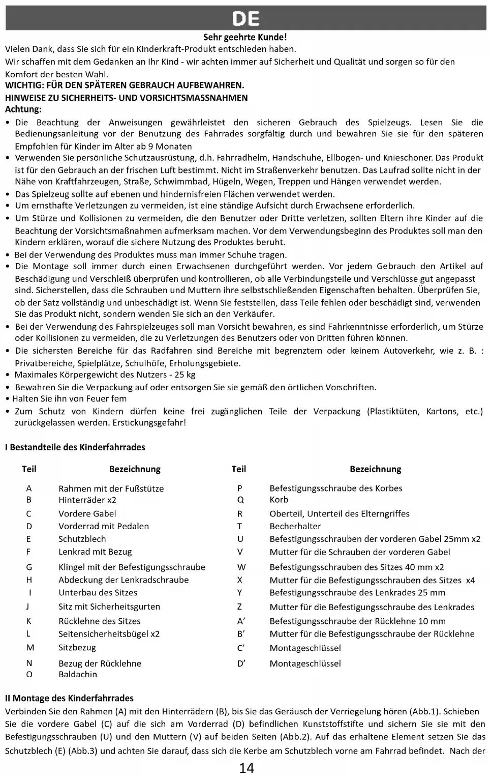- Die Beachtung der Anweisungen gewährleistet den sicheren Gebrauch des Spielzeugs. Lesen Sie die Bedienungsanleitung vor der Benutzung des Fahrrades sorgfältig durch und bewahren Sie sie für den späteren Empfohlen für Kinder im Alter ab 9 Monaten