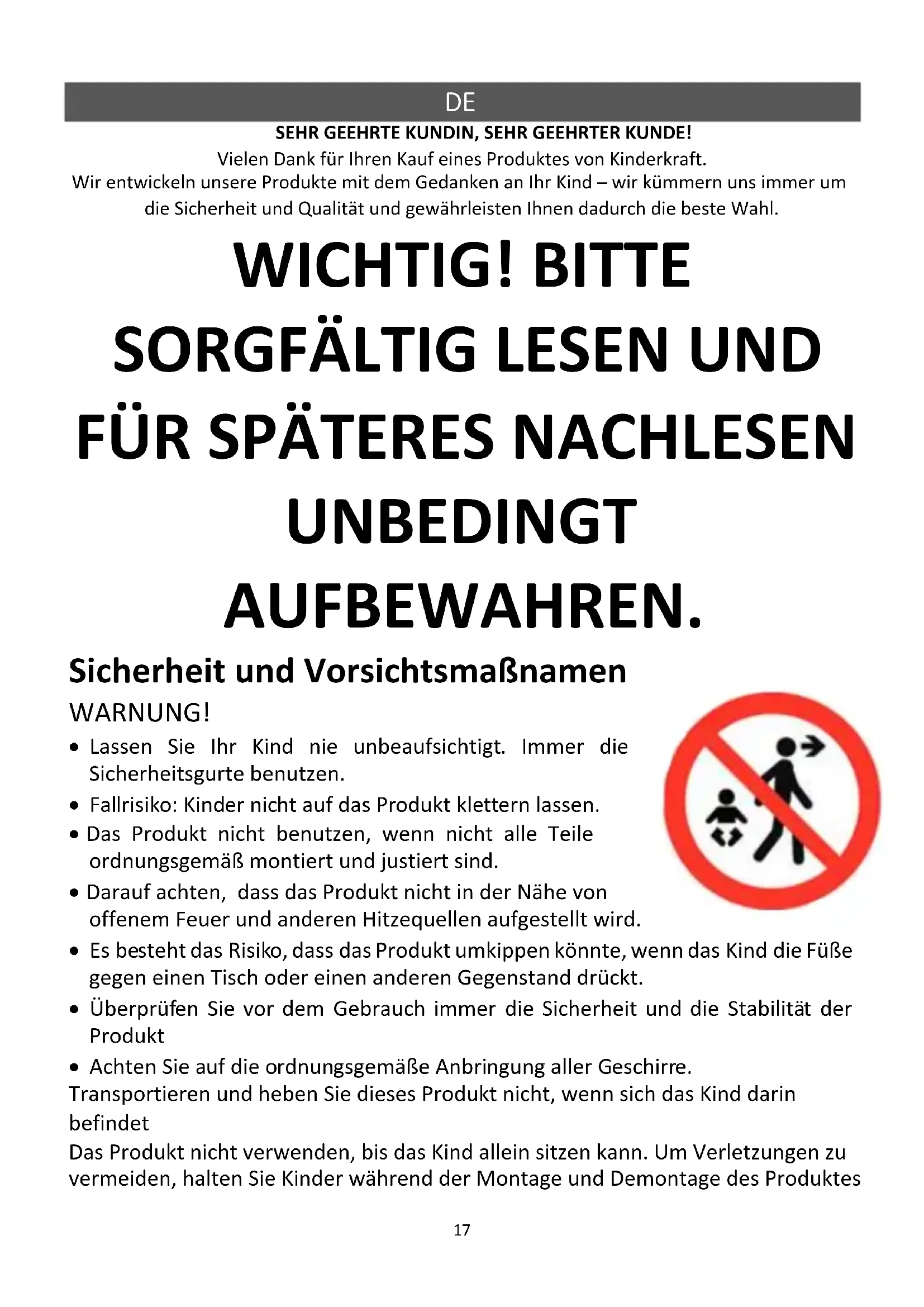 SEHR GEEHRTE KUNDIN, SEHR GEEHRTER KUNDE! Vielen Dank für Ihren Kauf eines Produktes von Kinderkraft. Wir entwickeln unsere Produkte mit dem Gedanken an Ihr Kind – wir kümmern uns immer um die Sicherheit und Qualität und gewährleisten Ihnen dadurch die beste Wahl. WICHTIG! BITTE